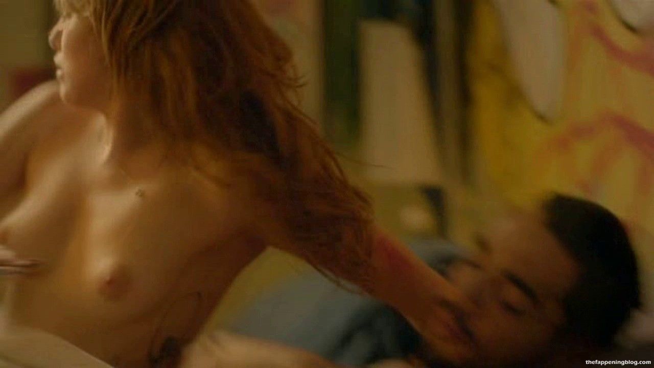 Letícia Colin is naked while having sex with a guy on a bed, riding him in his lap while wrapping her arms around him. She then leans back, and we see her bare breasts.