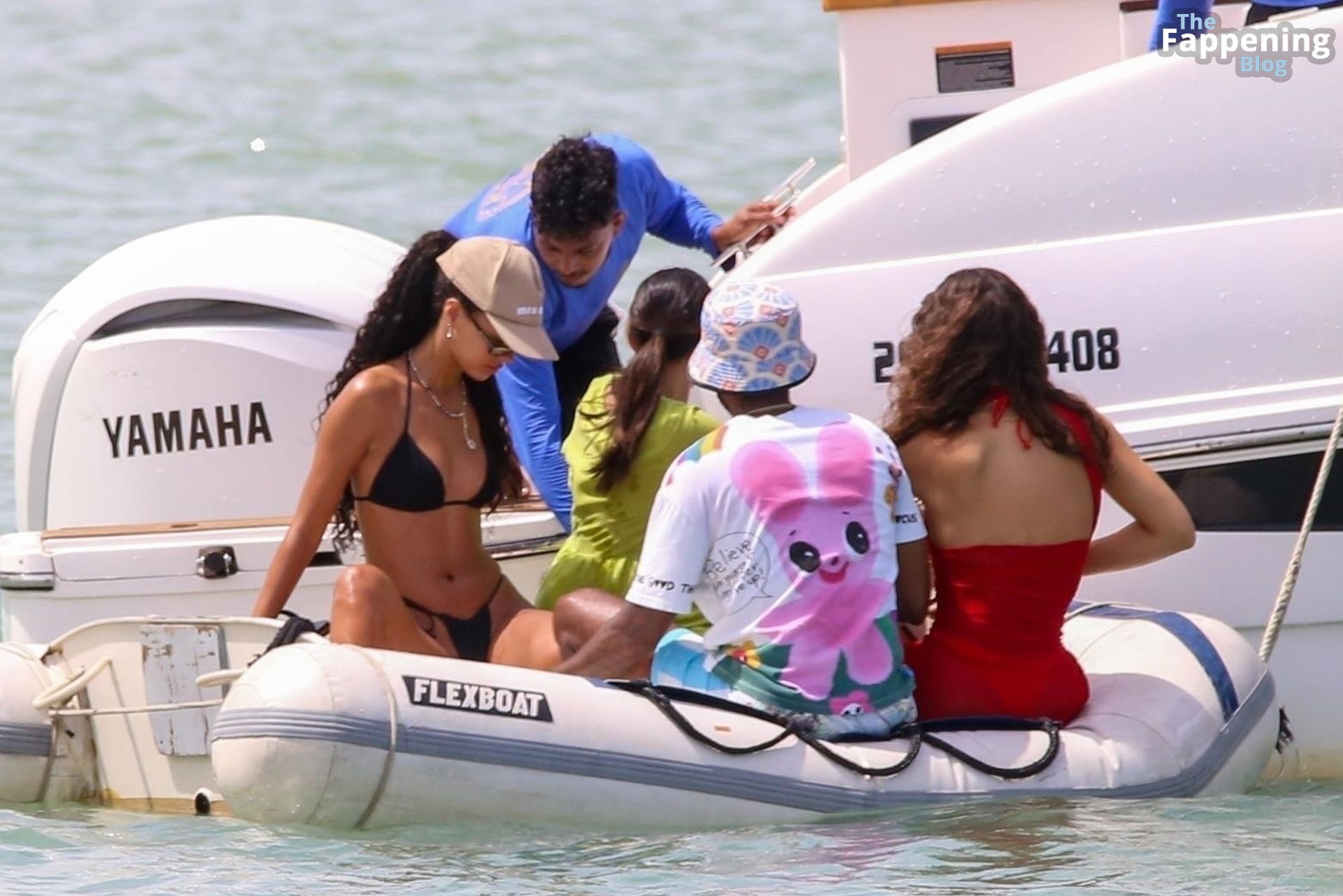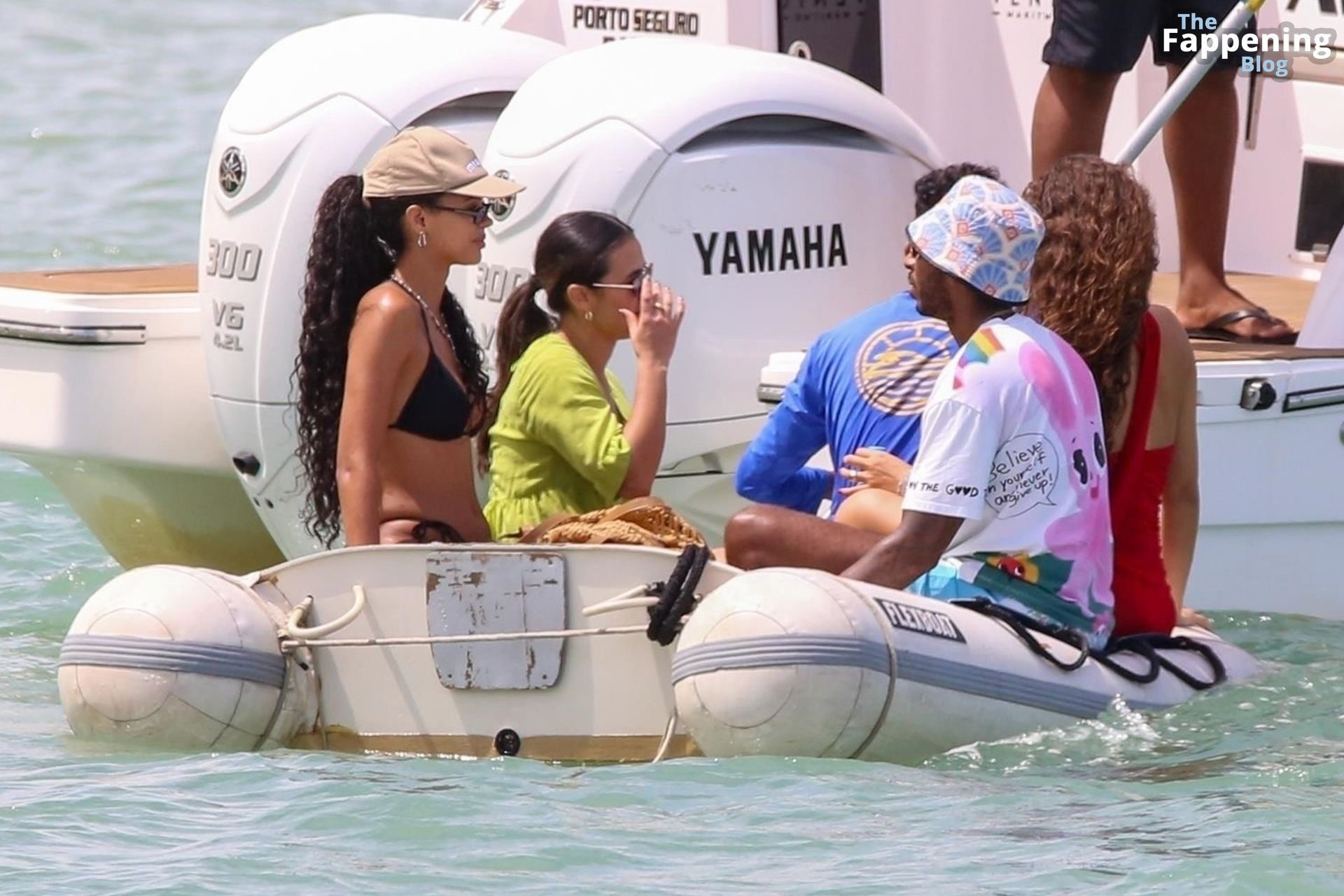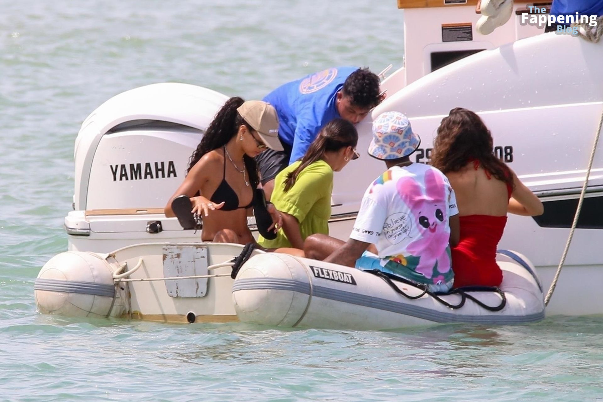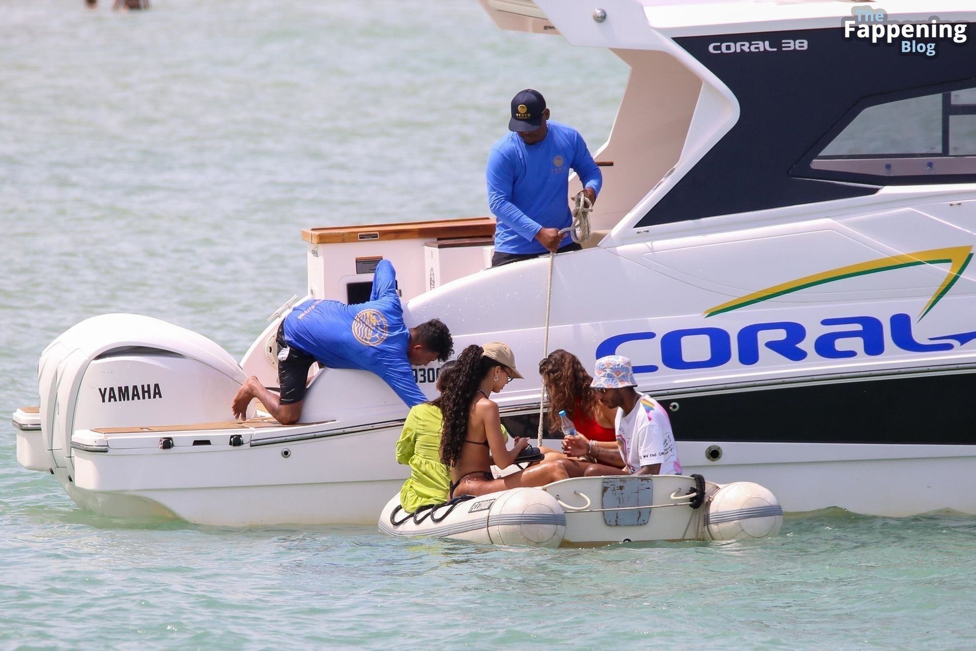 La estrella de la Fórmula Uno Lewis Hamilton y la modelo Juliana Nalu fueron fotografiados con amigos abordando un barco mientras estaban de vacaciones en Trancoso, Brasil, 01/01/2024.