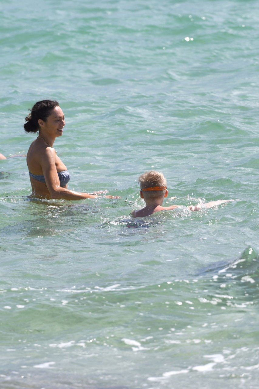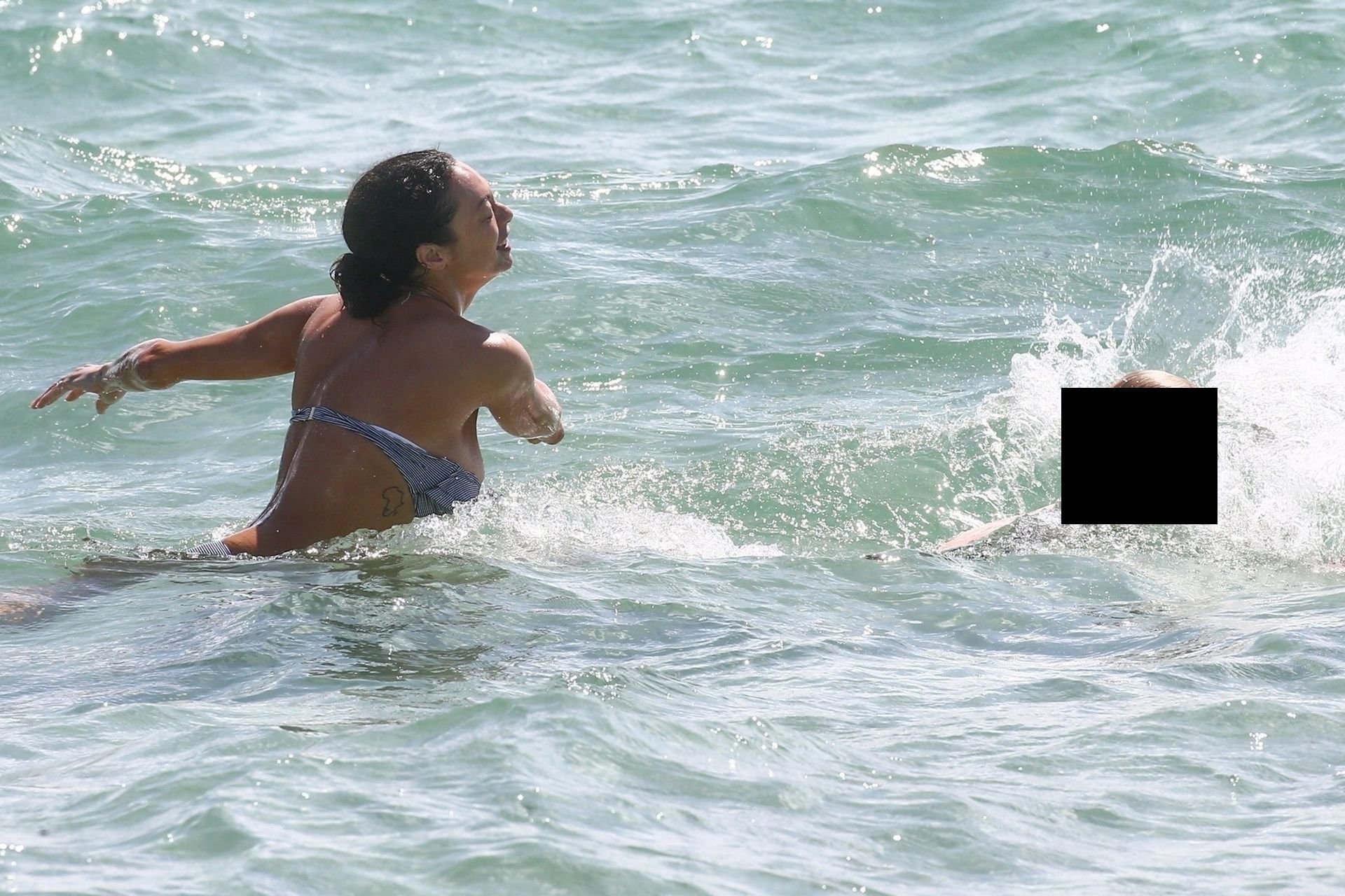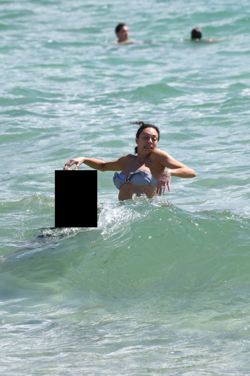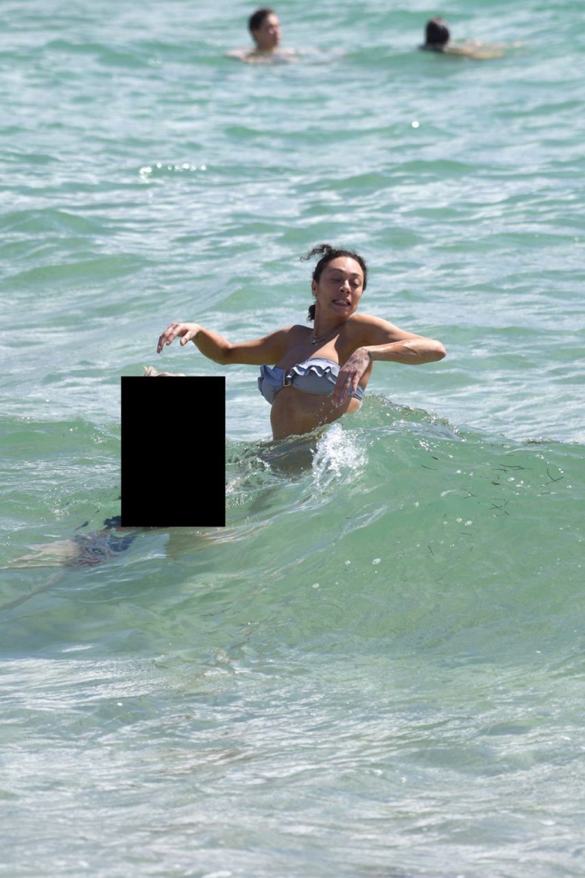 Recientemente soltera, Lilly Becker tiene un gran fallo de vestuario con un top de bikini prohibido mientras surfea las olas en Miami, 12/04/2019.