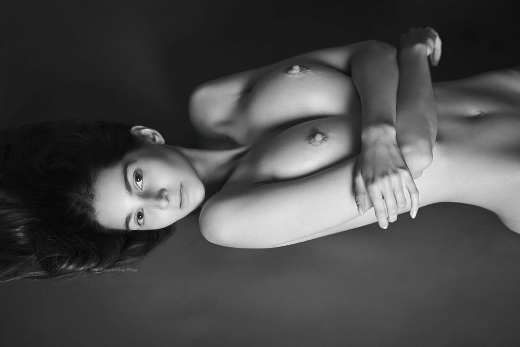 Hermosa modelo Lina Lorenza (Aschermann) posa completamente desnuda, mostrando su impresionante cuerpo desnudo en colores rojo y púrpura en una sesión fotográfica de Francesco Rizzato (2020).