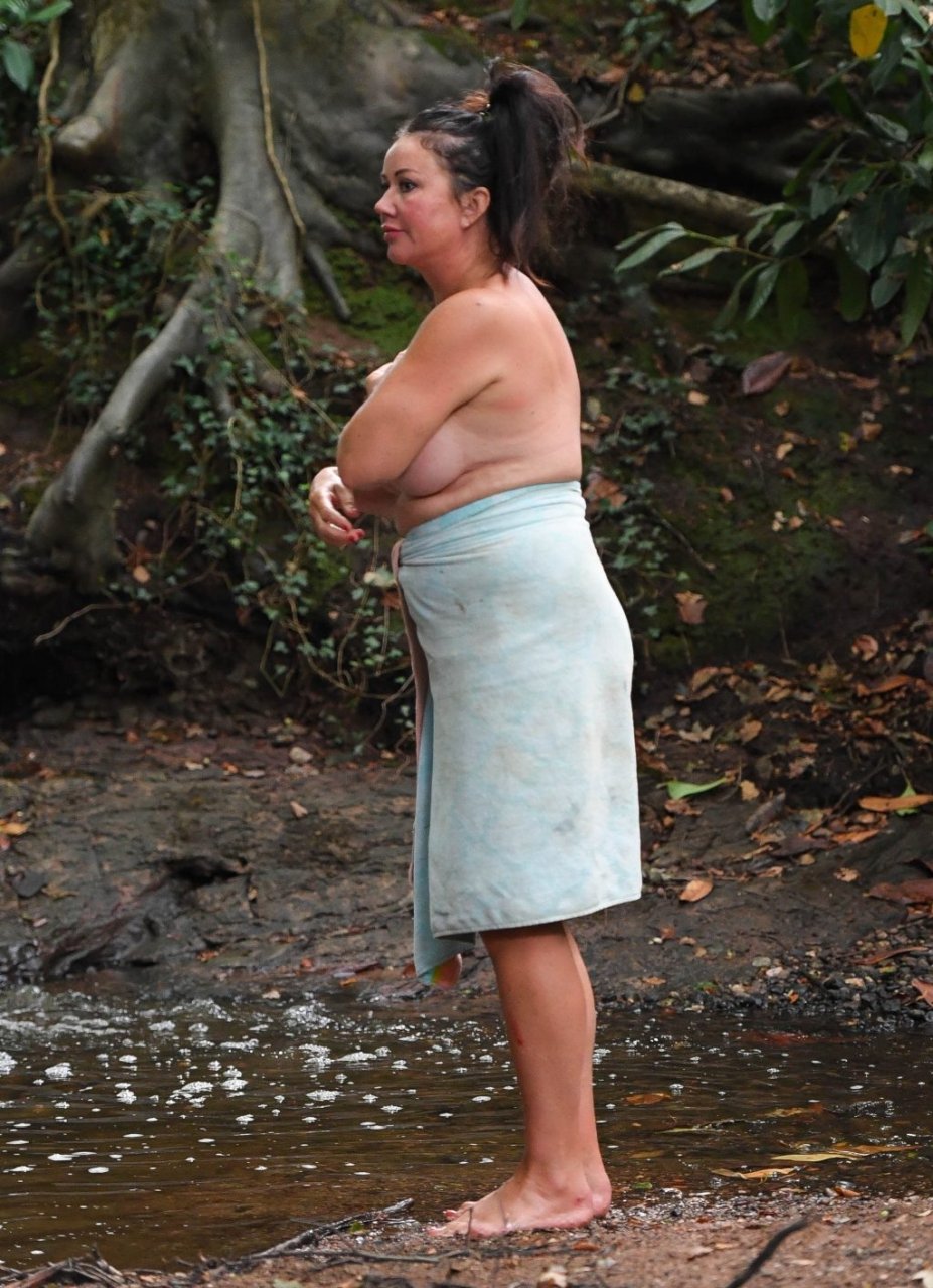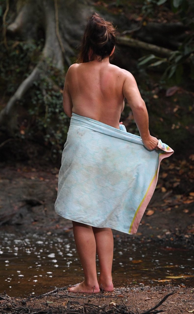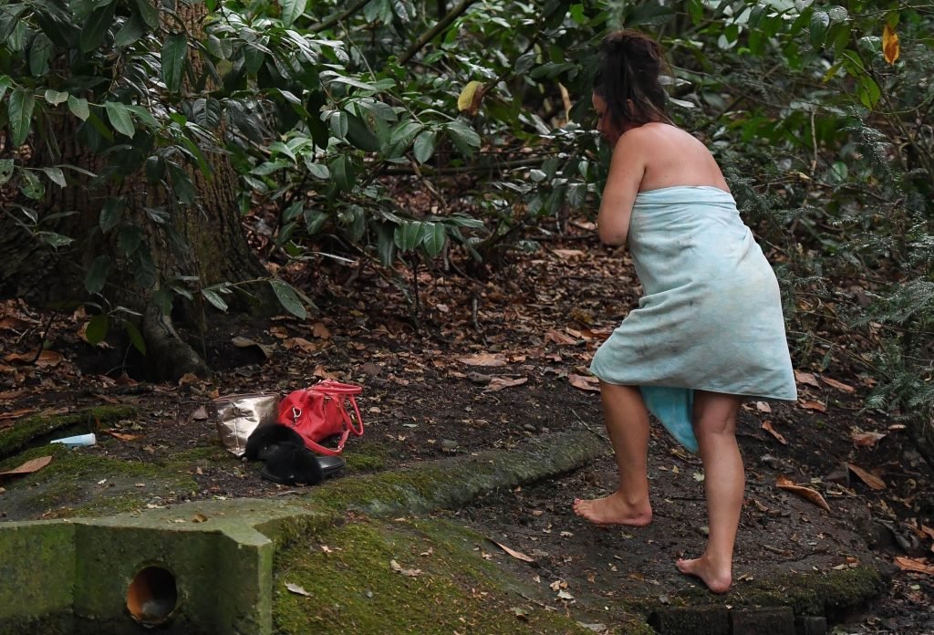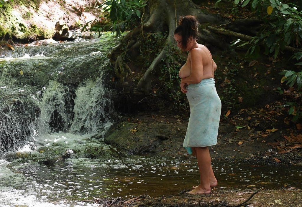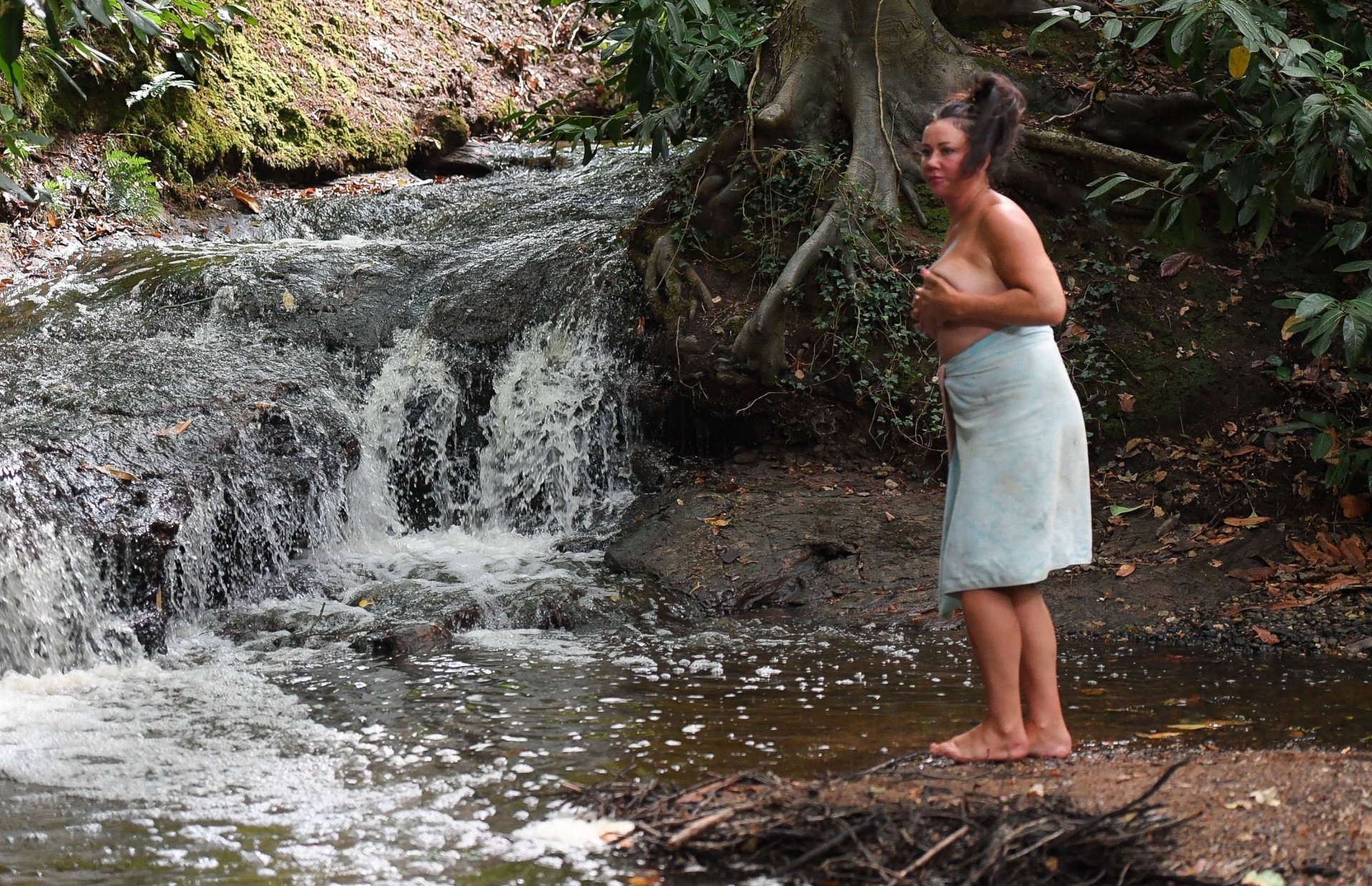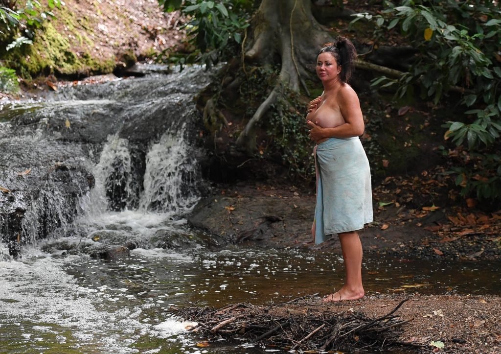 La personalidad de la televisión de realidad Lisa Appleton (50) se estaba lavando en un arroyo junto a su casa en el árbol en Shropshire, donde ahora vive tras pasar por tiempos difíciles, 30/08/2018.