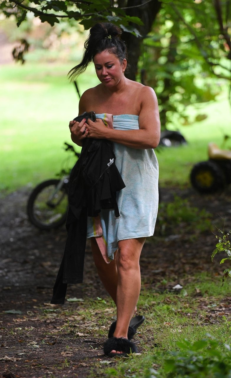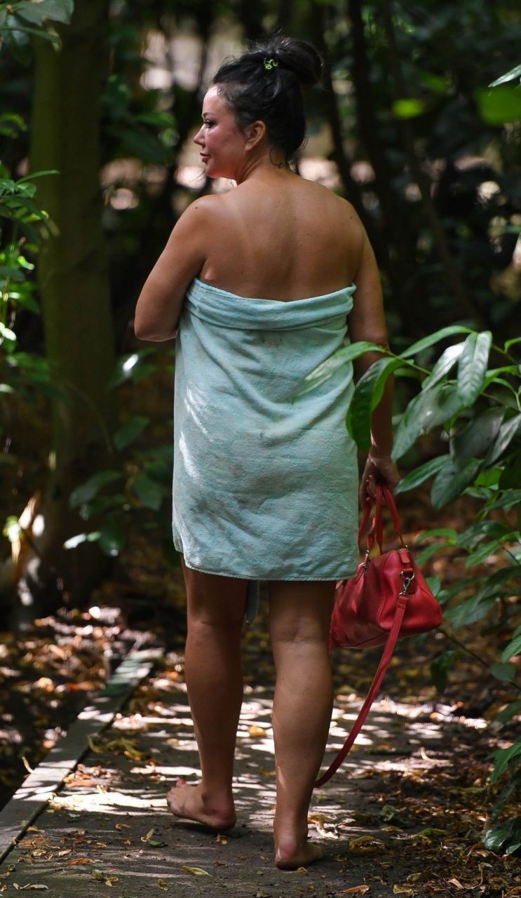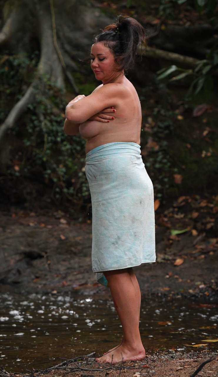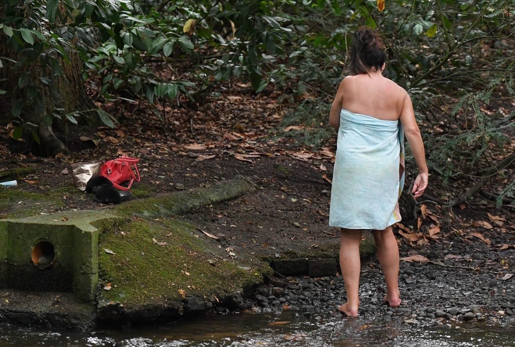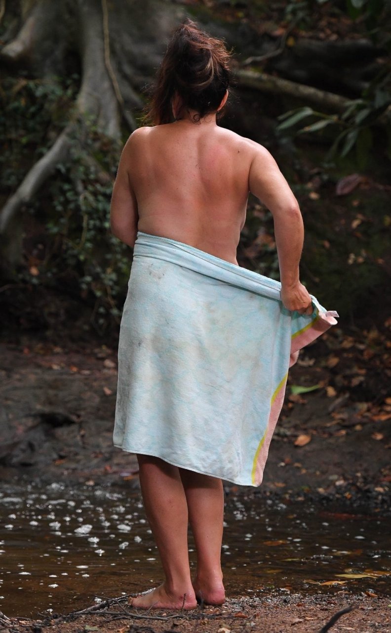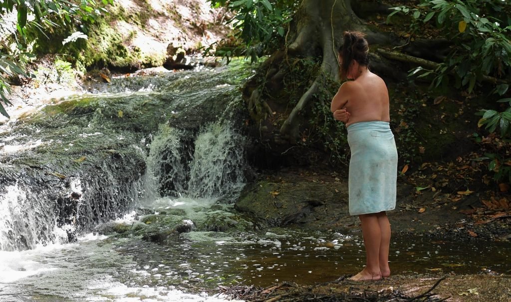 La personalidad de la televisión de realidad Lisa Appleton (50) se estaba lavando en un arroyo junto a su casa en el árbol en Shropshire, donde ahora vive tras pasar por tiempos difíciles, 30/08/2018.