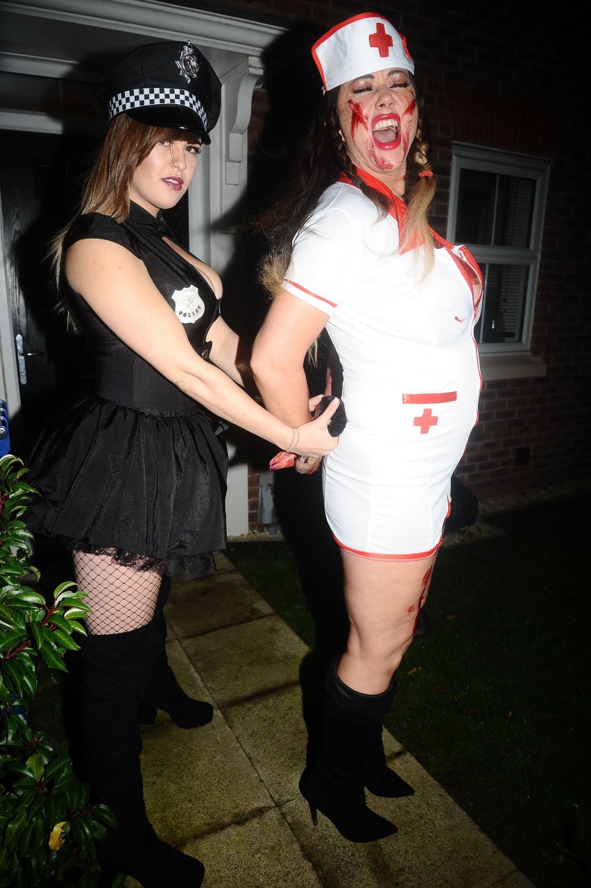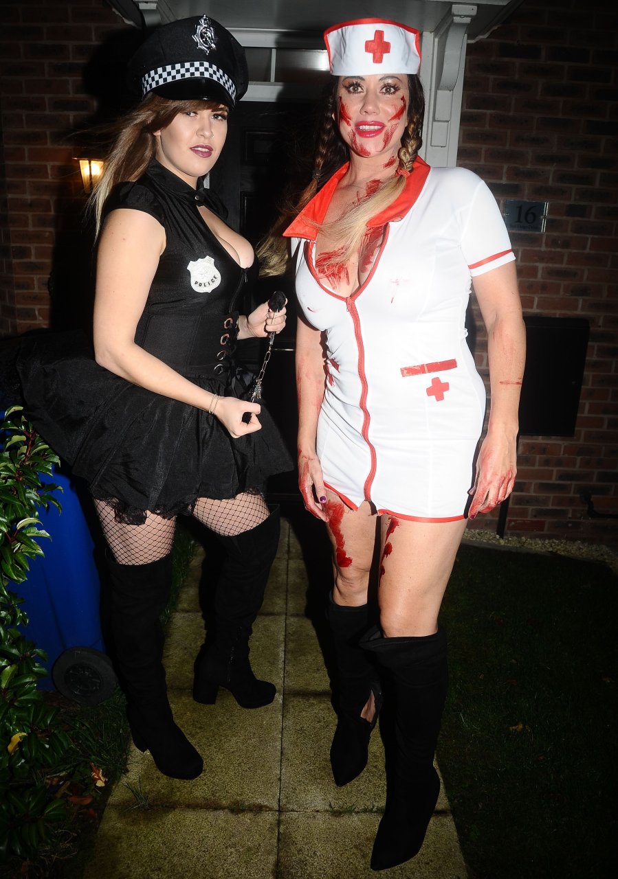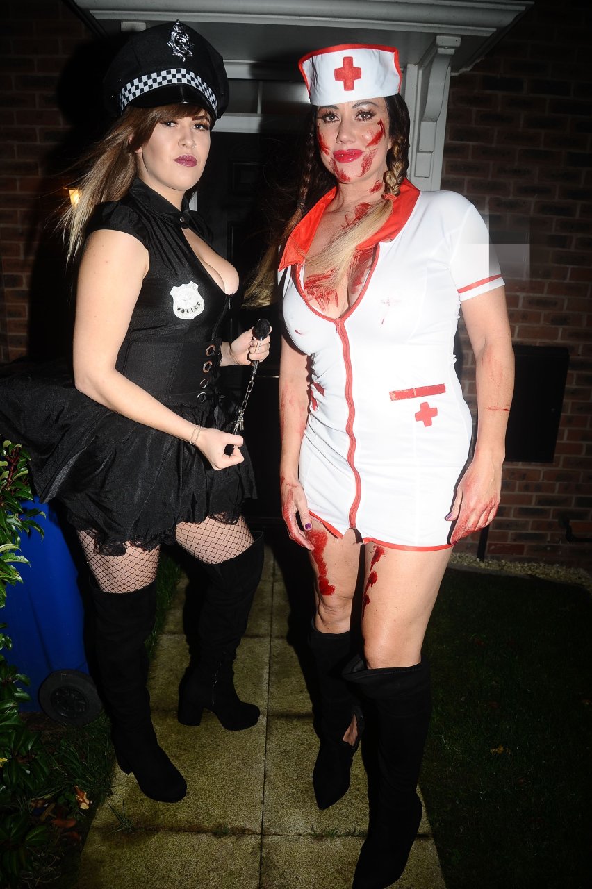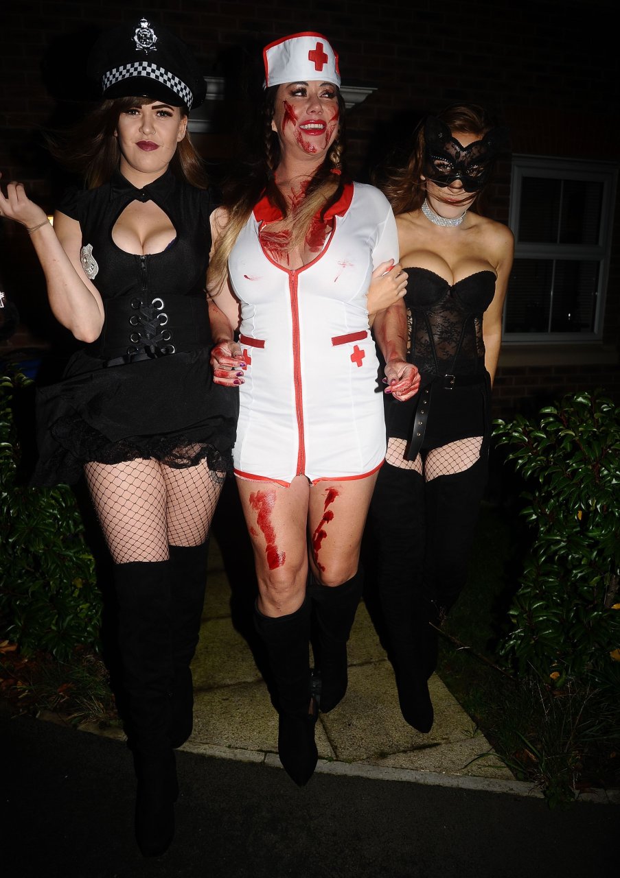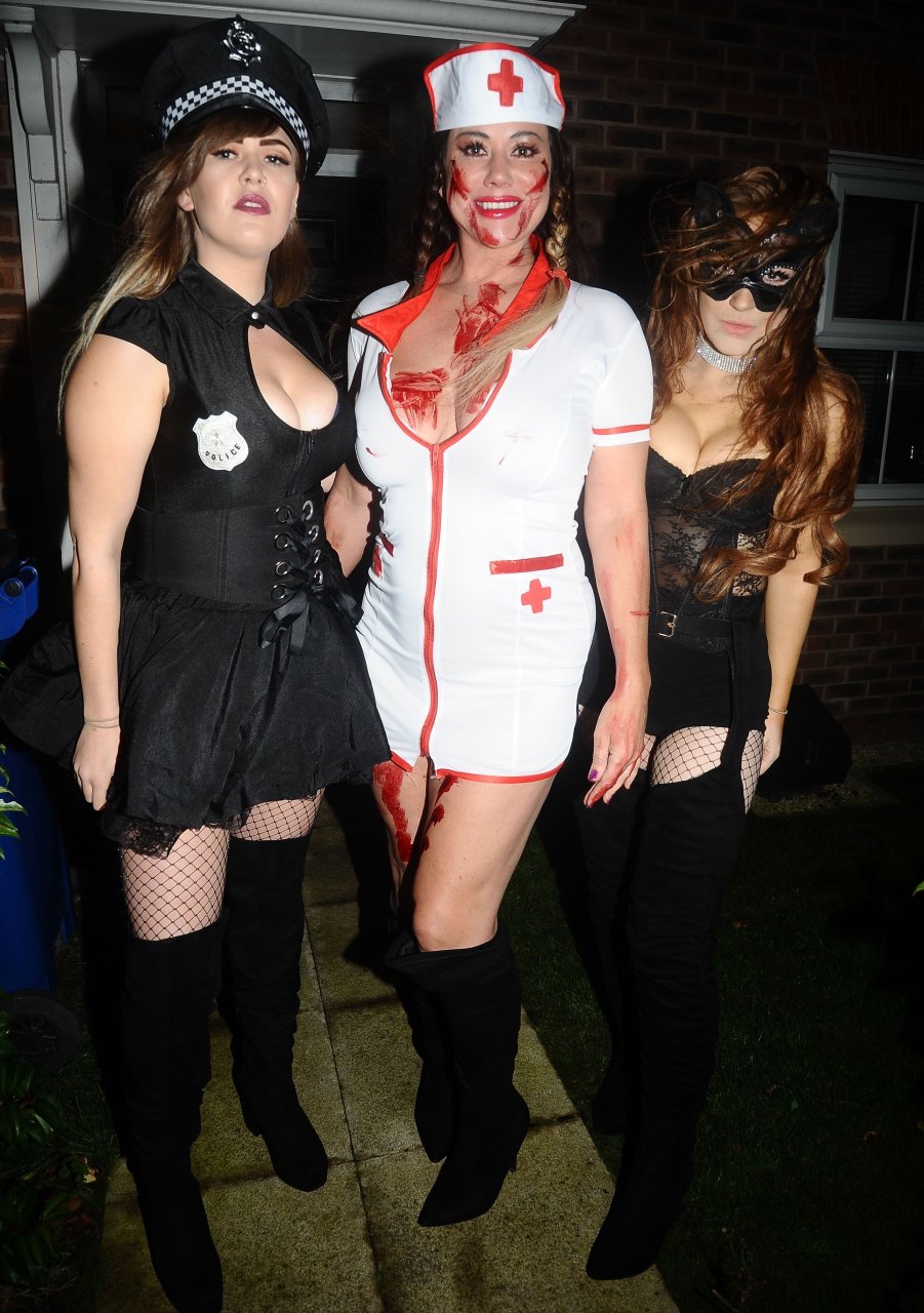 Lisa Appleton lleva un disfraz de enfermera sangrienta y muestra sus grandes pechos mientras asiste a una fiesta de Halloween con sus amigas con busto en Manchester, 28/10/2017. Lisa Appleton es una estrella británica de la televisión de realidad. Edad – 49 años (23 de mayo de 1968).