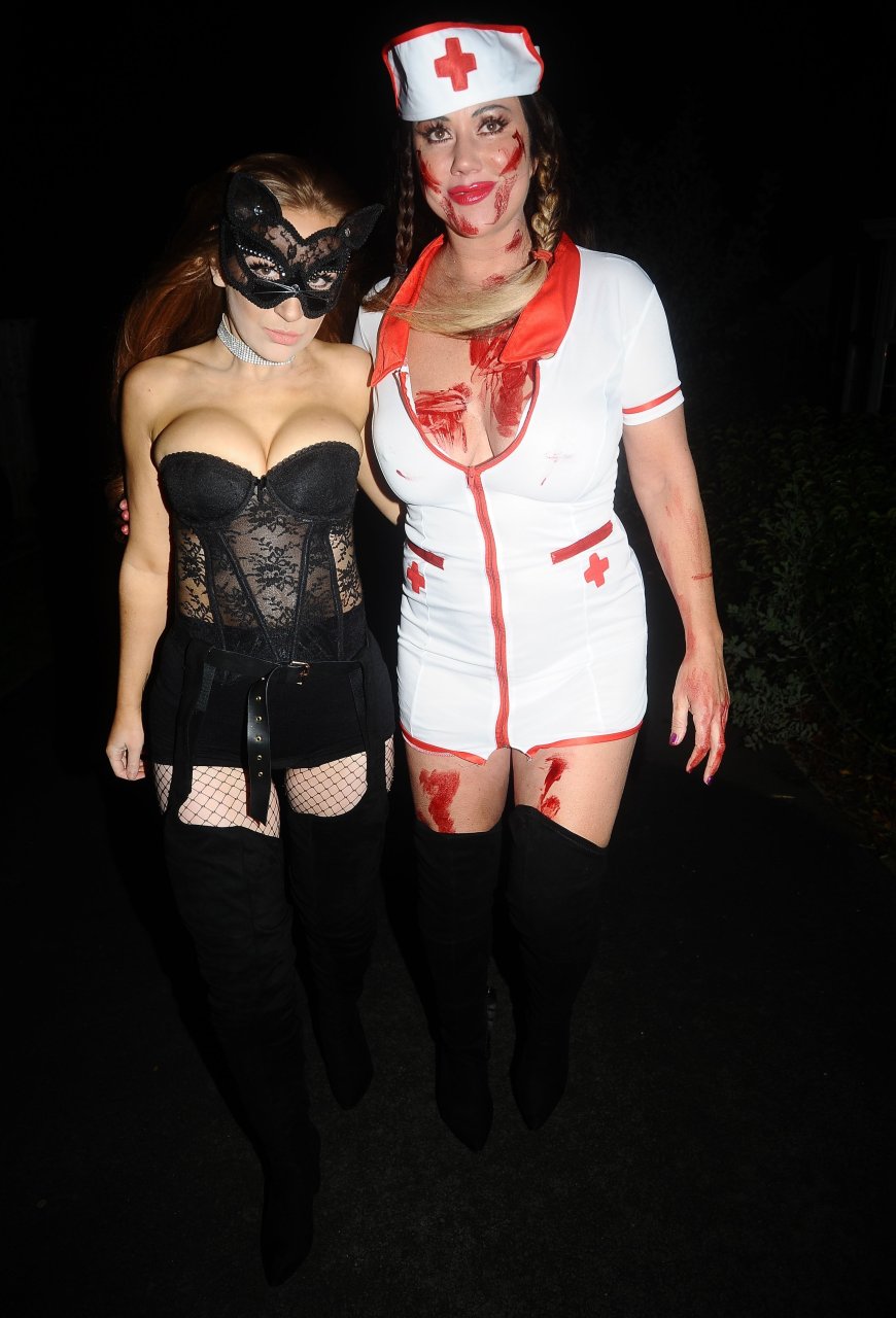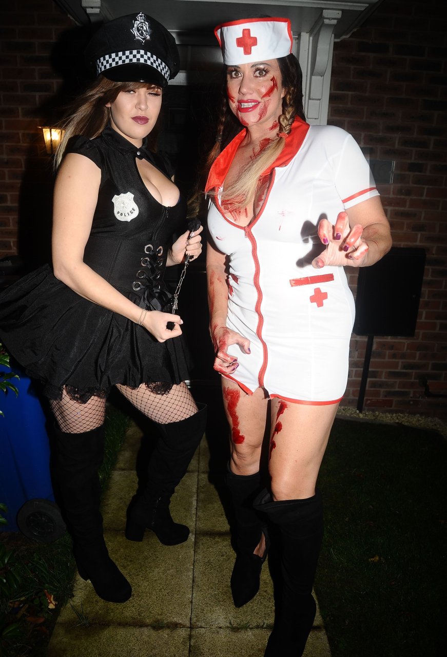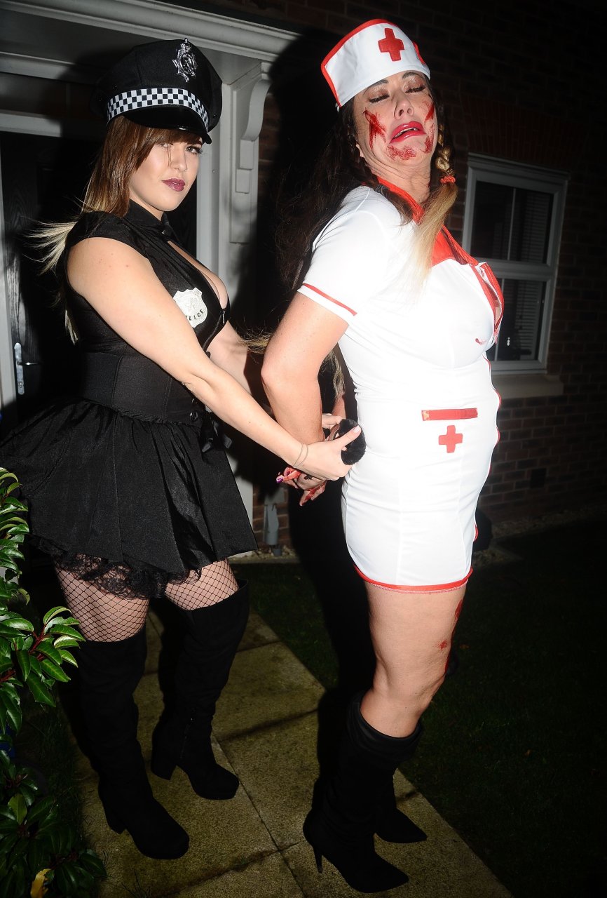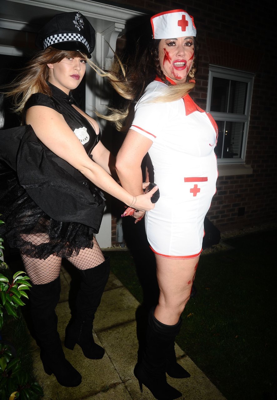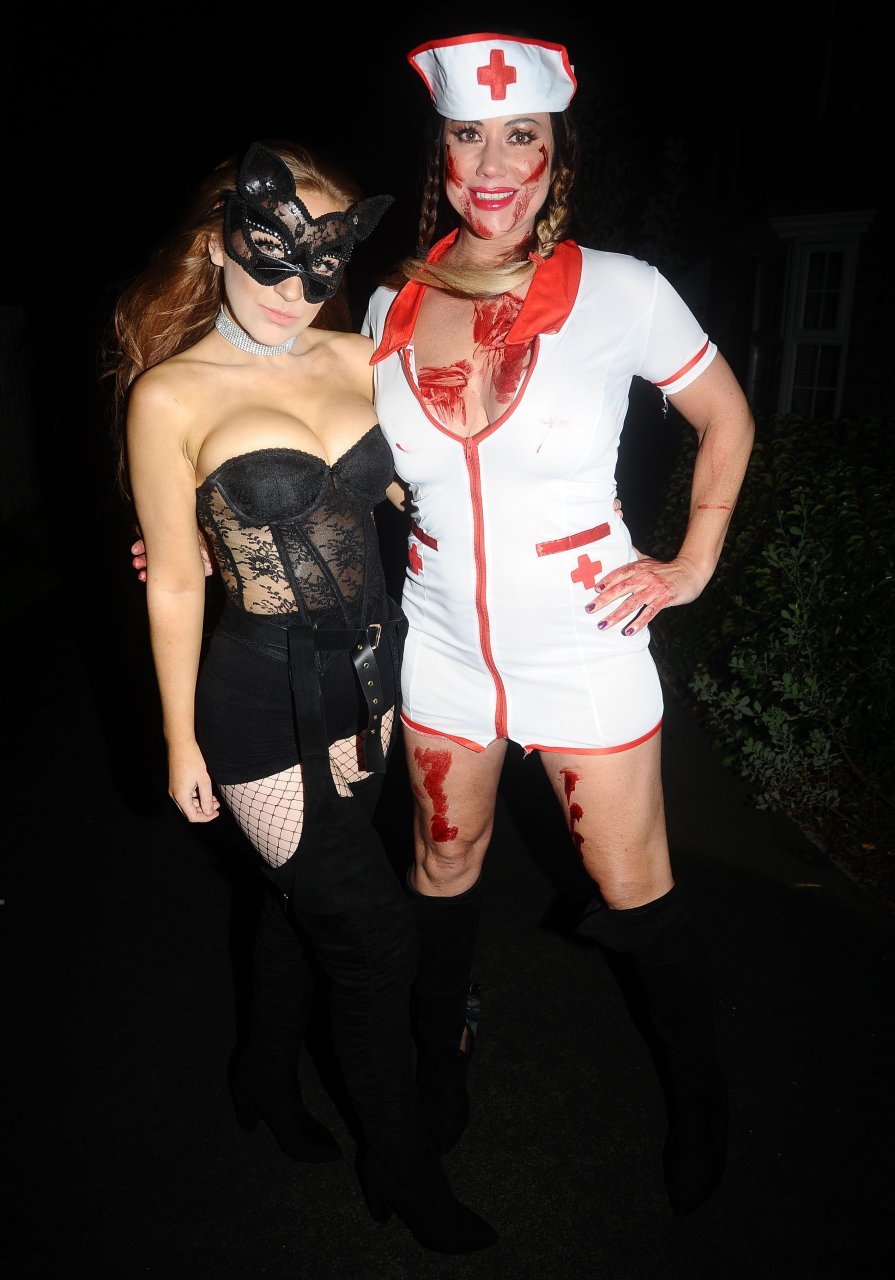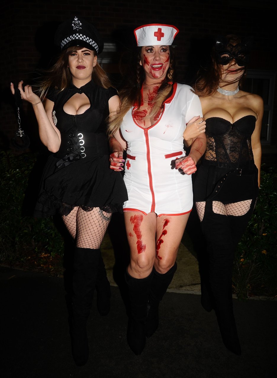 Lisa Appleton lleva un disfraz de enfermera sangrienta y muestra sus grandes pechos mientras asiste a una fiesta de Halloween con sus amigas con busto en Manchester, 28/10/2017. Lisa Appleton es una estrella británica de la televisión de realidad. Edad – 49 años (23 de mayo de 1968).