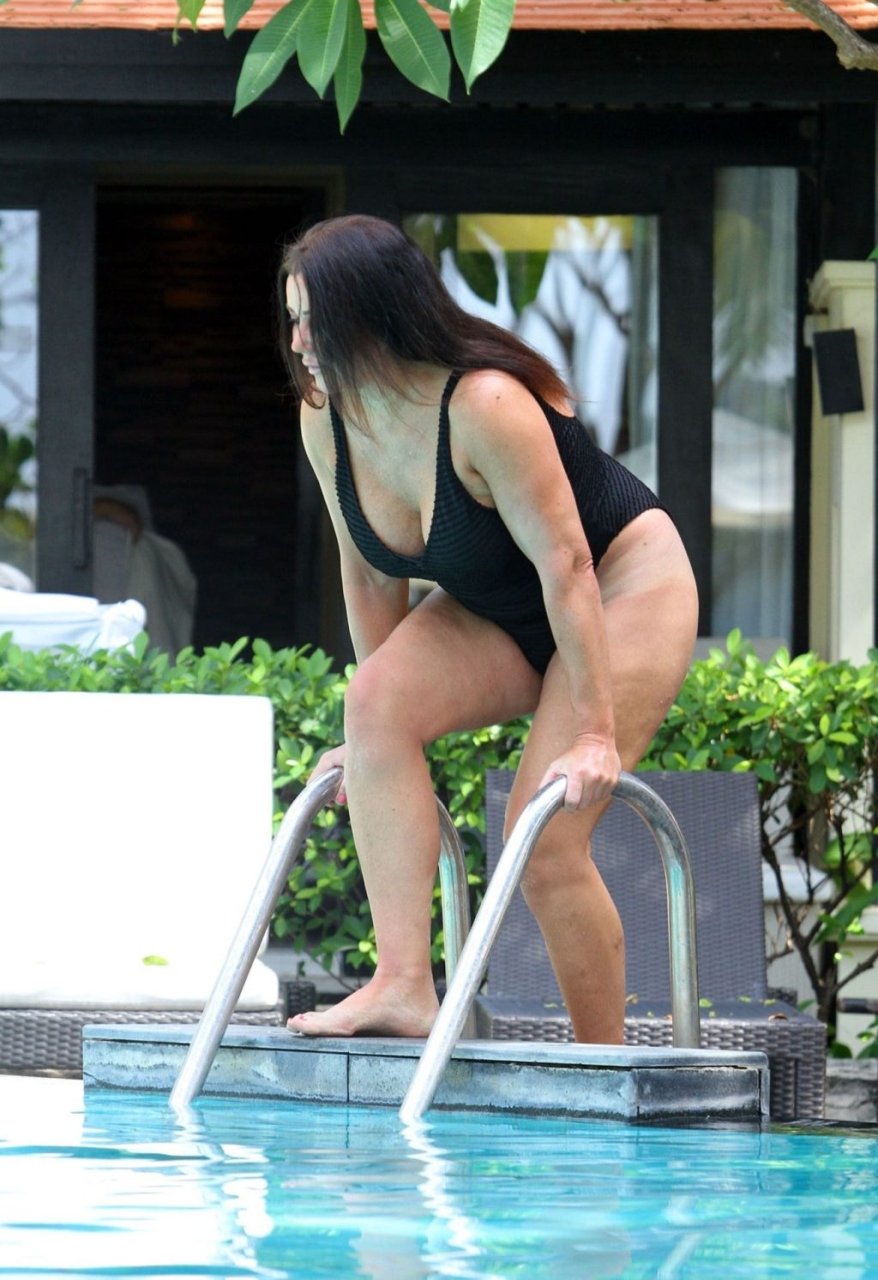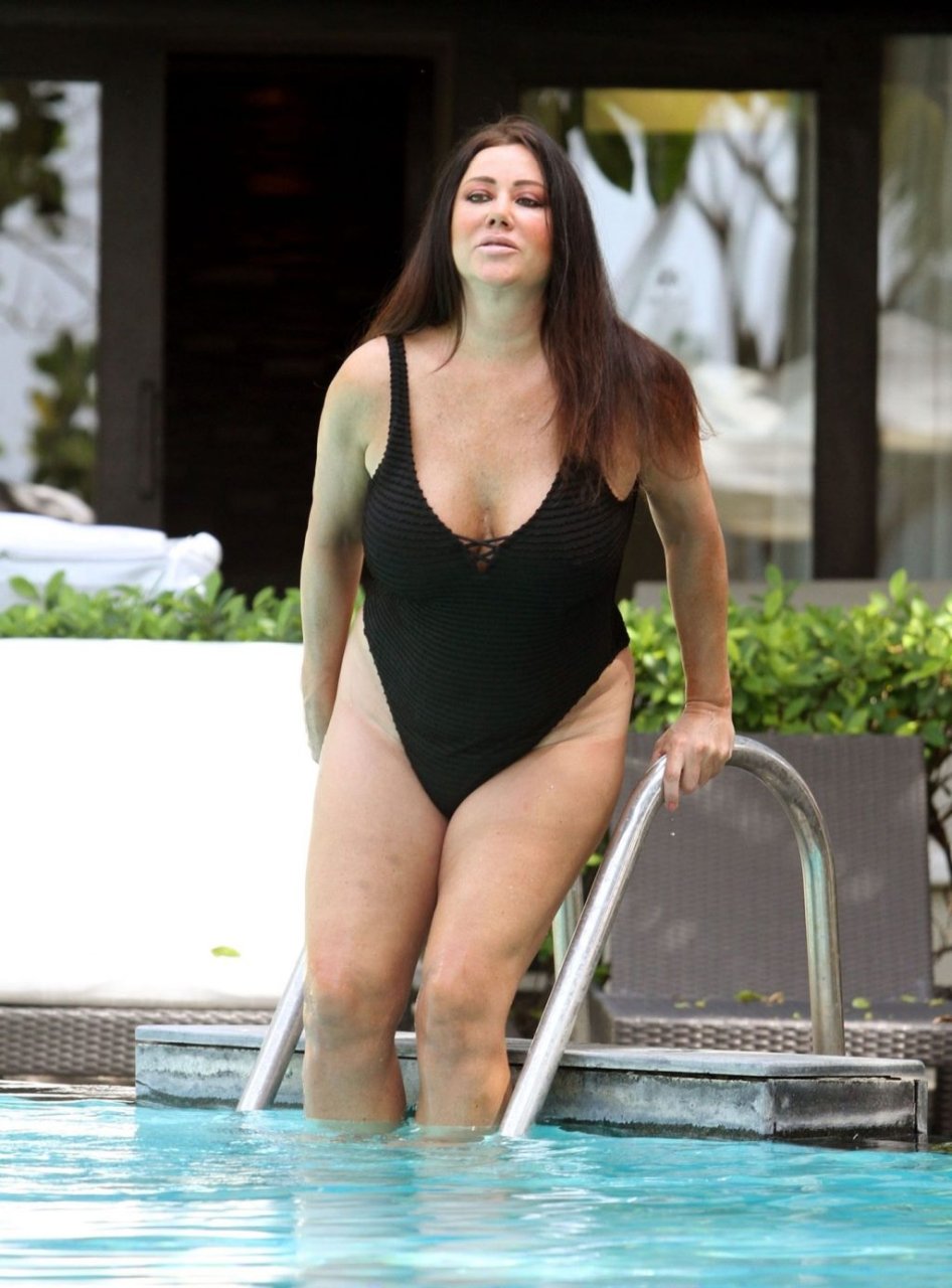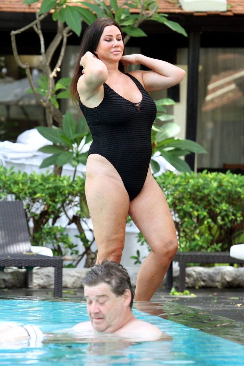 Chillando junto a la piscina de su lujoso resort en el hotel Impiana en Patong, la ex estrella de “Big Brother” Lisa Appleton llevaba un sexy traje de baño negro mientras estaba en modo vacaciones en el lejano oriente y recuperándose de un lifting facial y de párpados de £1,200, junto con liposucción en su estómago, mentón y cuello.