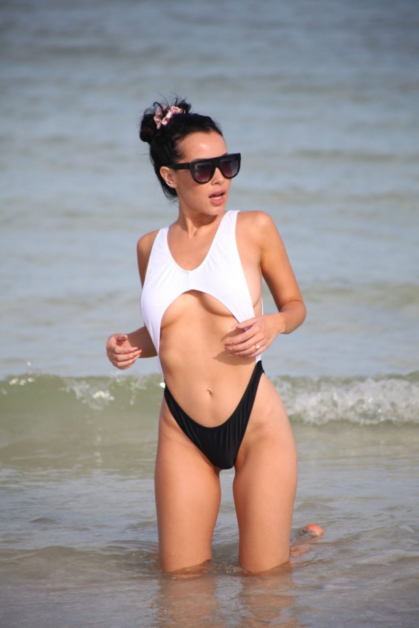 Ex reina de belleza convertida en diseñadora de bikinis y bloguera de moda, Lisa Opie sorprendió a los visitantes de la playa con su traje de baño de una sola pieza casi inexistente. La estrella tonificada se tomó muchas selfies mientras disfrutaba del sol y las olas en la playa en Miami, 11/09/2018.