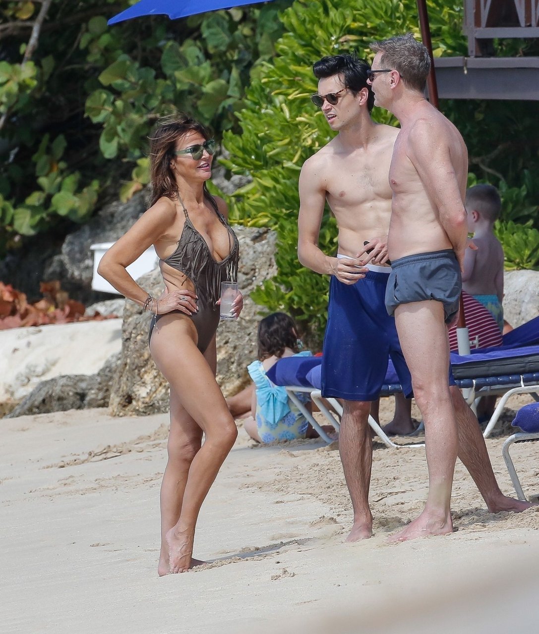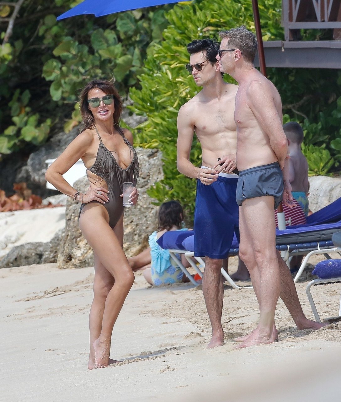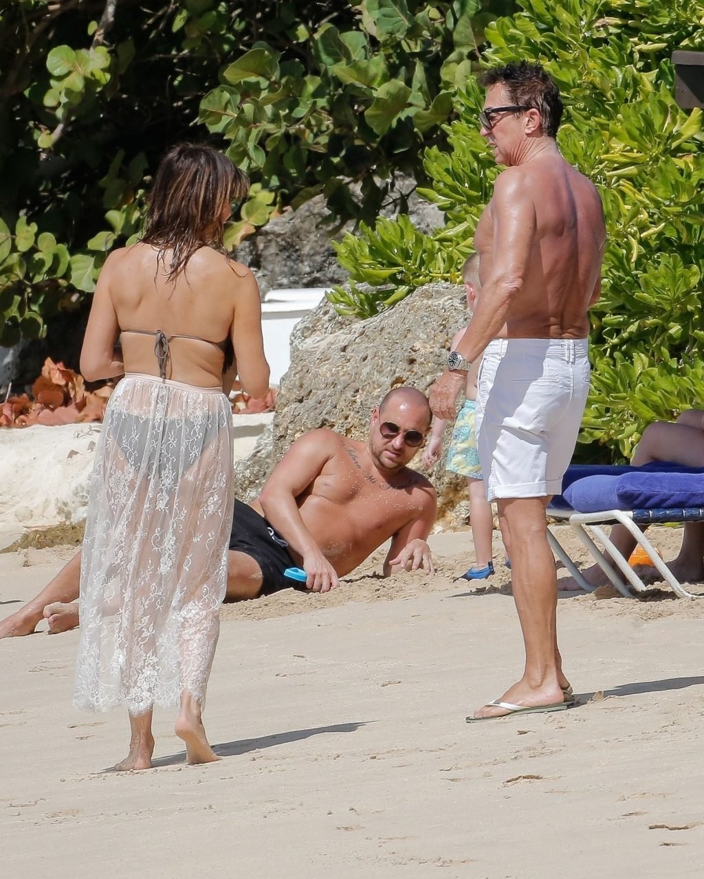 El bailarín Bruno Tonioli es visto con Liz Cundy en la playa durante sus vacaciones en Barbados, 30/12/2018. La estrella de la televisión inglesa tuvo un pequeño fallo de vestuario mientras nadaba.
