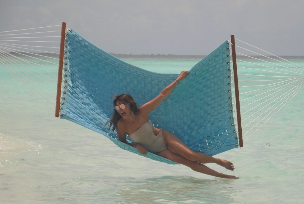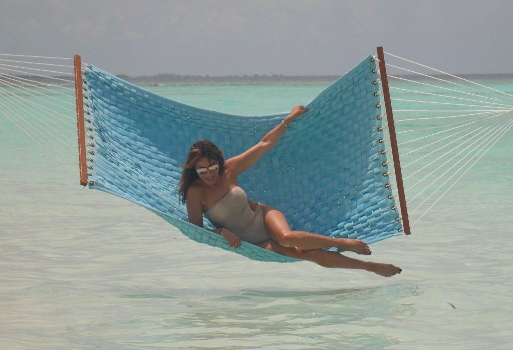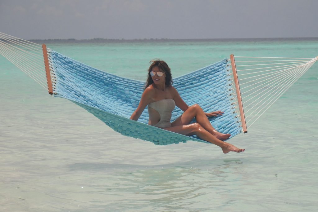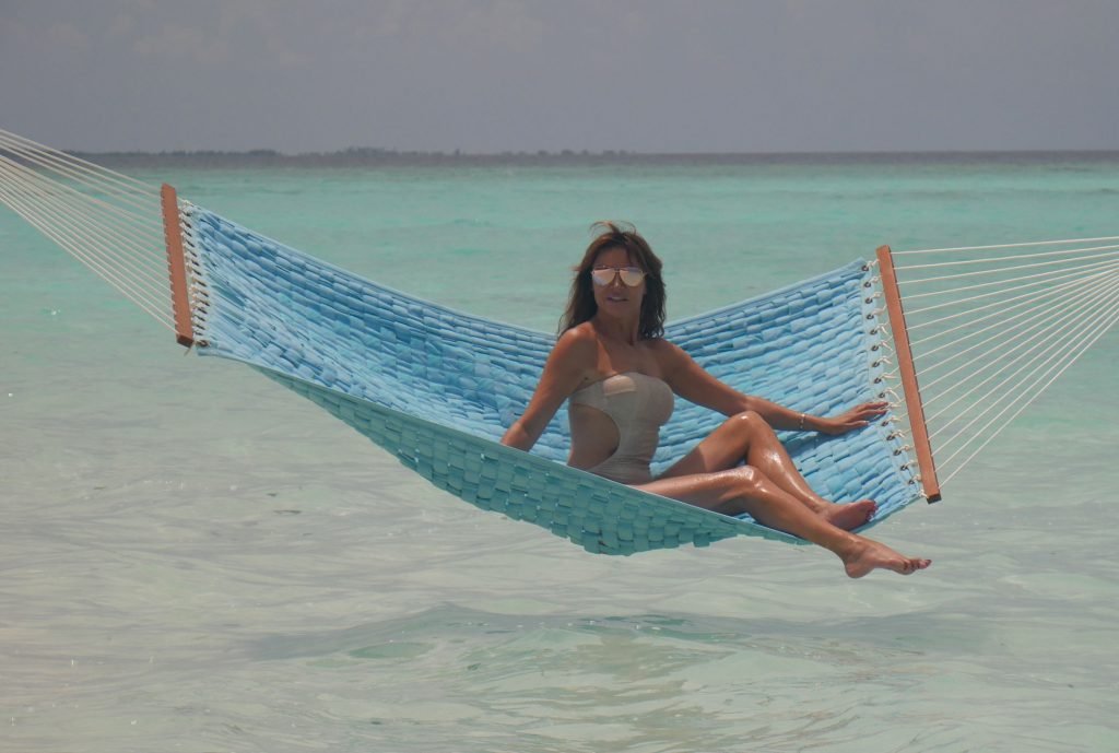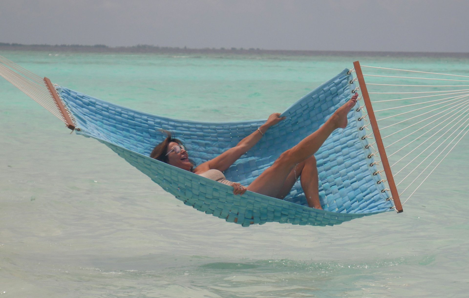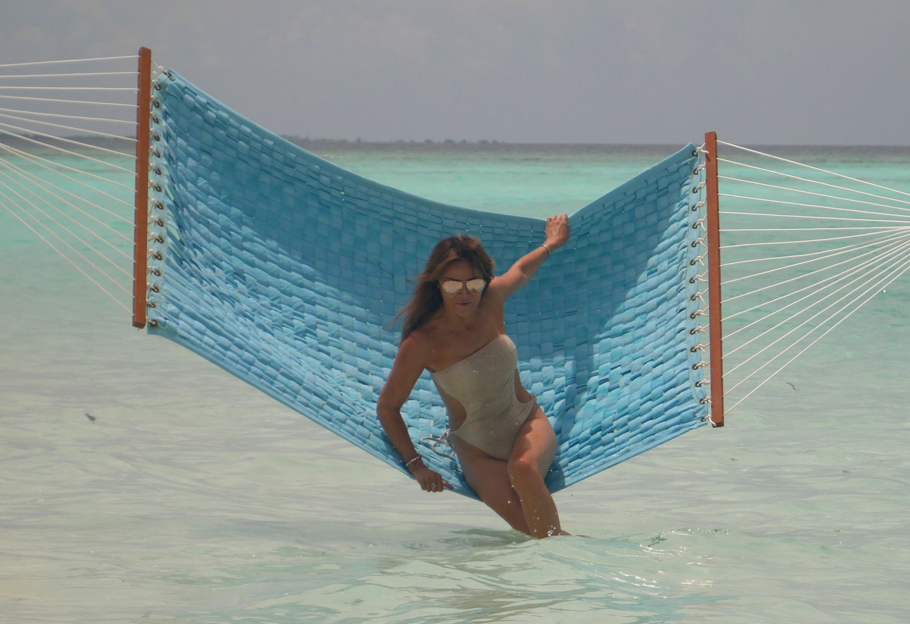 Lizzie Cundy (48) presenta el Festival Internacional de Cine en Sun Siyam Iru Fushi, Maldivas. Ella logra tomar un poco de tiempo para relajarse en una hamaca sobre el mar, 09/08/2018.