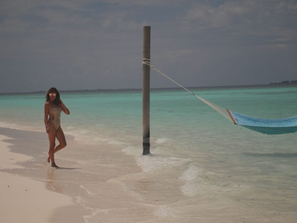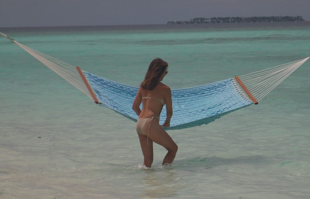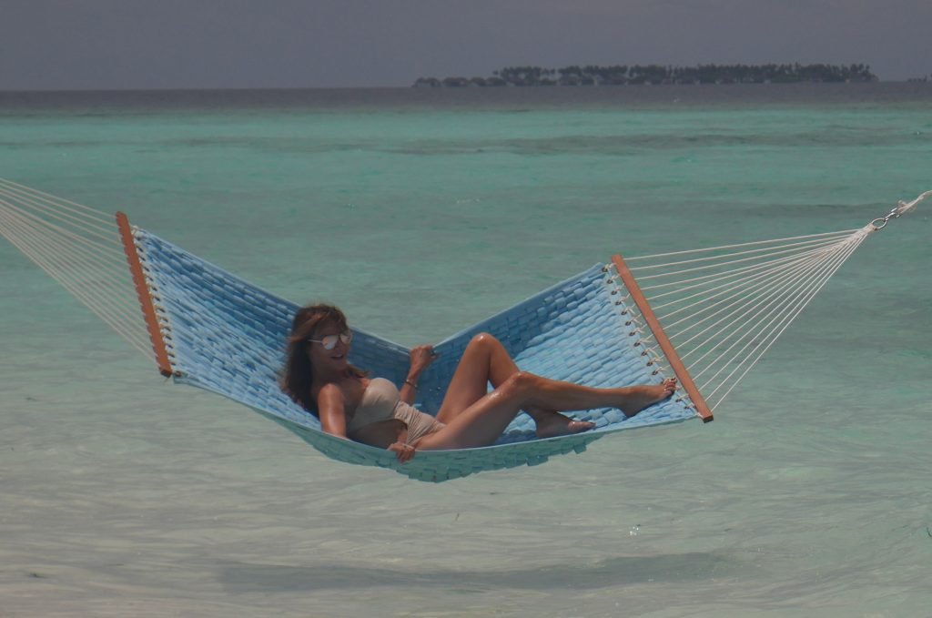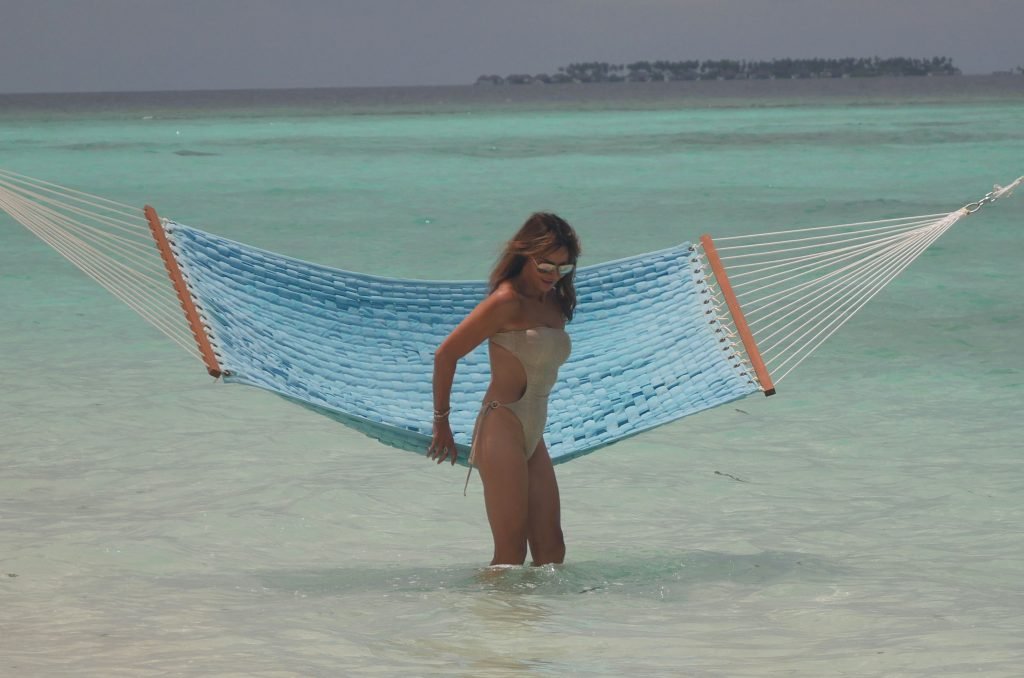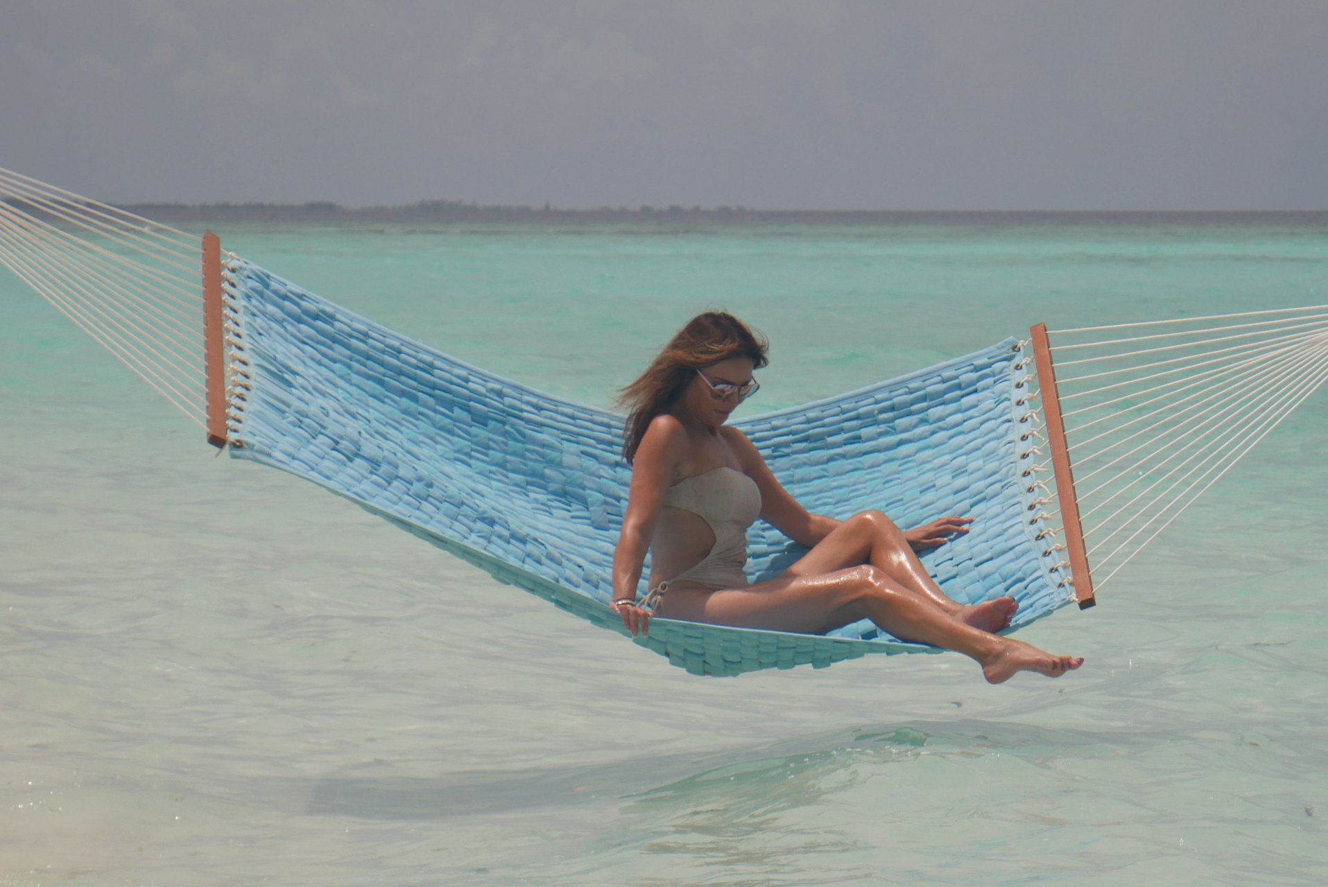 Lizzie Cundy (48) presenta el Festival Internacional de Cine en Sun Siyam Iru Fushi, Maldivas. Ella logra tomar un poco de tiempo para relajarse en una hamaca sobre el mar, 09/08/2018.