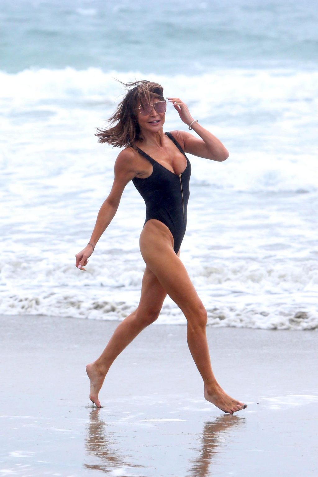 ¡Británicos en el extranjero! Lizzie Cundy no deja que una tormenta le impida ir a la playa en Los Ángeles, California, 27/11/2019. La estrella británica de la televisión fue vista usando un sexy traje de baño negro con una cremallera al frente y gafas de sol mientras desafiaba la lluvia para disfrutar un tiempo en la playa.