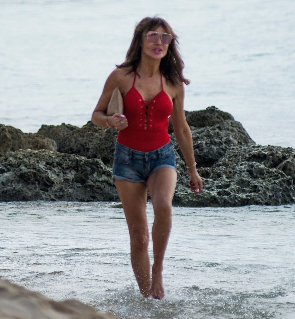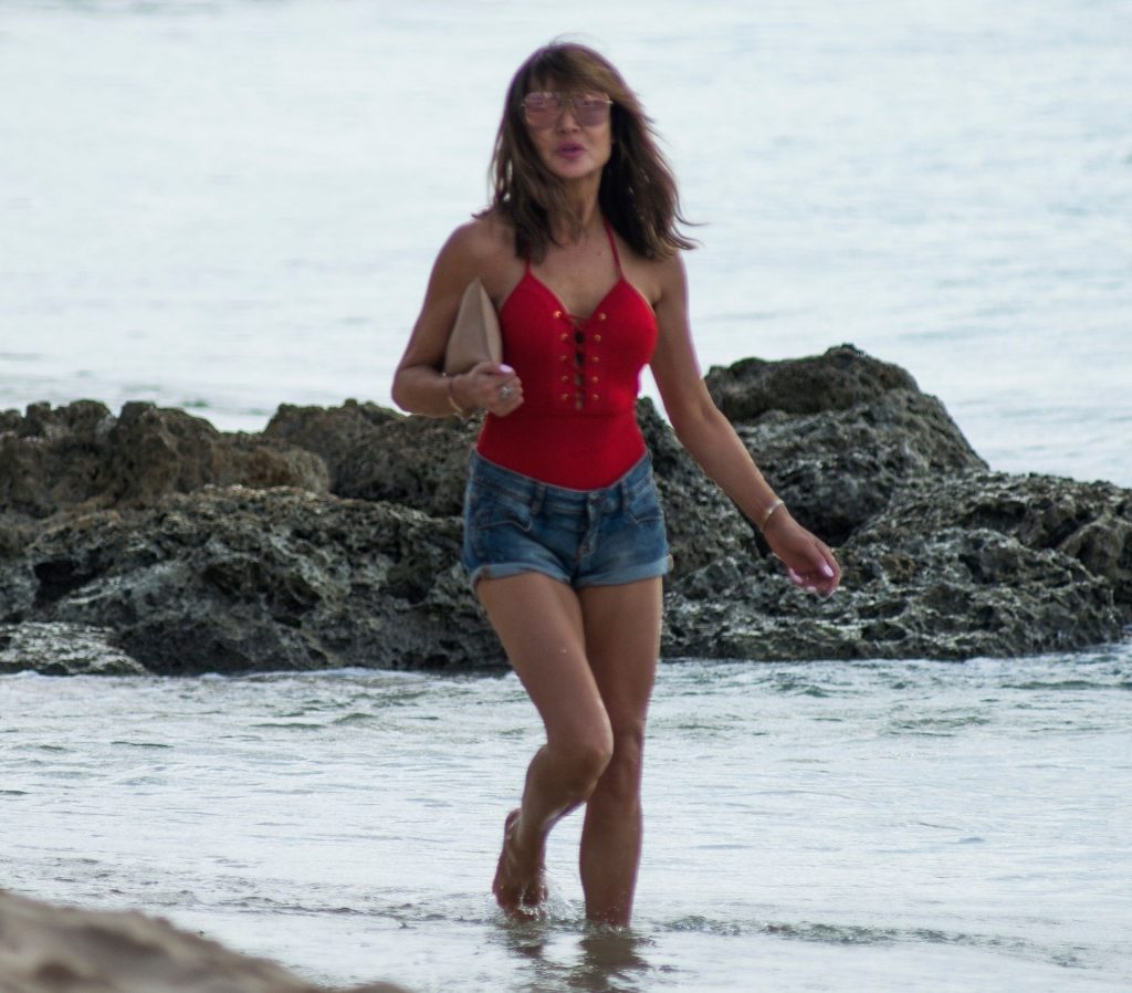 Locutora de radio y personalidad de televisión Lizzie Cundy (49) aparece vestida completamente de rojo con un traje de baño rojo brillante mientras disfruta de un paseo por la playa durante sus vacaciones de invierno en Barbados, 28/12/2019.