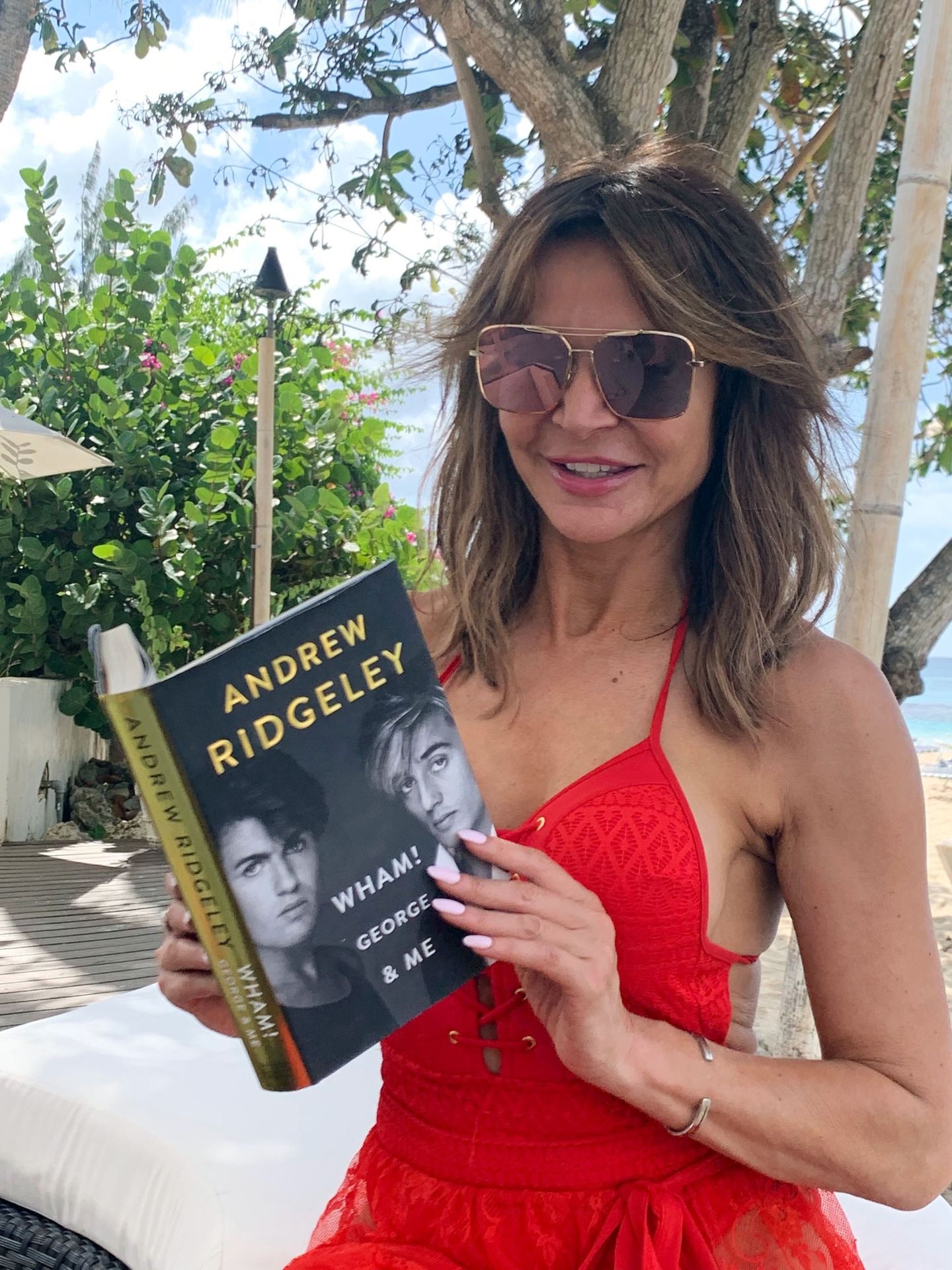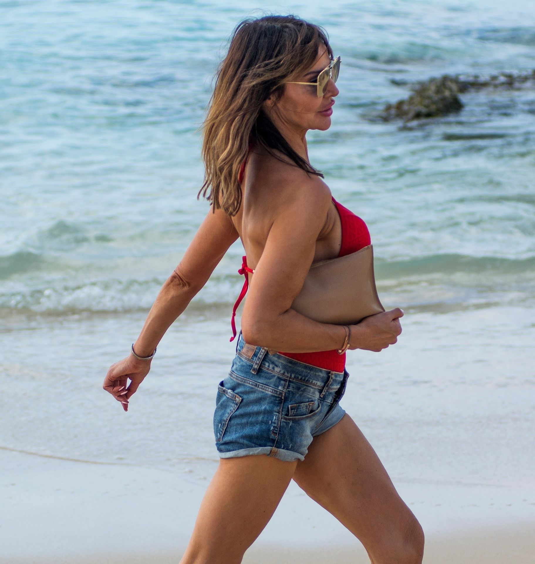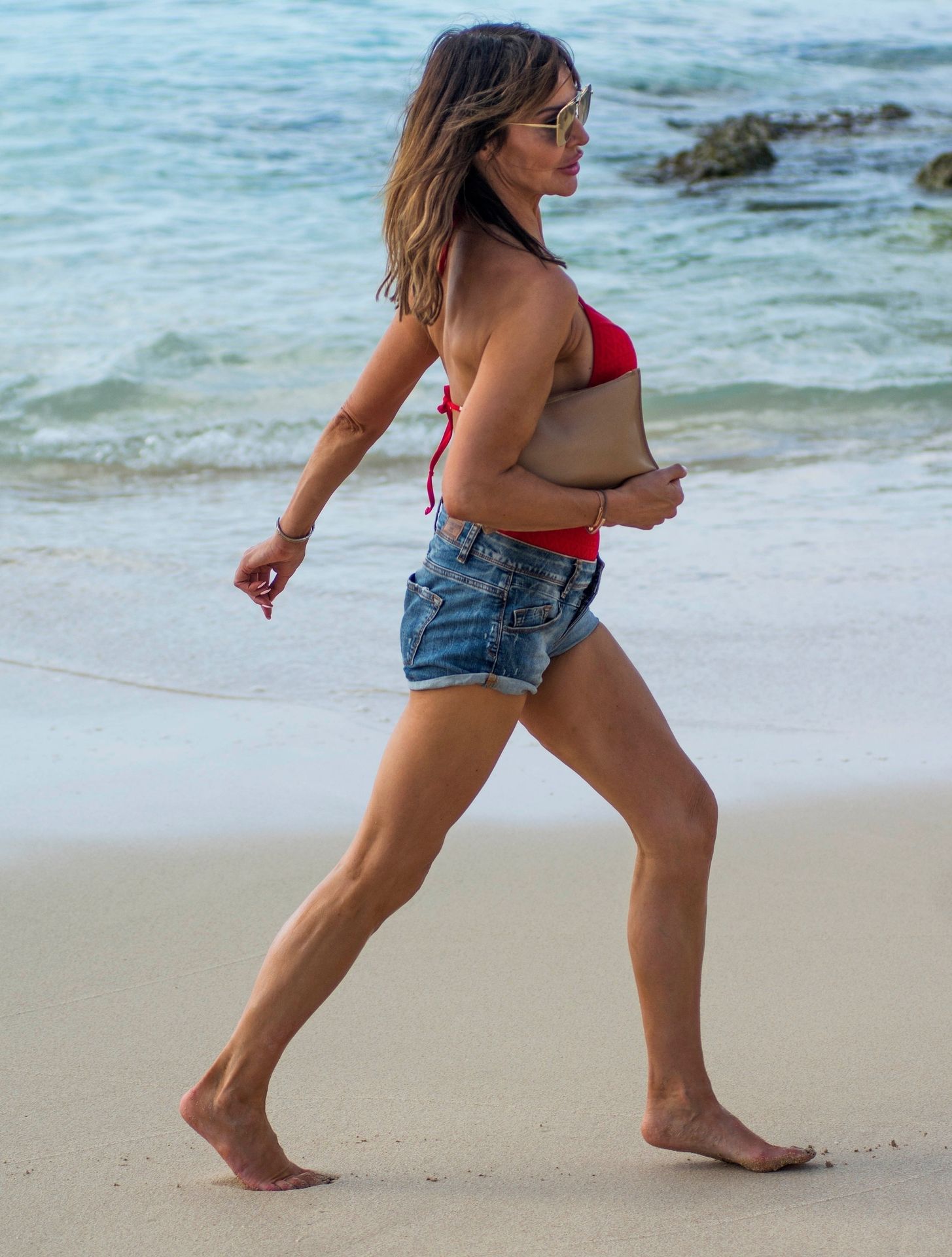 Locutora de radio y personalidad de televisión Lizzie Cundy (49) aparece vestida completamente de rojo con un traje de baño rojo brillante mientras disfruta de un paseo por la playa durante sus vacaciones de invierno en Barbados, 28/12/2019.
