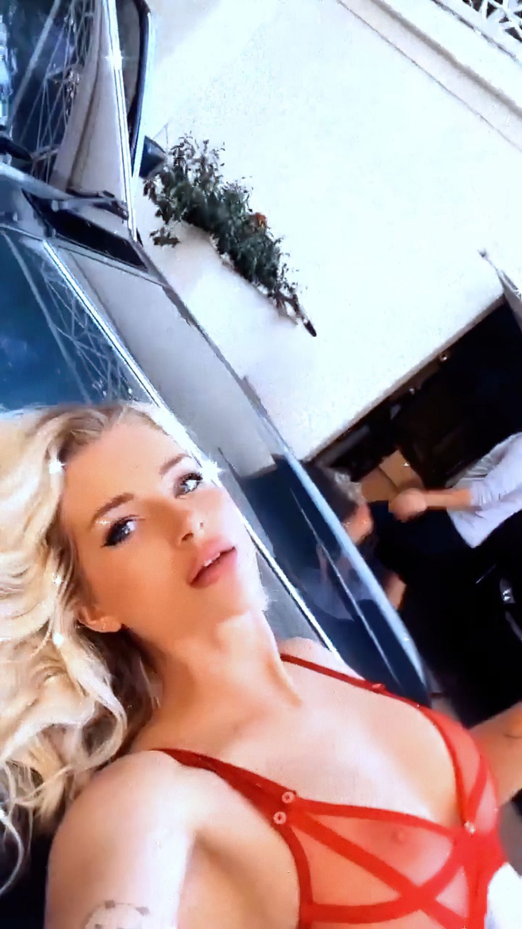 Model Lottie Moss muestra sus tetas ligeramente desnudas mientras posa sobre un coche con lencería de encaje roja en una sesión de fotos reciente para @mymomwillneverseethese – Instagram, 13/03/2021.