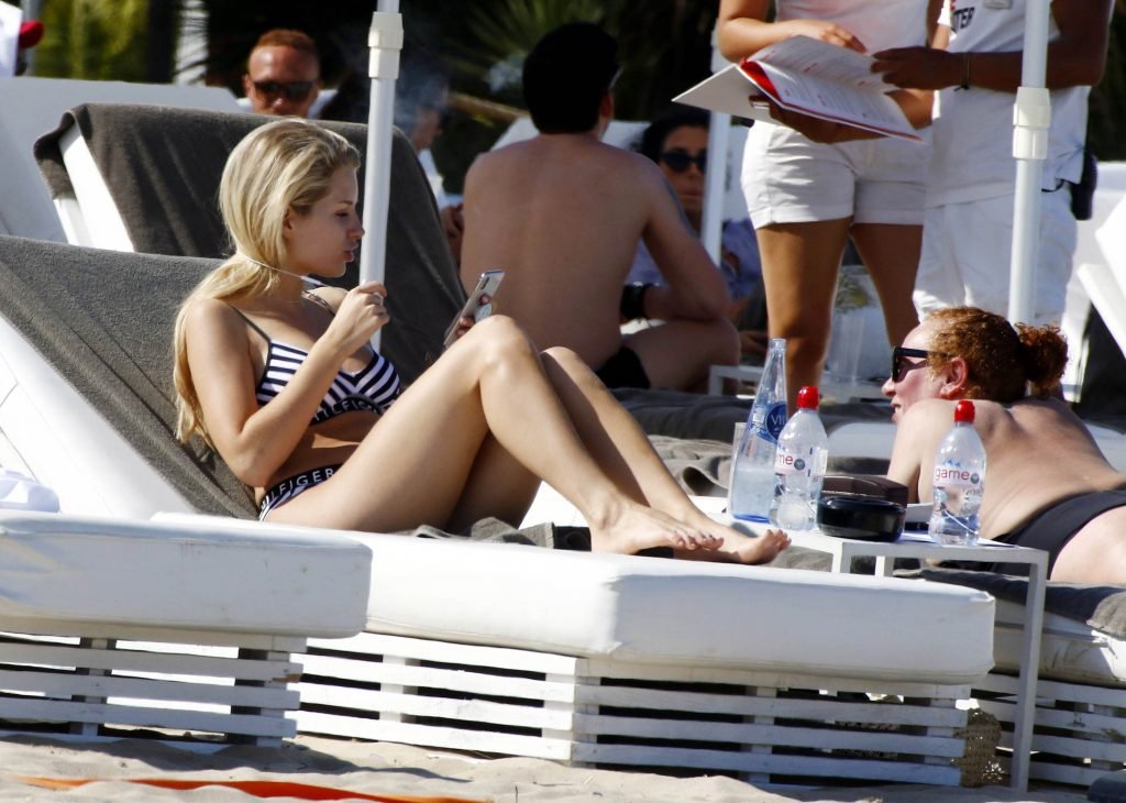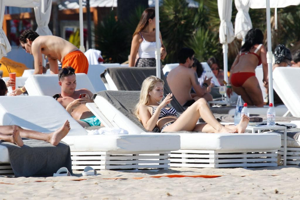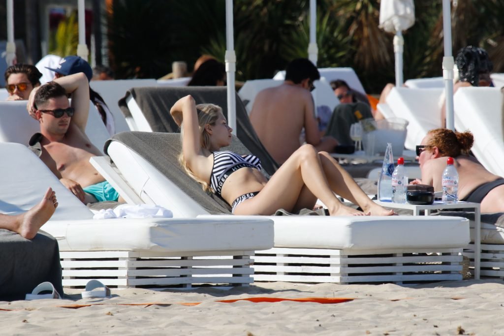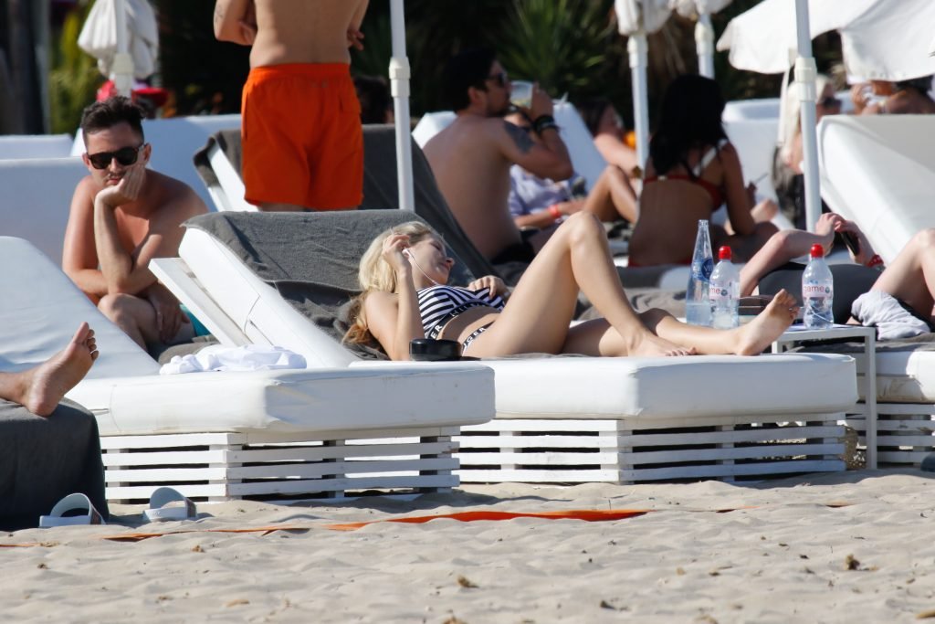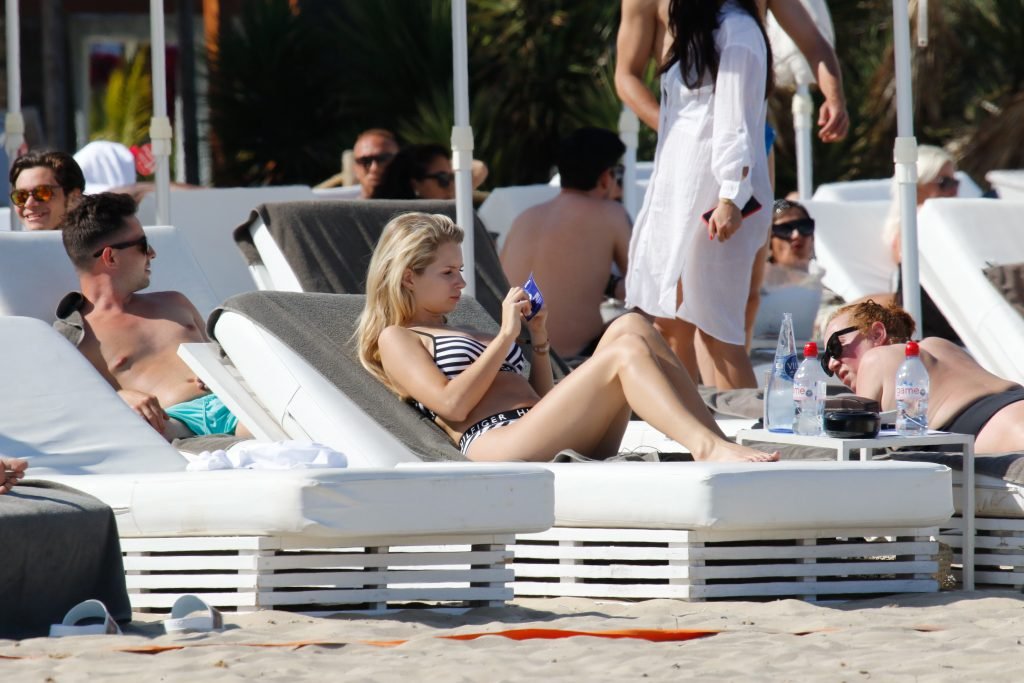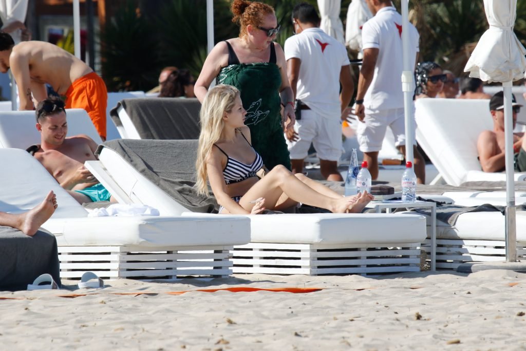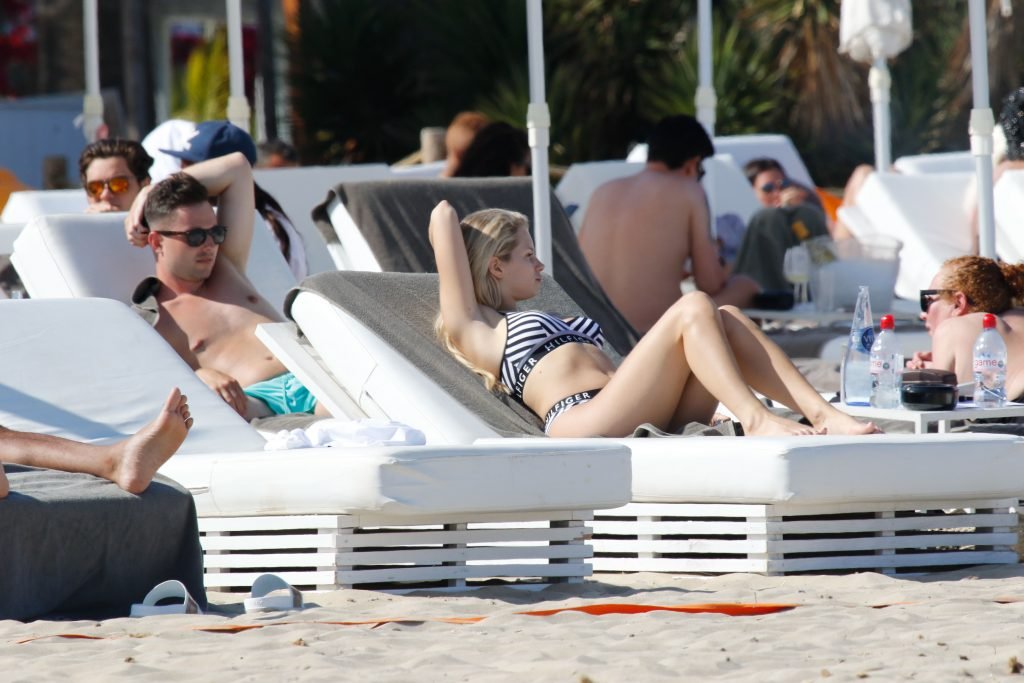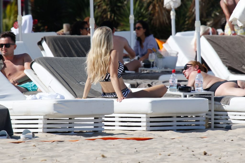 Model Lottie Moss, 20, se relaja en la playa con un bikini Tommy Hilfiger en Ibiza, 23/05/2018. La modelo fue vista relajándose con una amiga al sol, revisando su teléfono y fumando un cigarrillo.