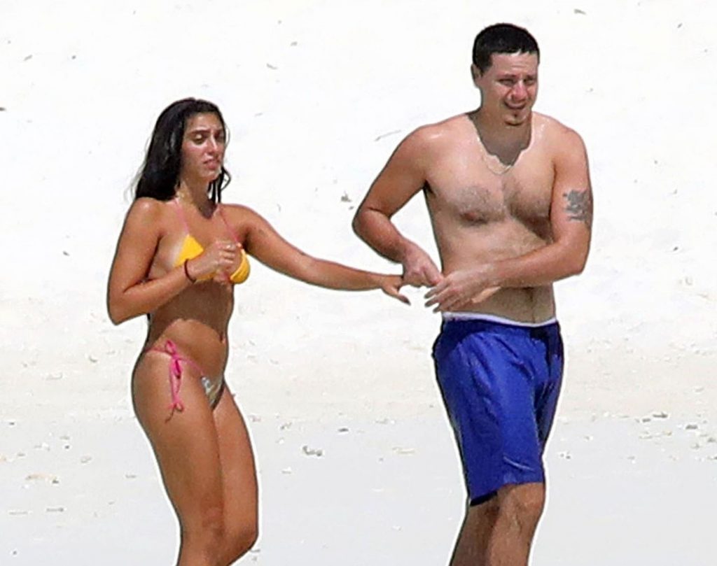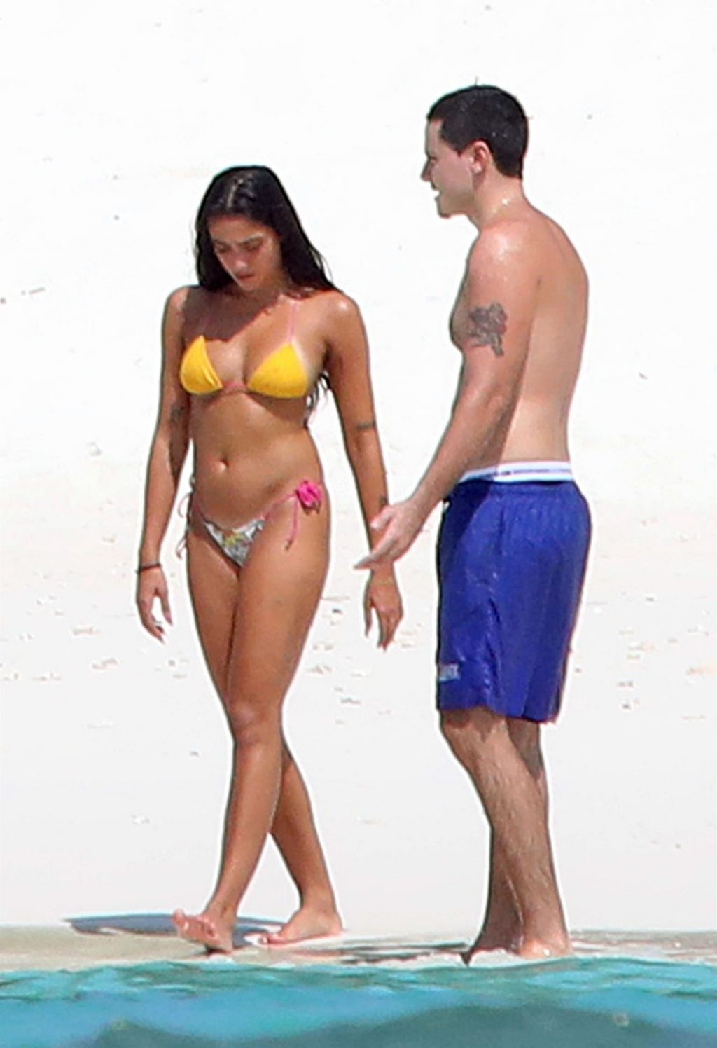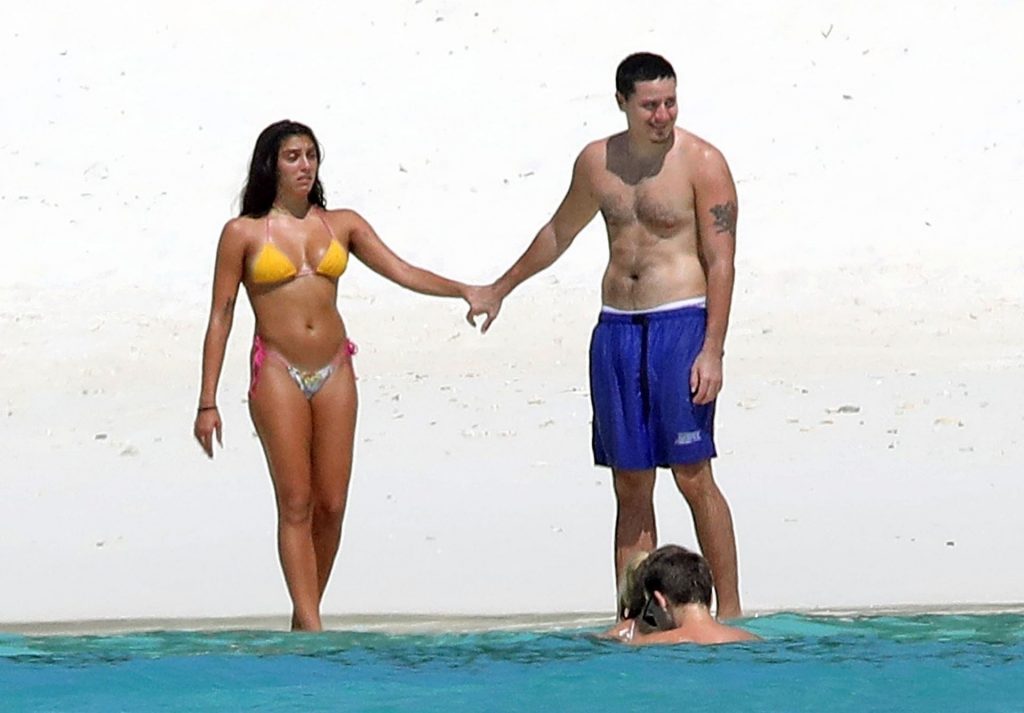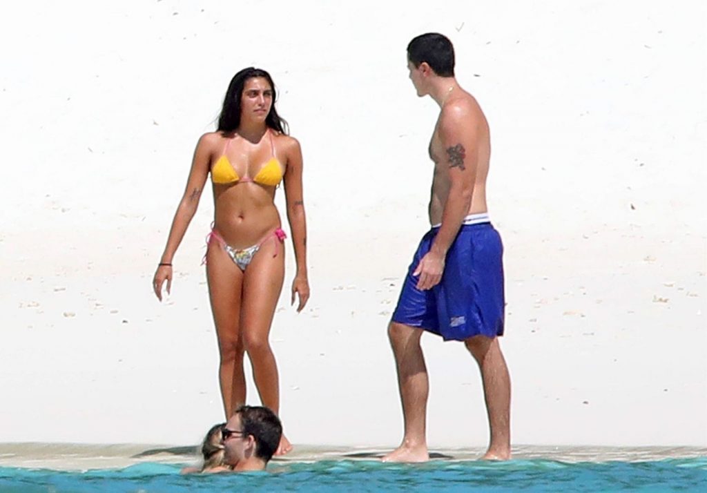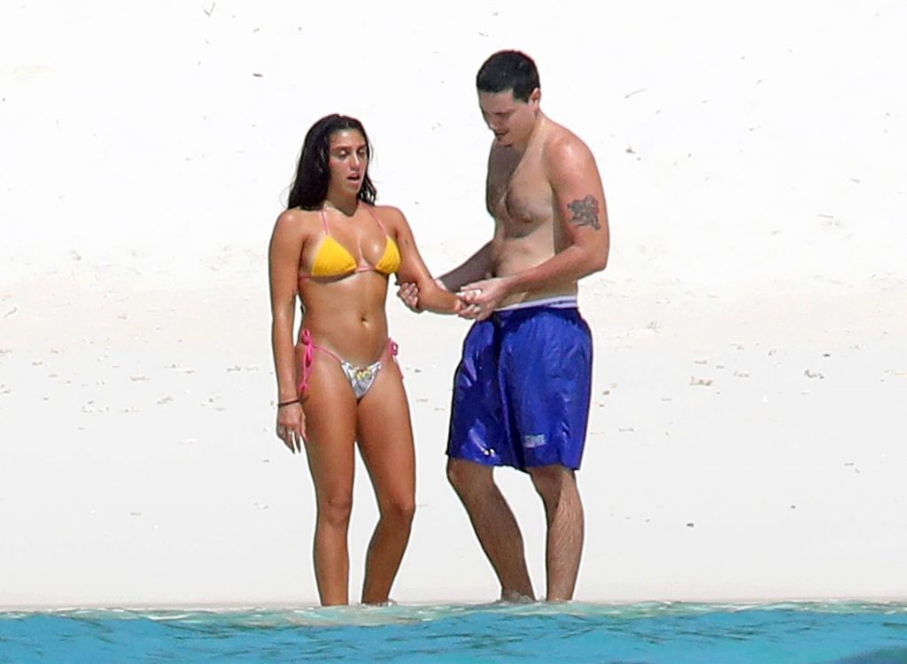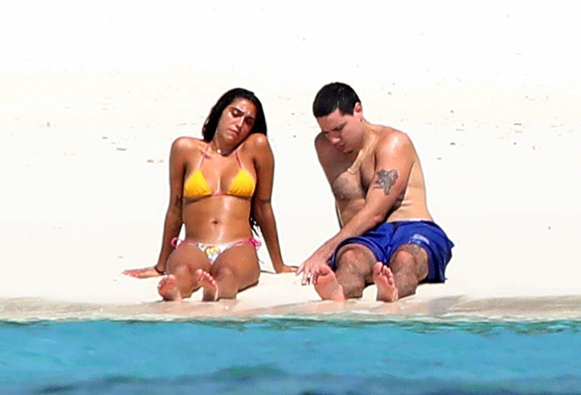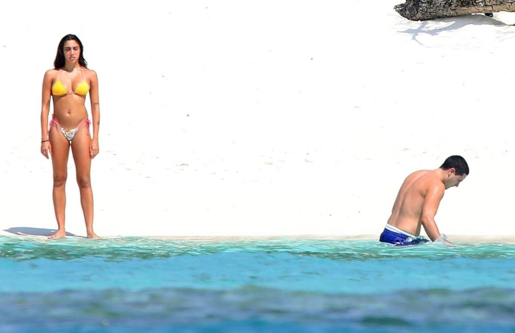 La joven de 23 años deslumbró con un calor de 30 grados usando su pequeño bikini escaso, pero las fotos muestran a Lourdes con una serie de expresiones faciales preocupadas mientras avanzaba con temor hacia el mar con su novio, Jonathan Puglia.