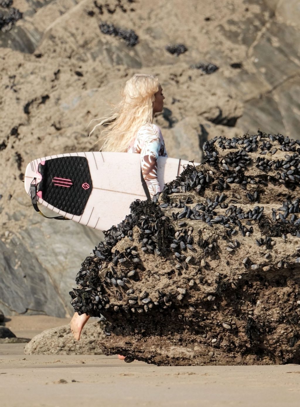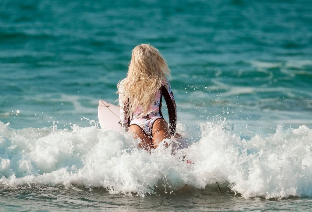 Con su amor por el surf, Lucie es vista con su tabla de surf disfrutando de las olas, vistiendo su sexy traje de baño floral, con su larga melena rubia bajo el sol y unas piernas para morir.
