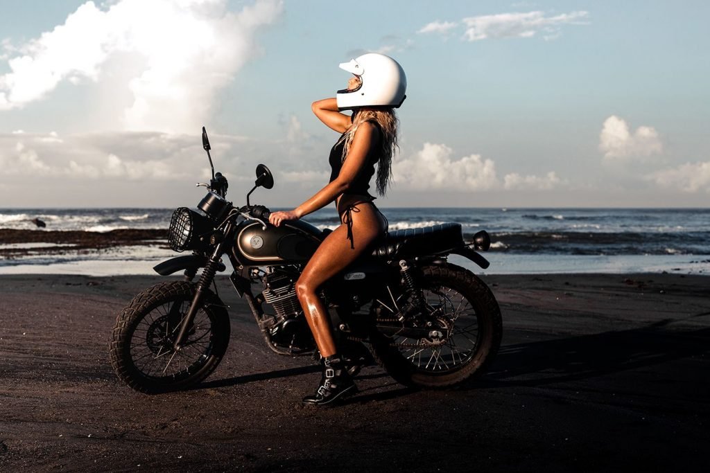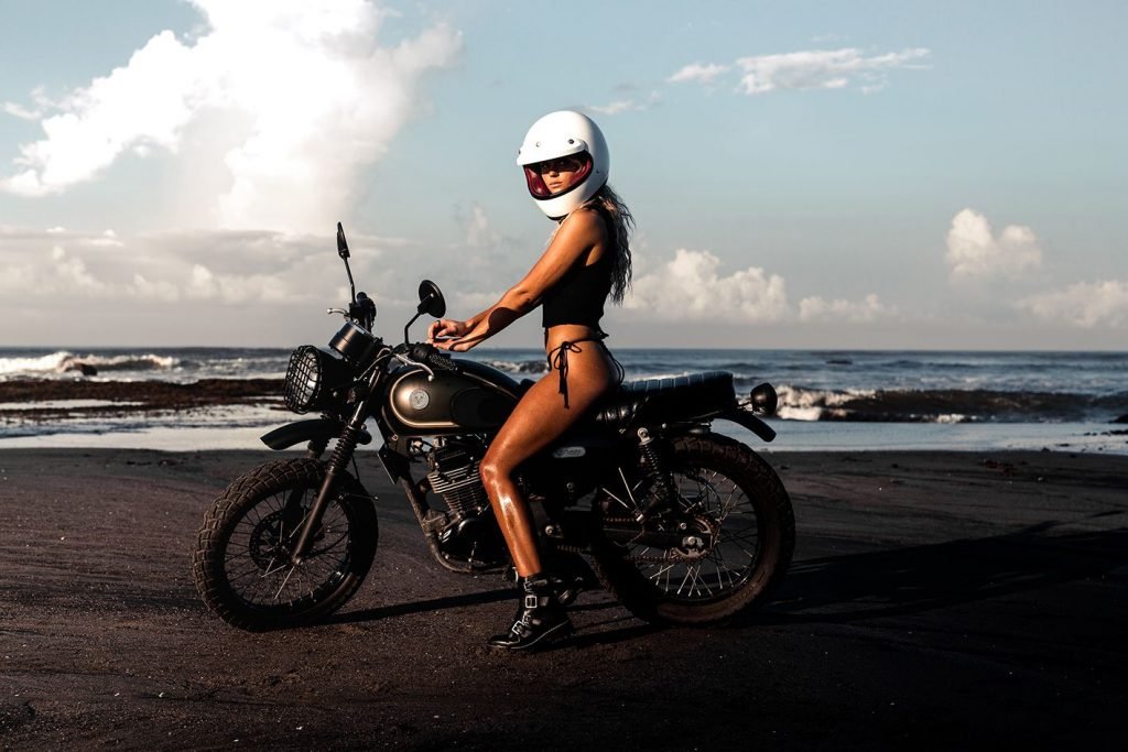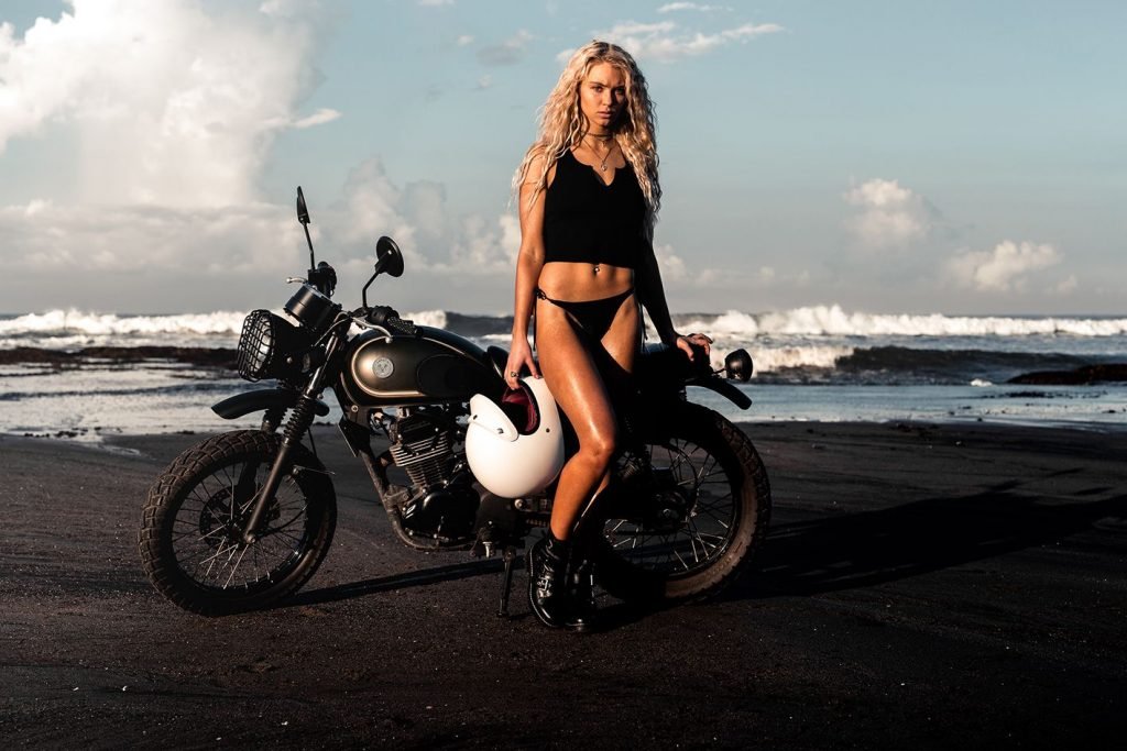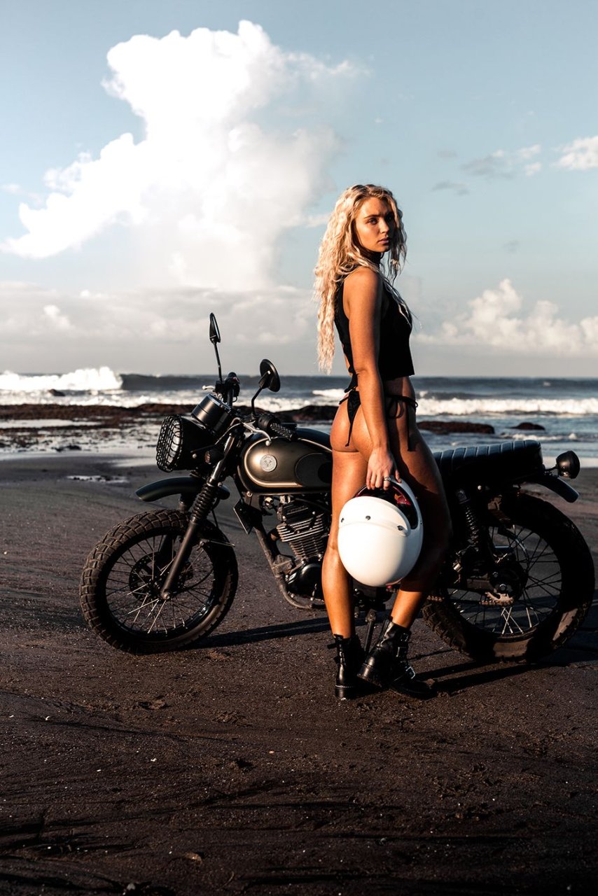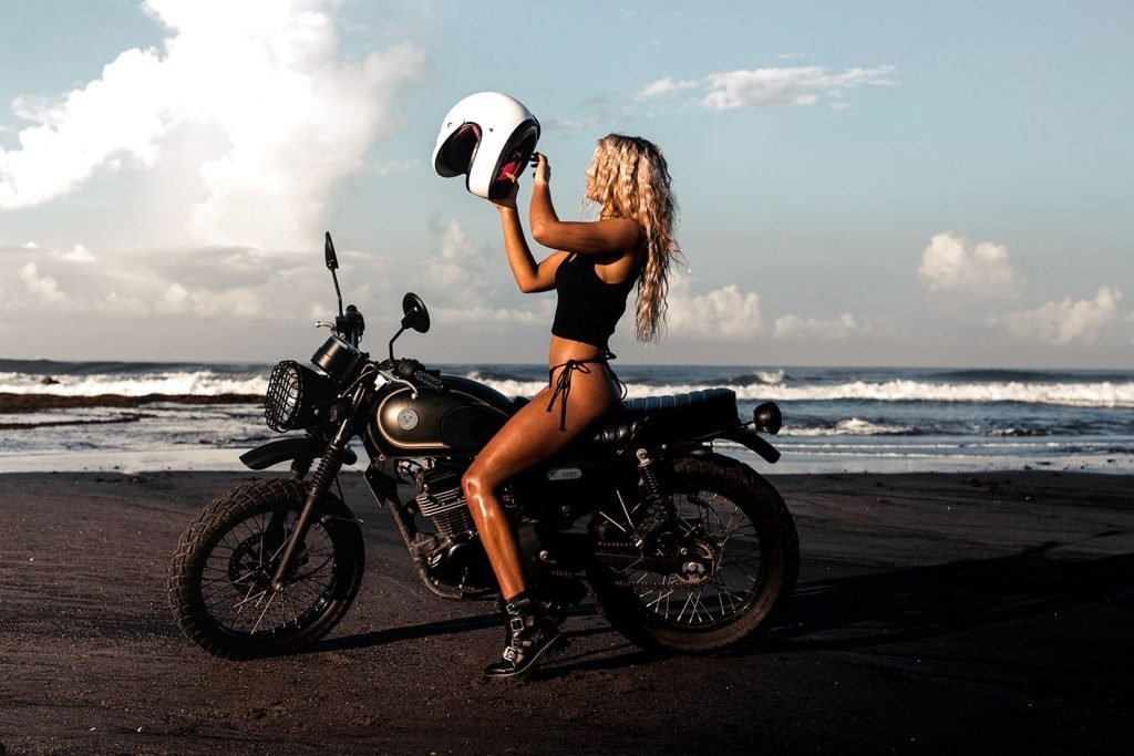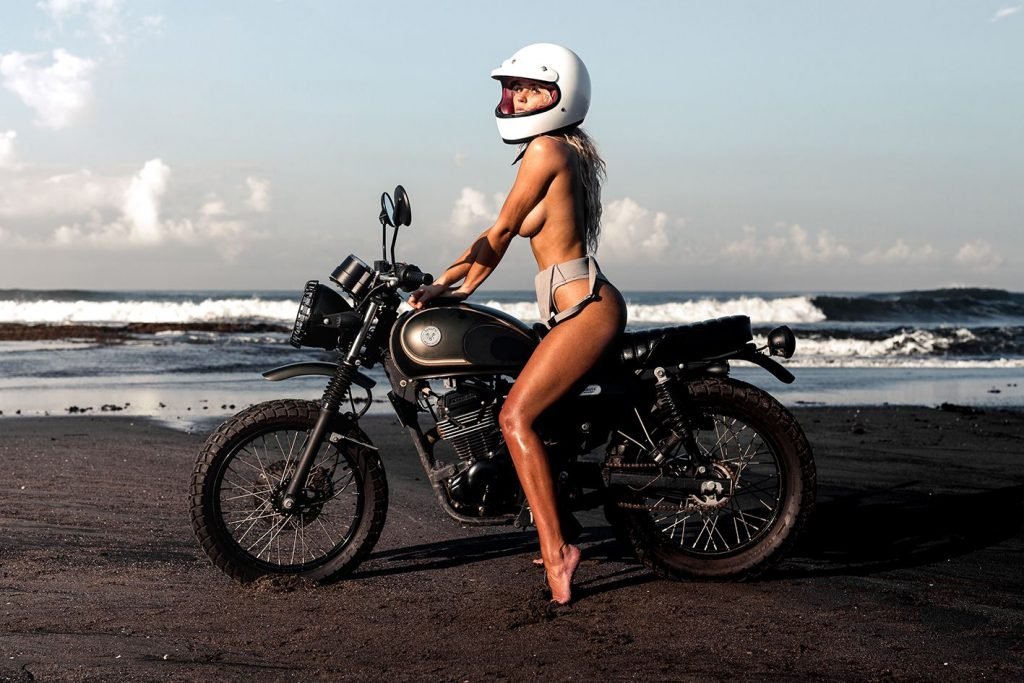 “Love Island” concursante Lucie Rose Donlan posa desnuda en la parte superior sobre una motocicleta en una playa de Bali, 06/03/2019.