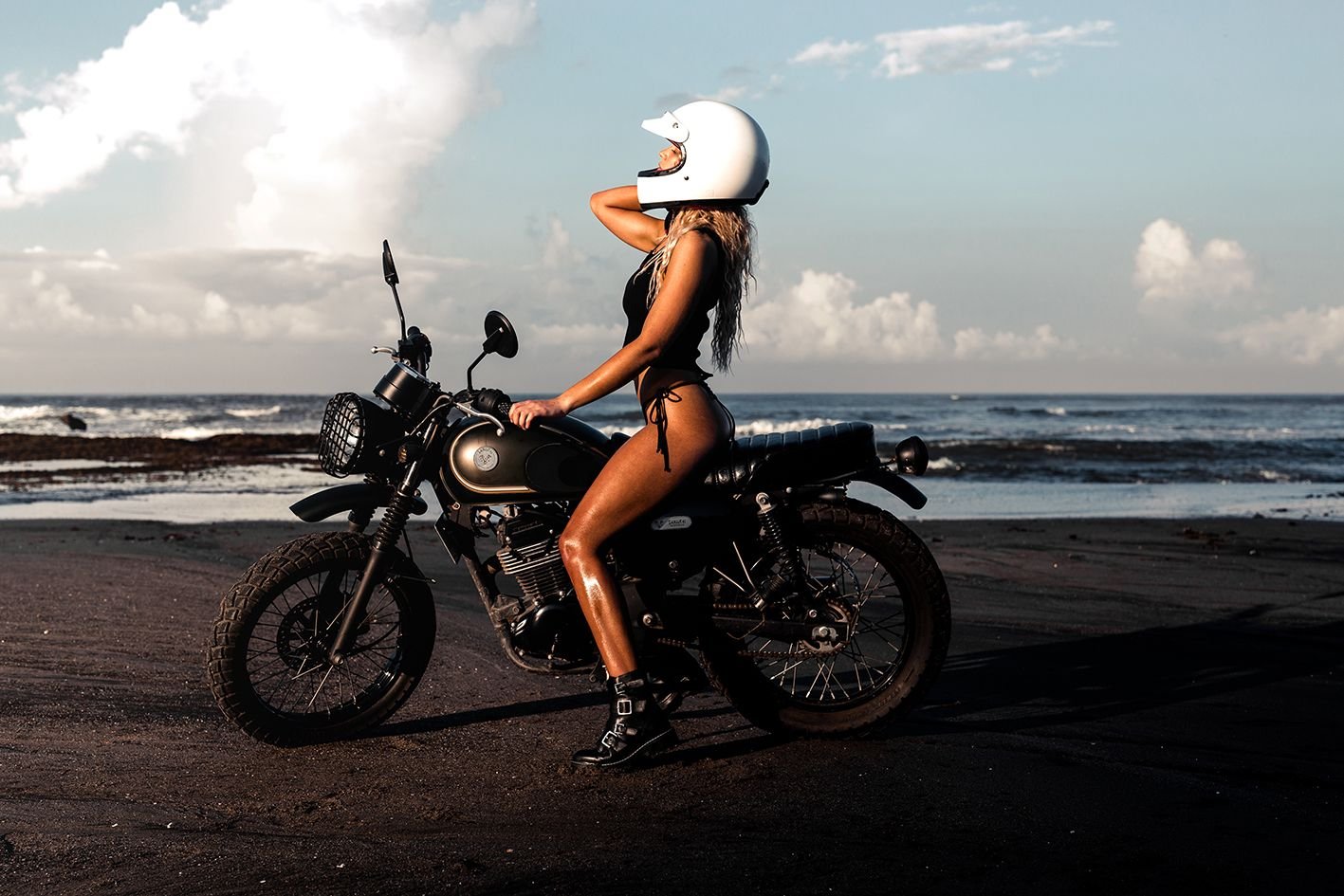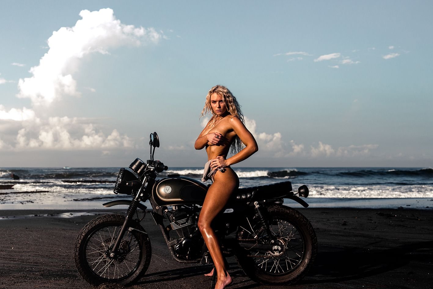 “Love Island” concursante Lucie Rose Donlan posa desnuda en la parte superior sobre una motocicleta en una playa de Bali, 06/03/2019.