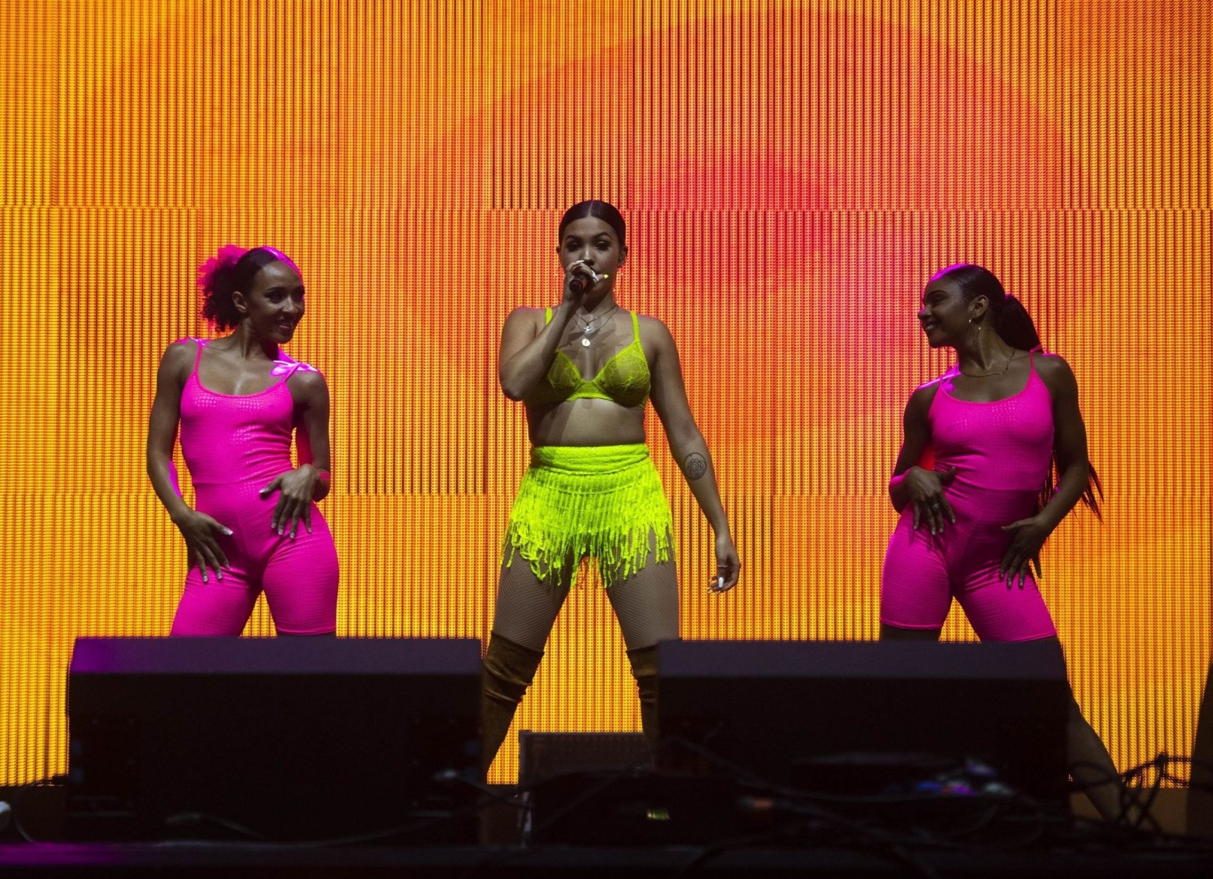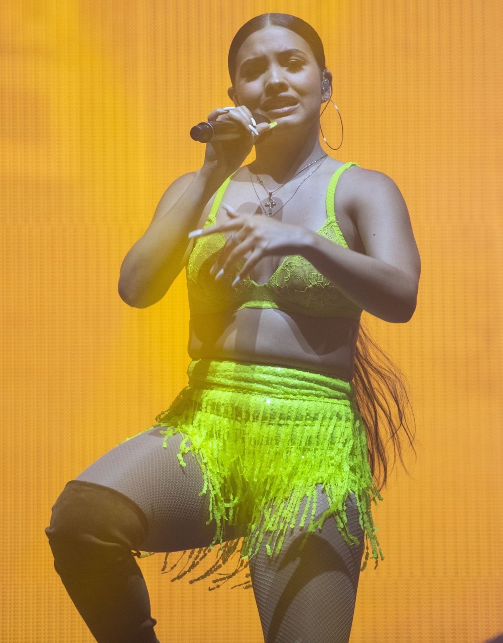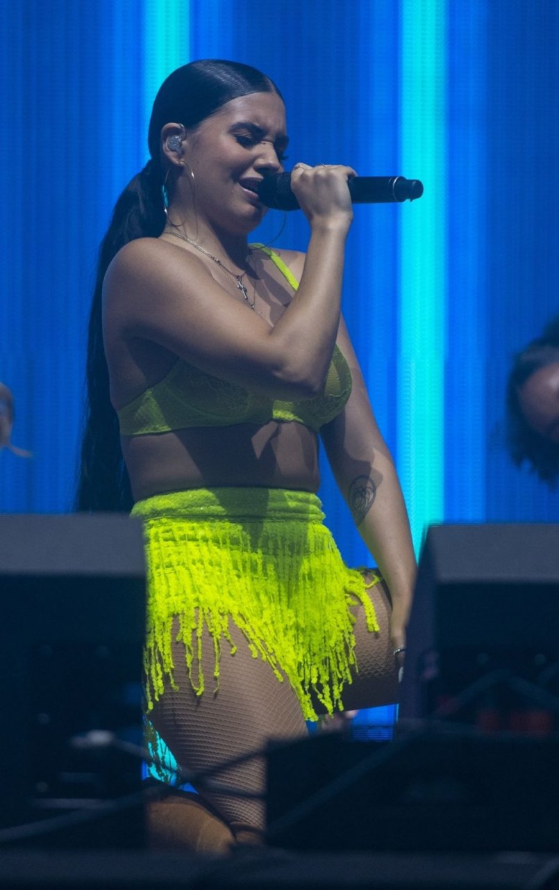 Mabel estaba actuando en vivo con un sujetador y falda verde tóxico en el escenario de Radio 1 en el Leeds Festival 2019.