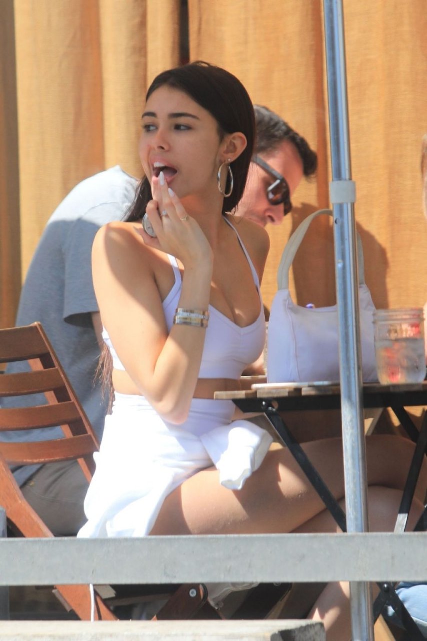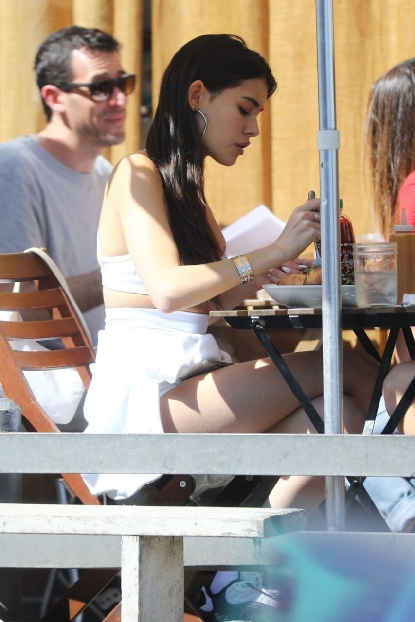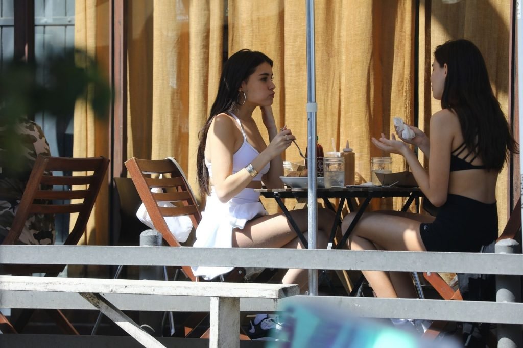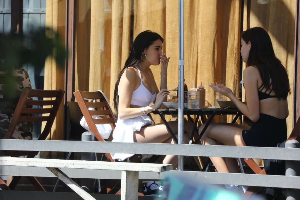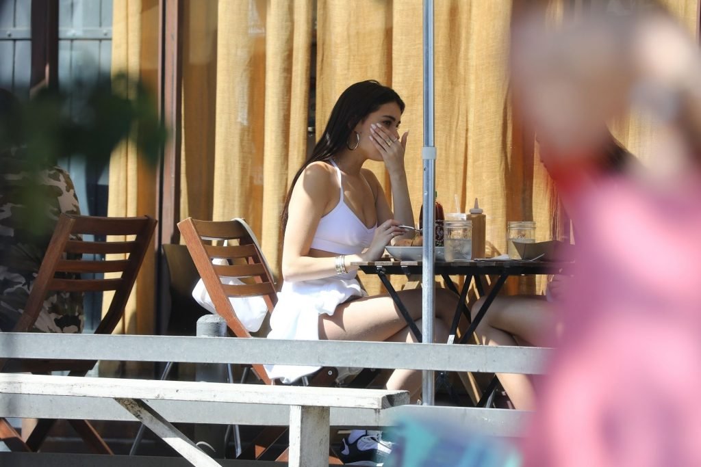 Madison Beer muestra su figura delgada con pantalones cortos blancos y un top corto a juego mientras ella y una amiga compran jeans de mezclilla después de un almuerzo al aire libre juntas en West Hollywood, 18/03/2019.