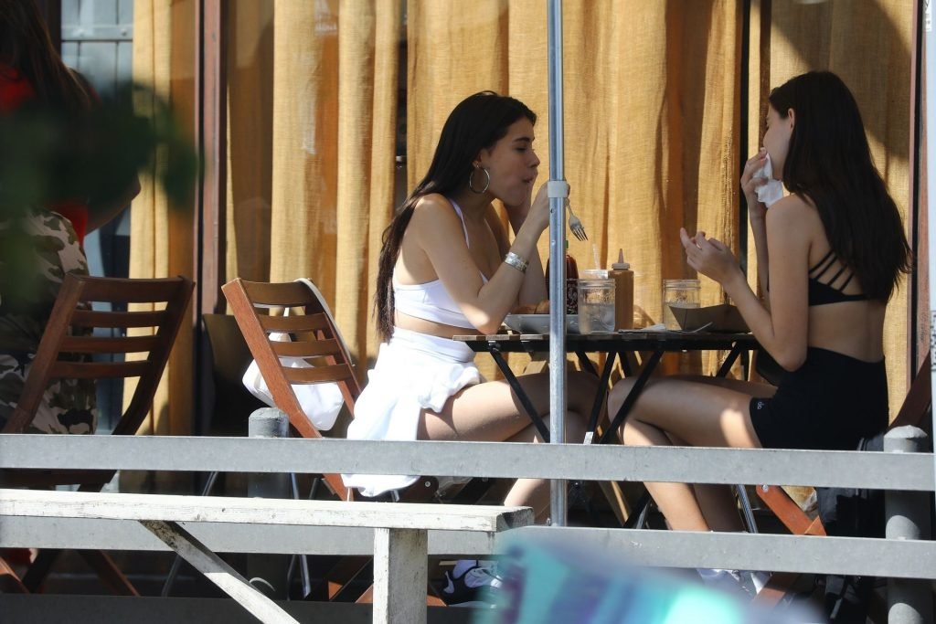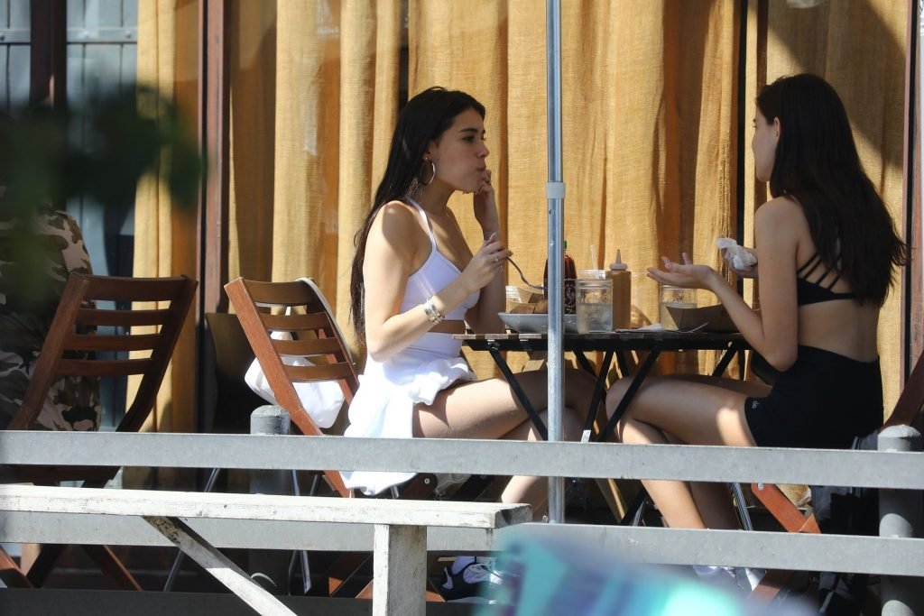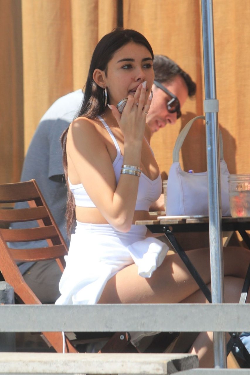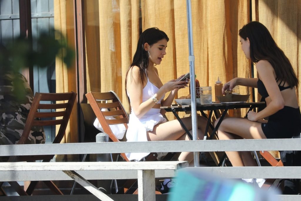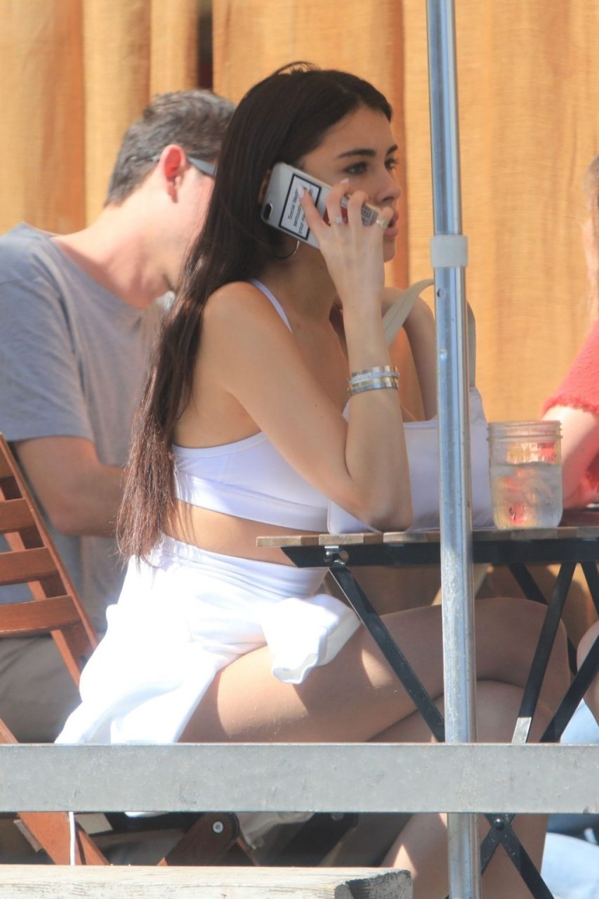Madison Beer muestra su figura delgada con pantalones cortos blancos y un top corto a juego mientras ella y una amiga compran jeans de mezclilla después de un almuerzo al aire libre juntas en West Hollywood, 18/03/2019.