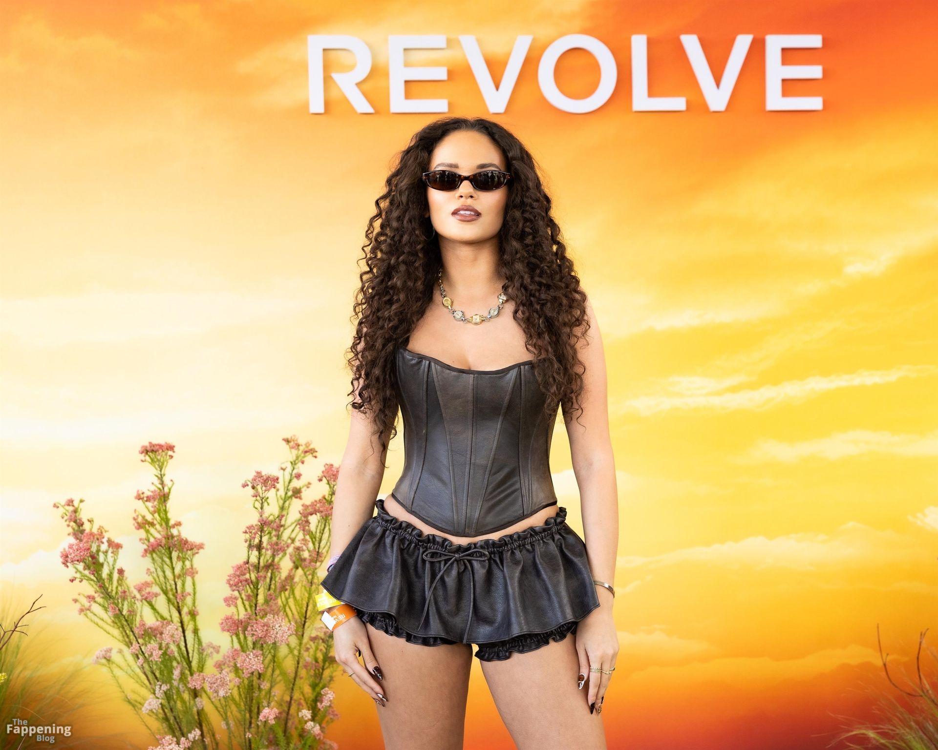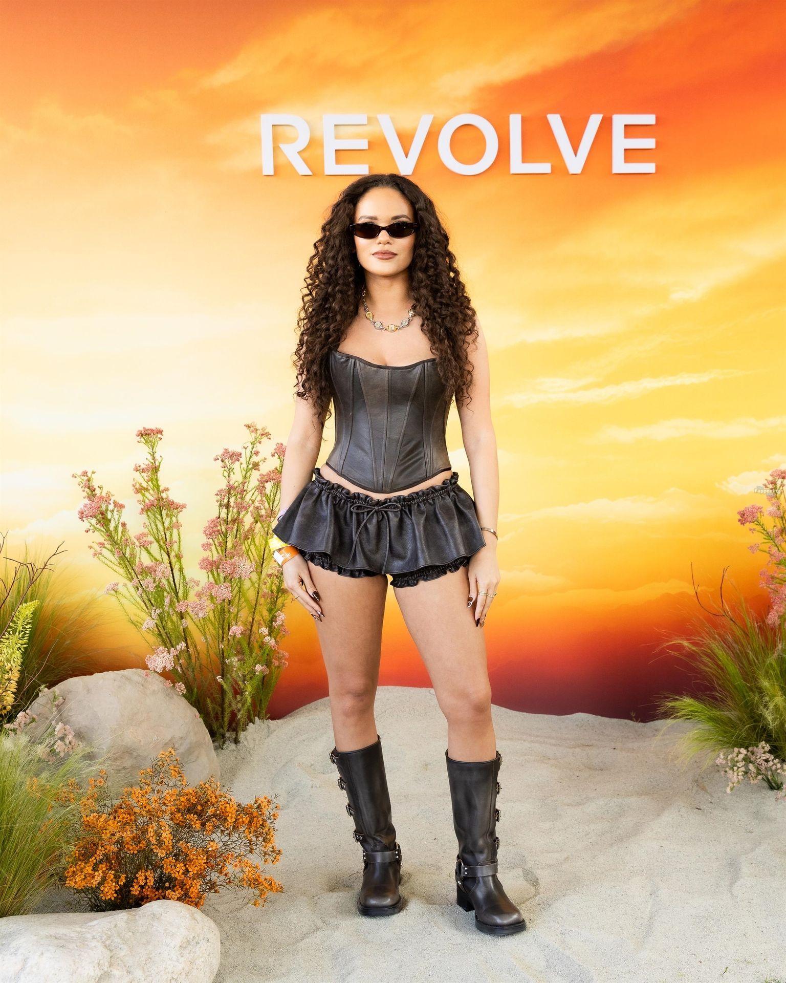 Madison Pettis deslumbra en el Festival Revolve, mostrando sus sexys piernas con un mini vestido de cuero negro y corsé. Las estrellas brillaron en la octava edición anual del Festival Revolve en Thermal.