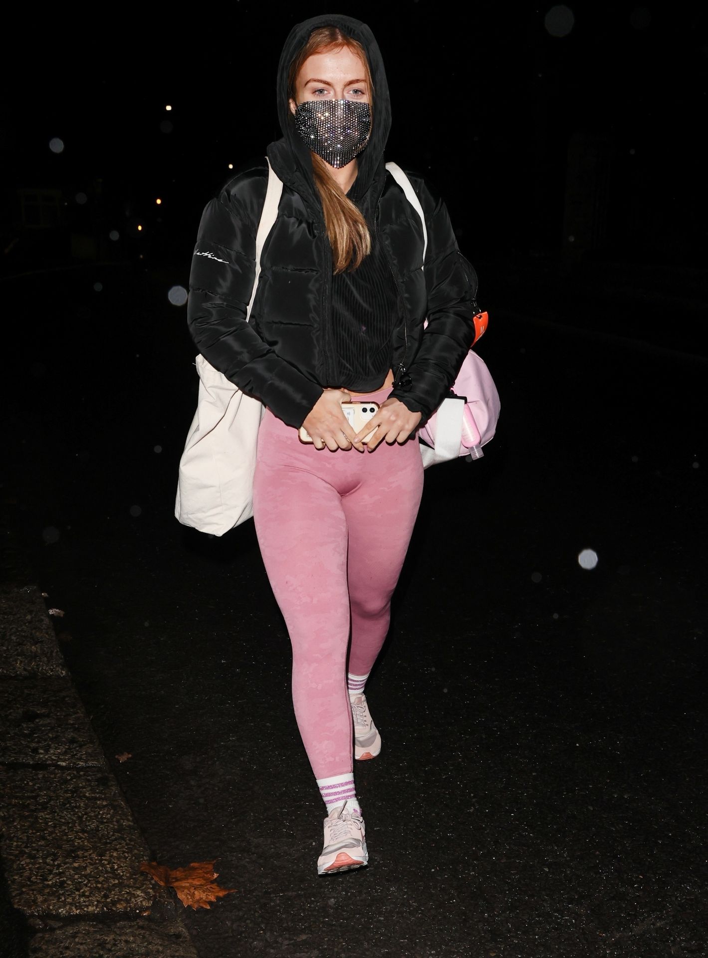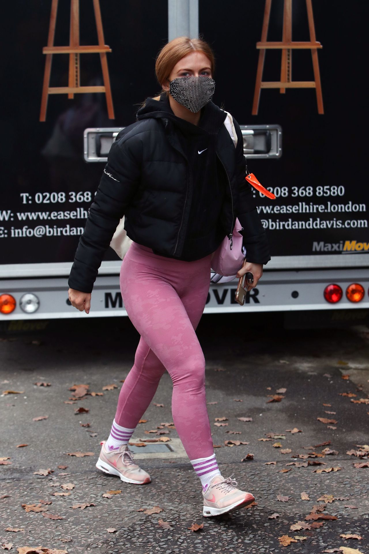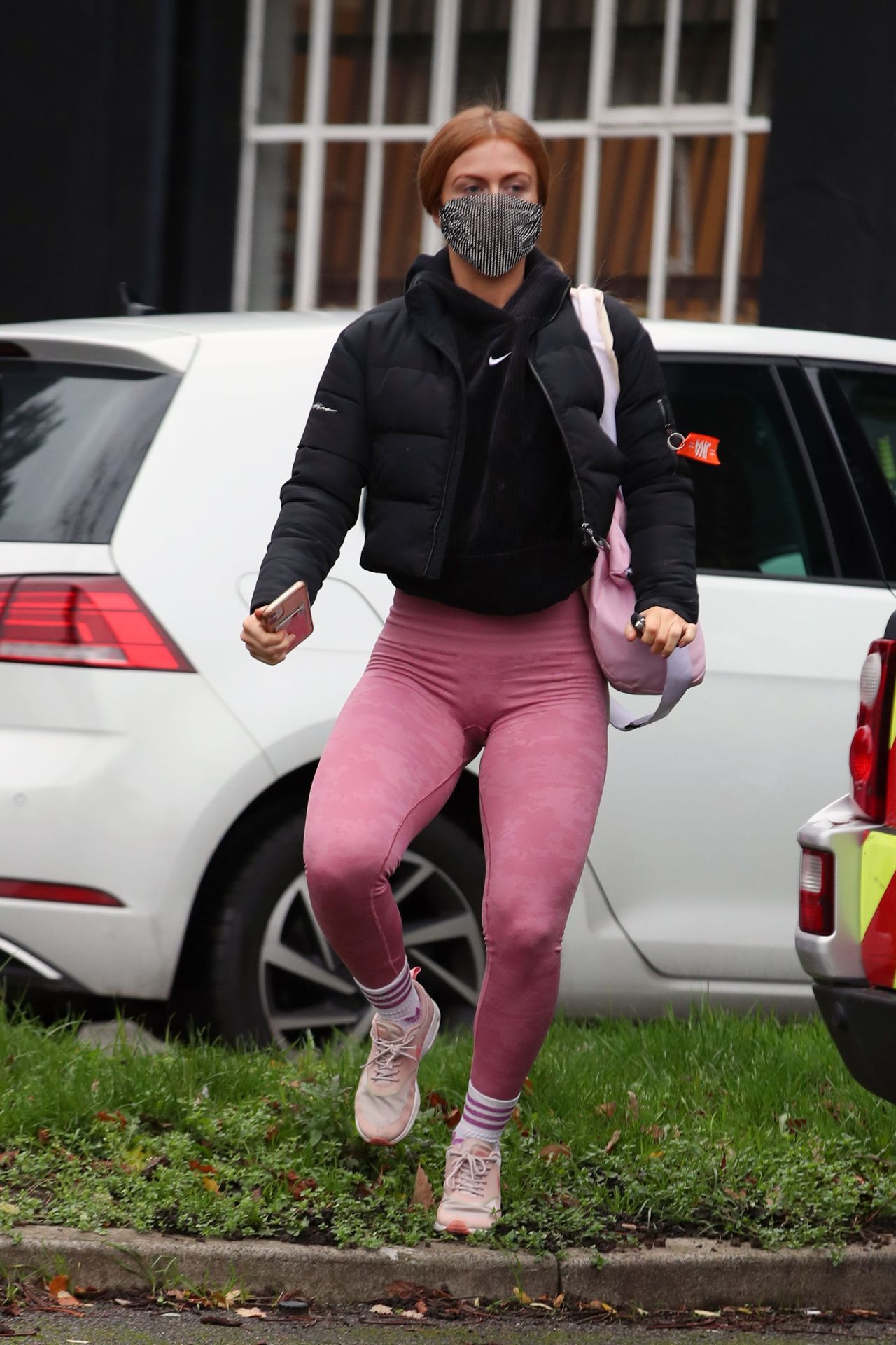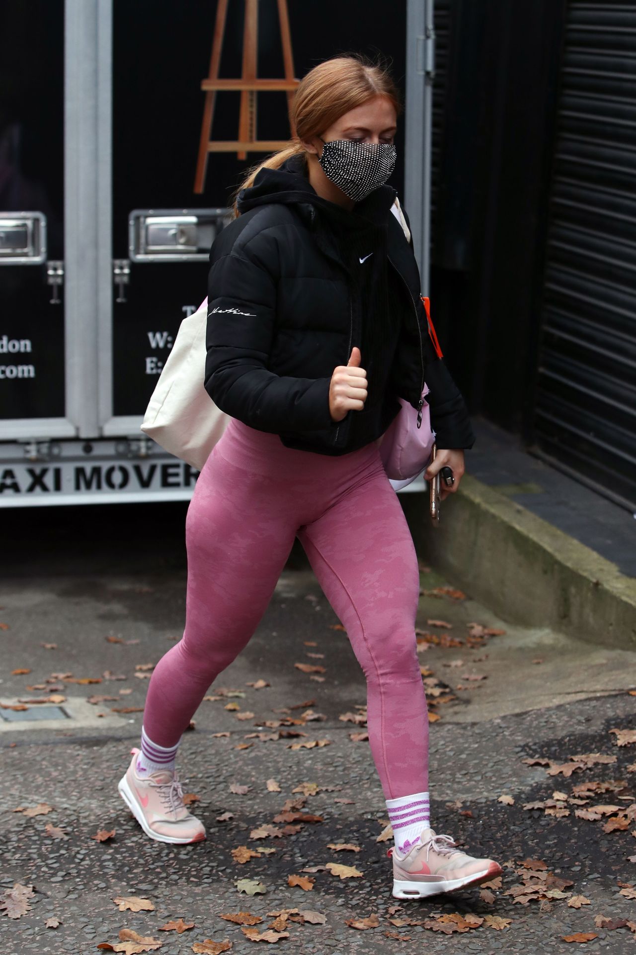 “Eastenders”, actriz y estrella de “Strictly Come Dancing” Maisie Smith muestra el pulgar hacia arriba mientras es fotografiada llegando y saliendo de los estudios de ensayo de Strictly usando una mascarilla en Londres, 16/11/2020.