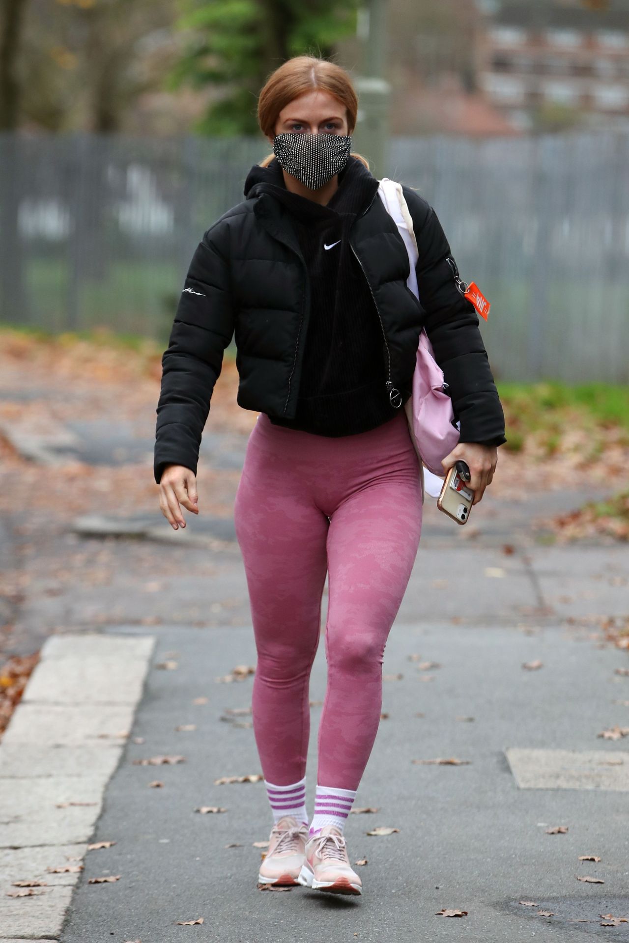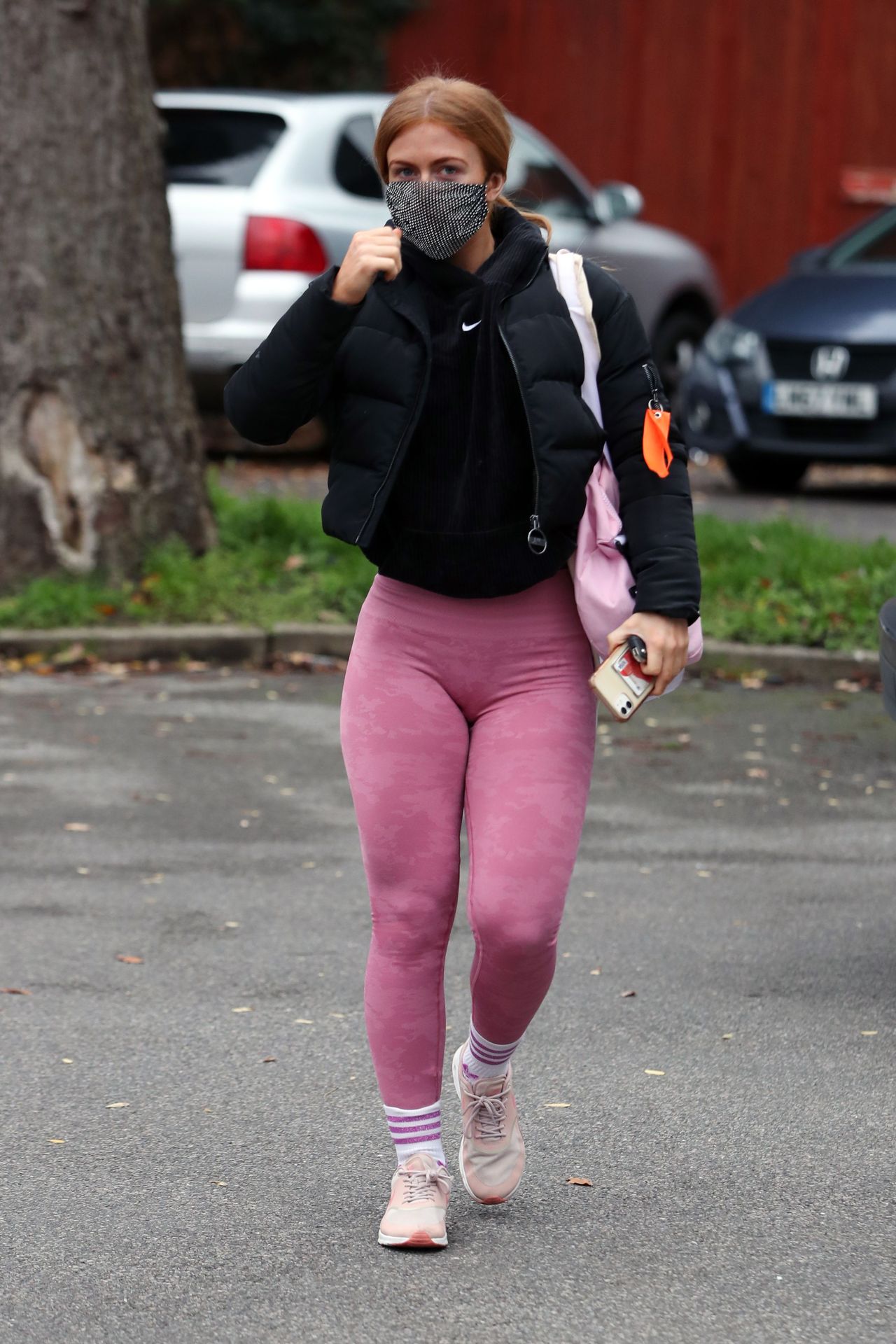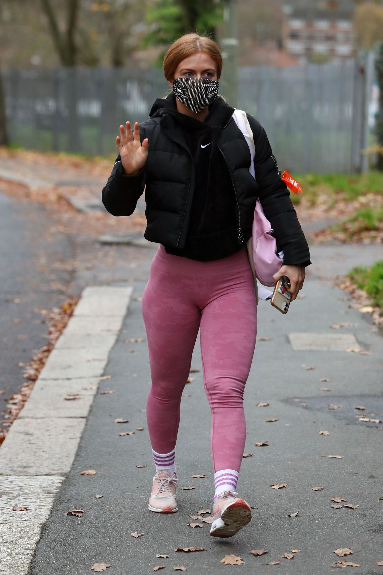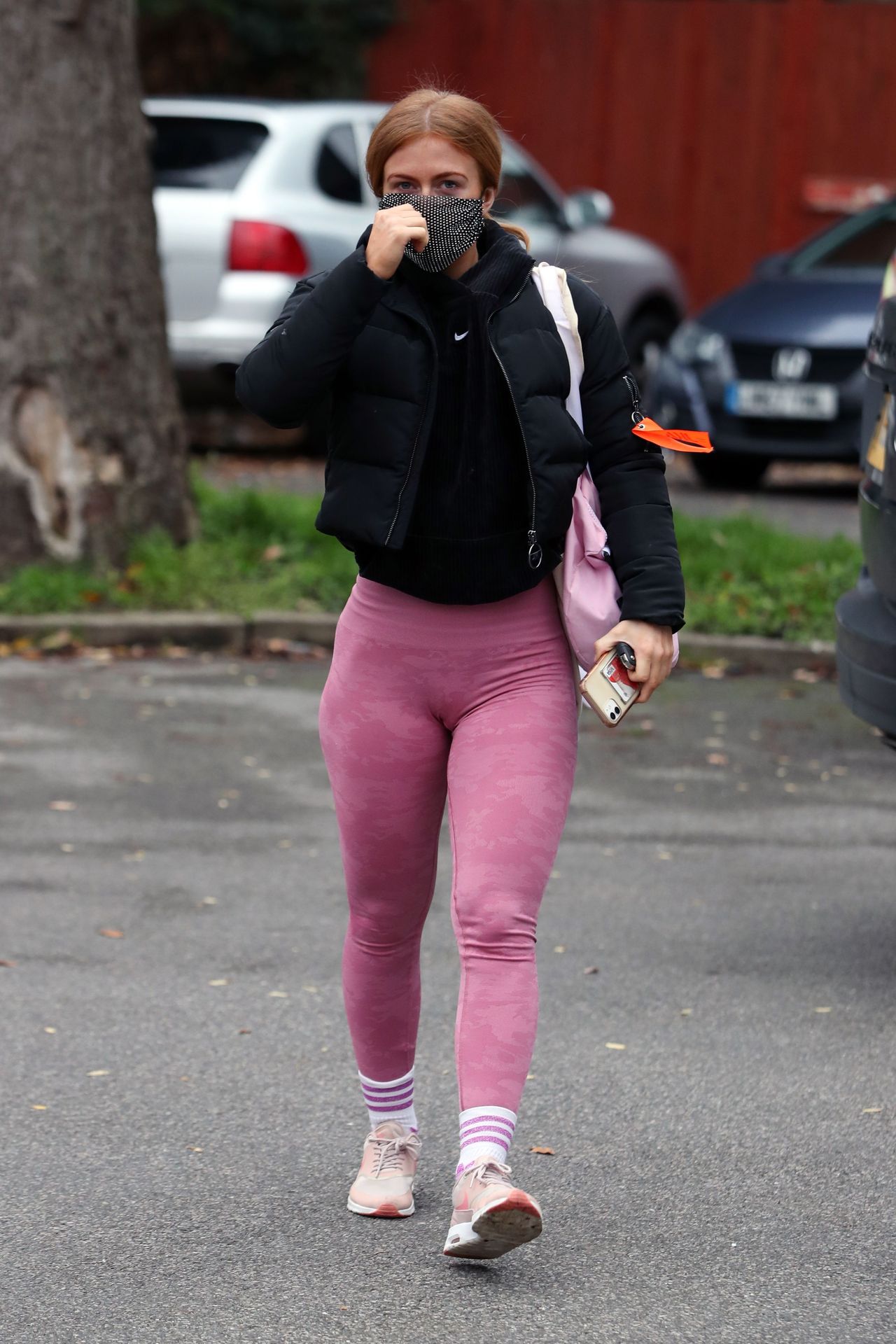 “Eastenders”, actriz y estrella de “Strictly Come Dancing” Maisie Smith muestra el pulgar hacia arriba mientras es fotografiada llegando y saliendo de los estudios de ensayo de Strictly usando una mascarilla en Londres, 16/11/2020.