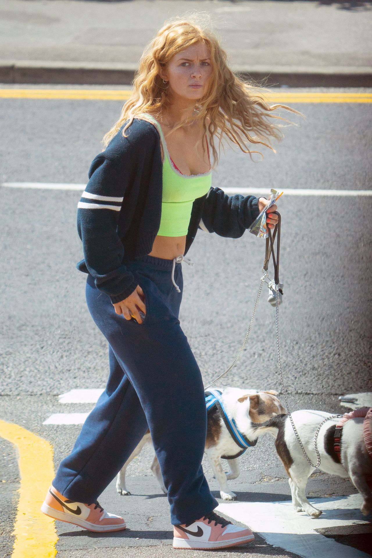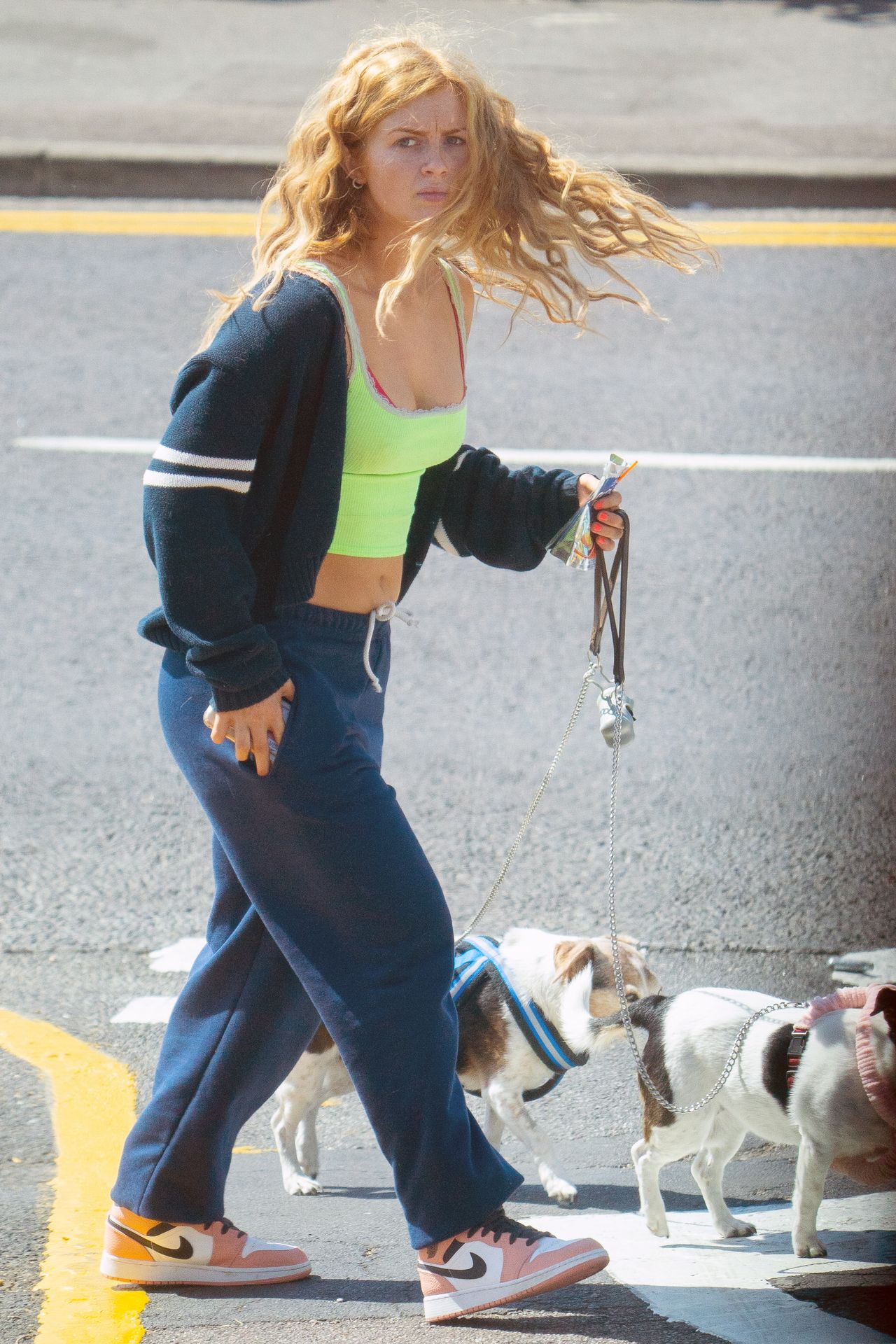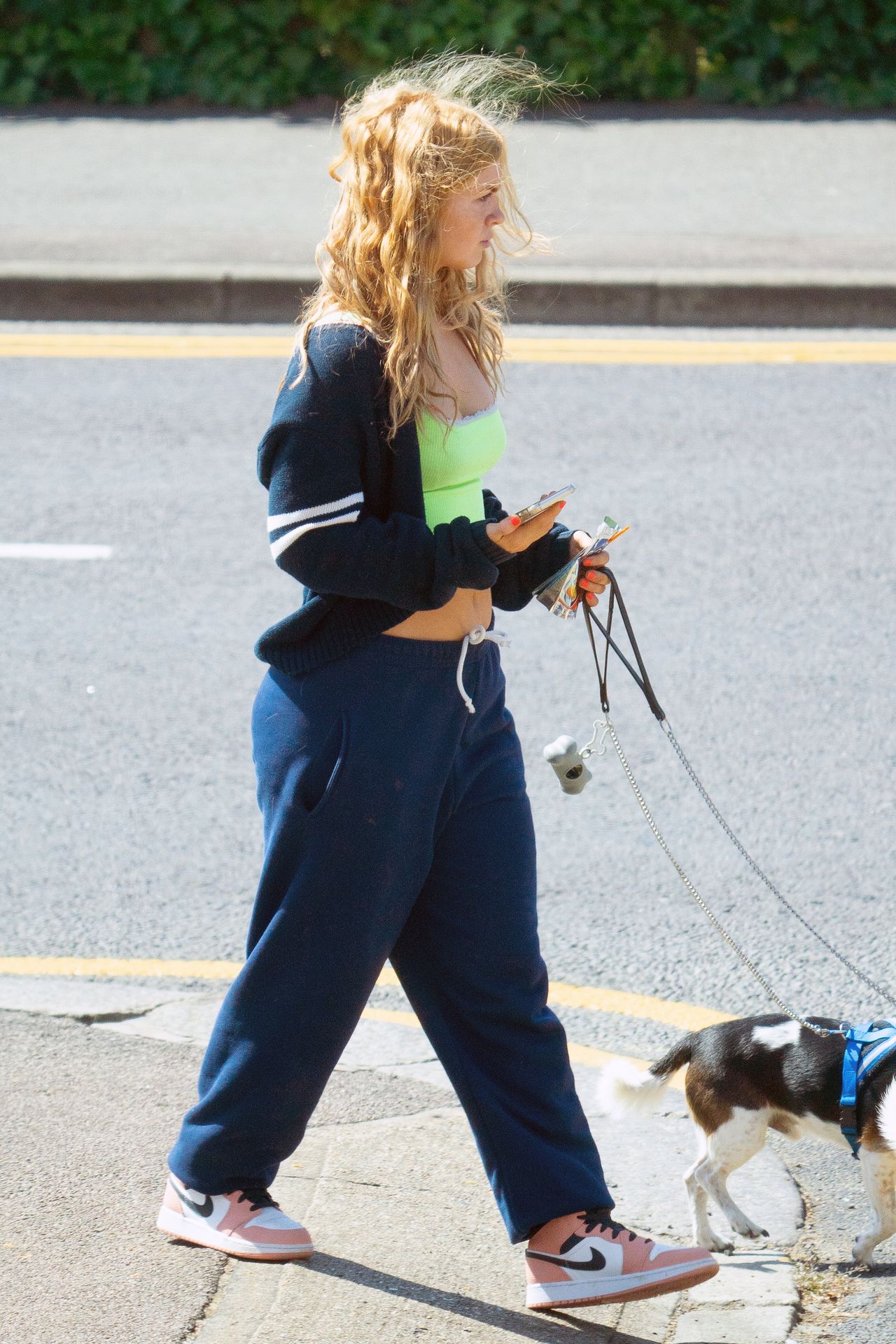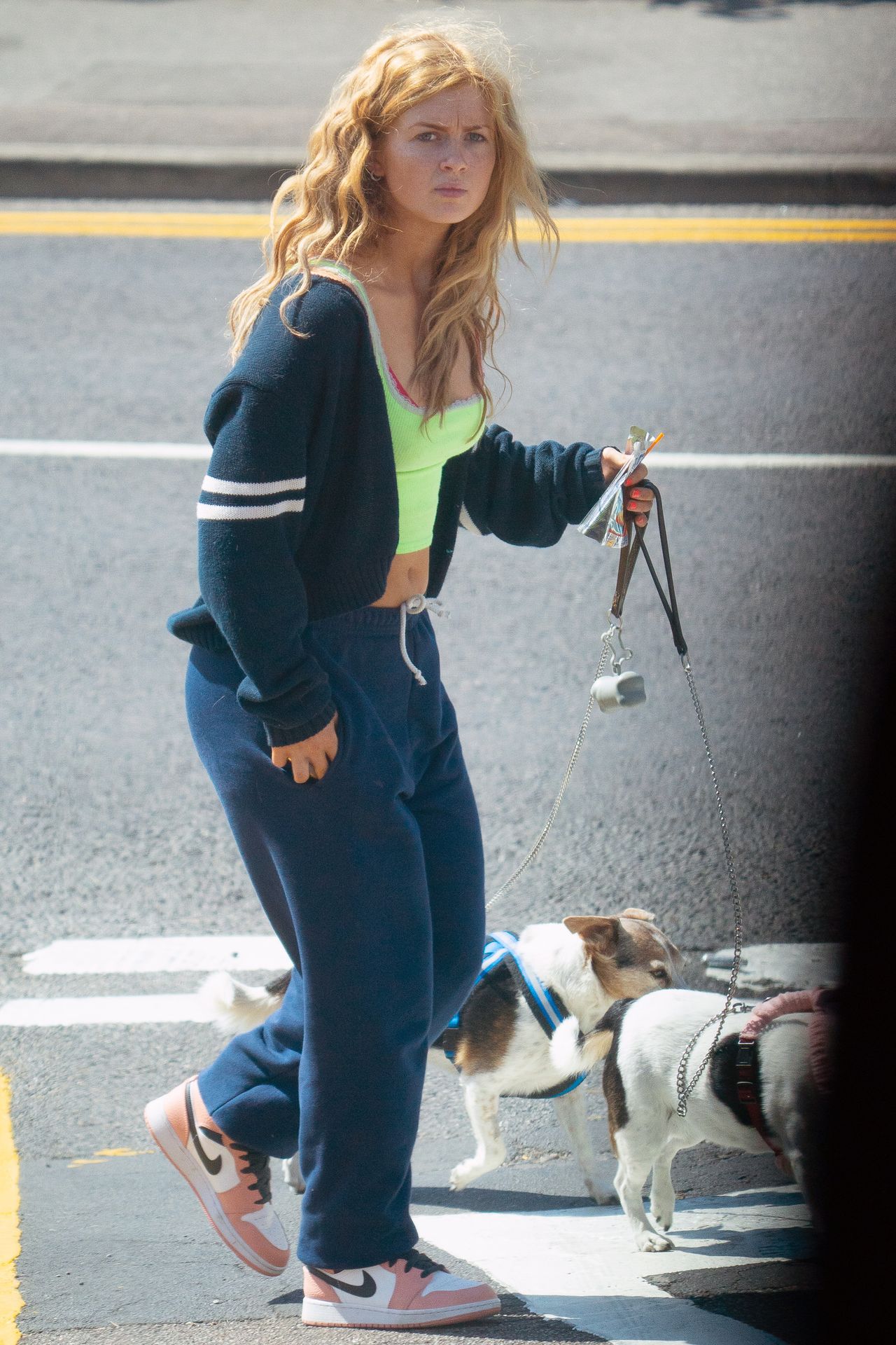 EastEnders la actriz Maisie Smith, quien interpreta a Tiffany, es vista hoy paseando a sus perros en Essex (2020).