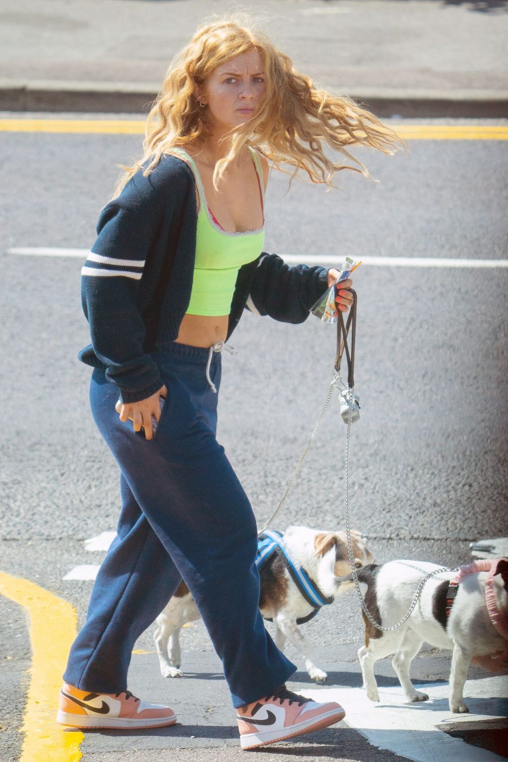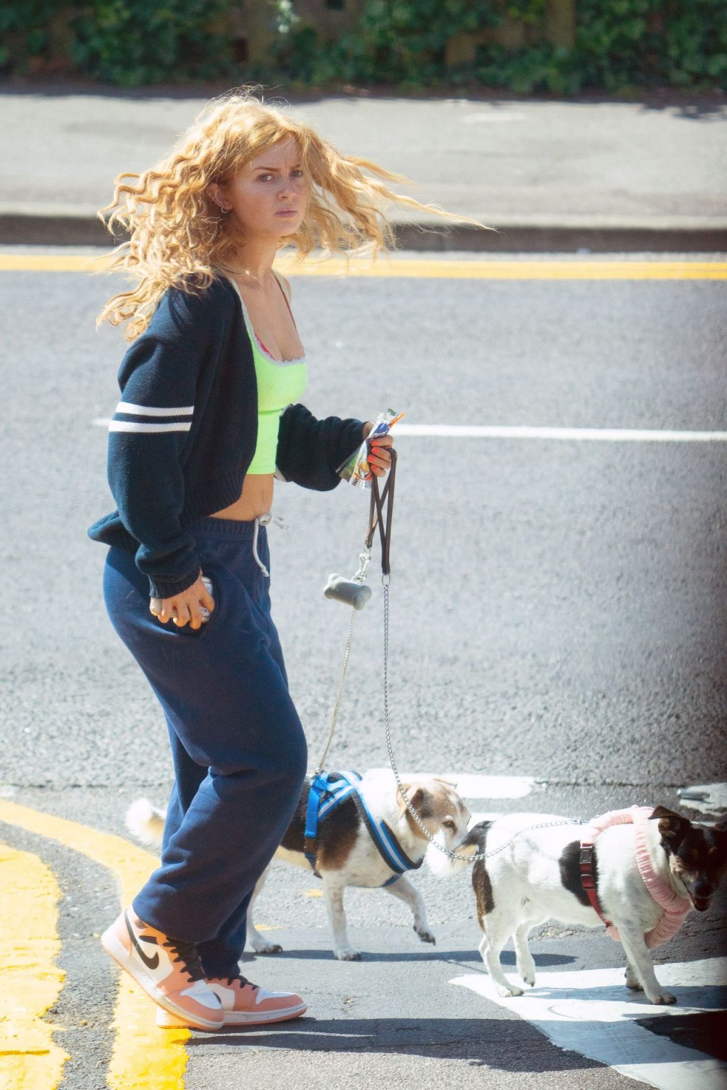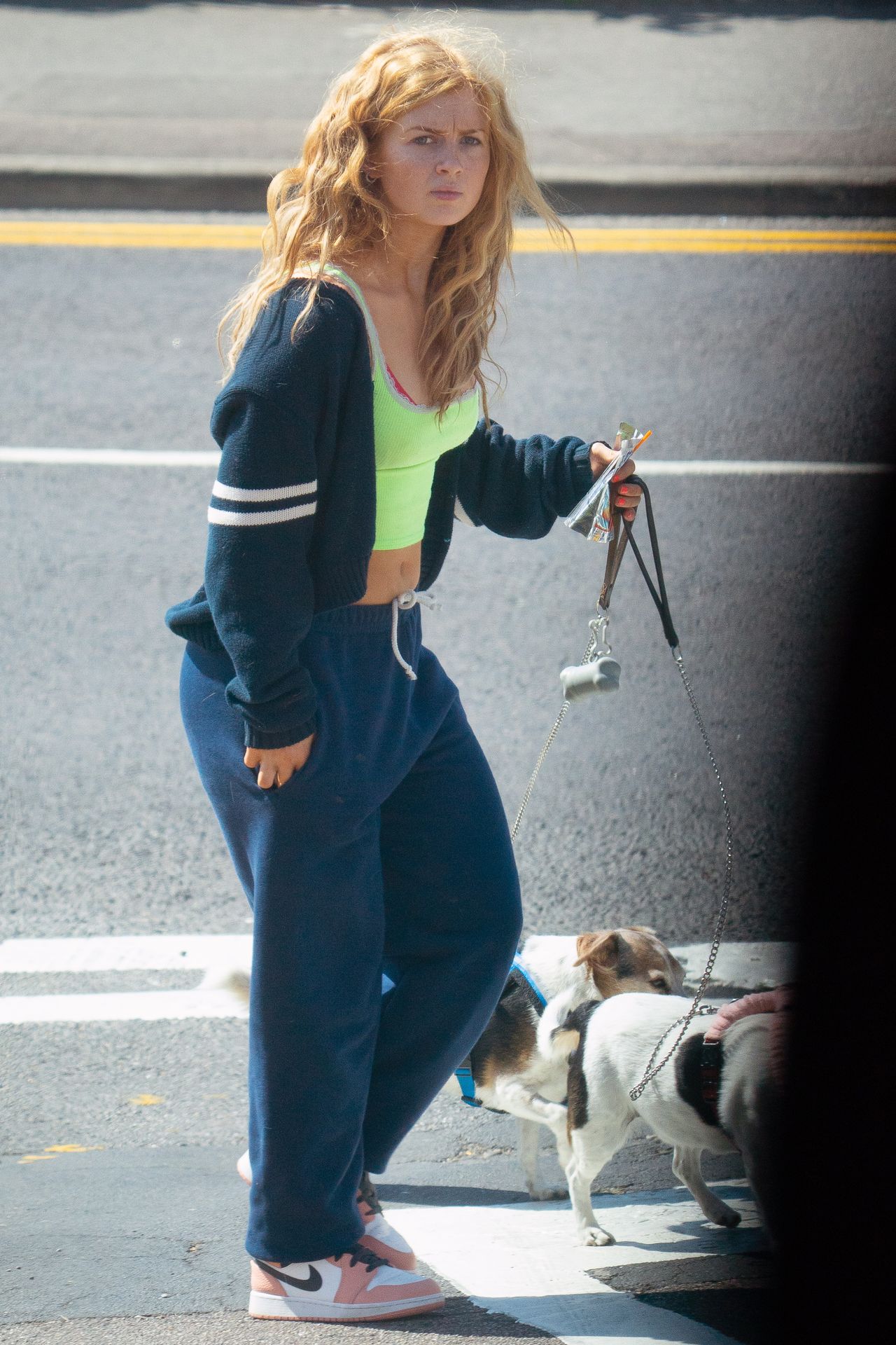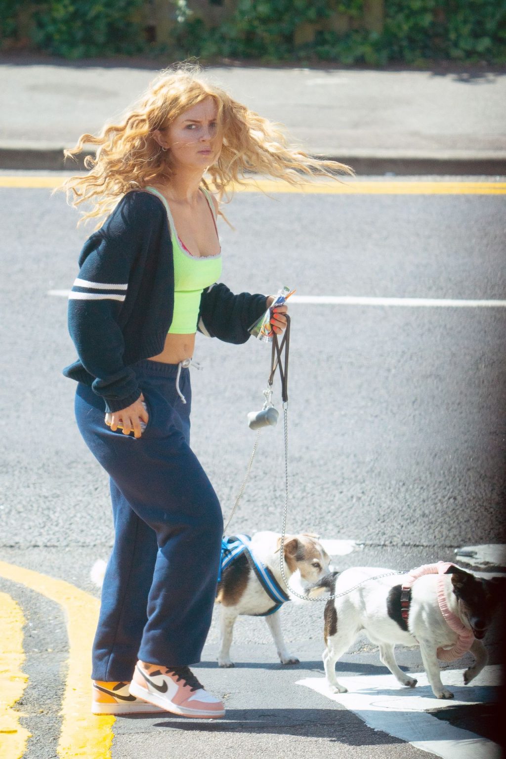 EastEnders la actriz Maisie Smith, quien interpreta a Tiffany, es vista hoy paseando a sus perros en Essex (2020).