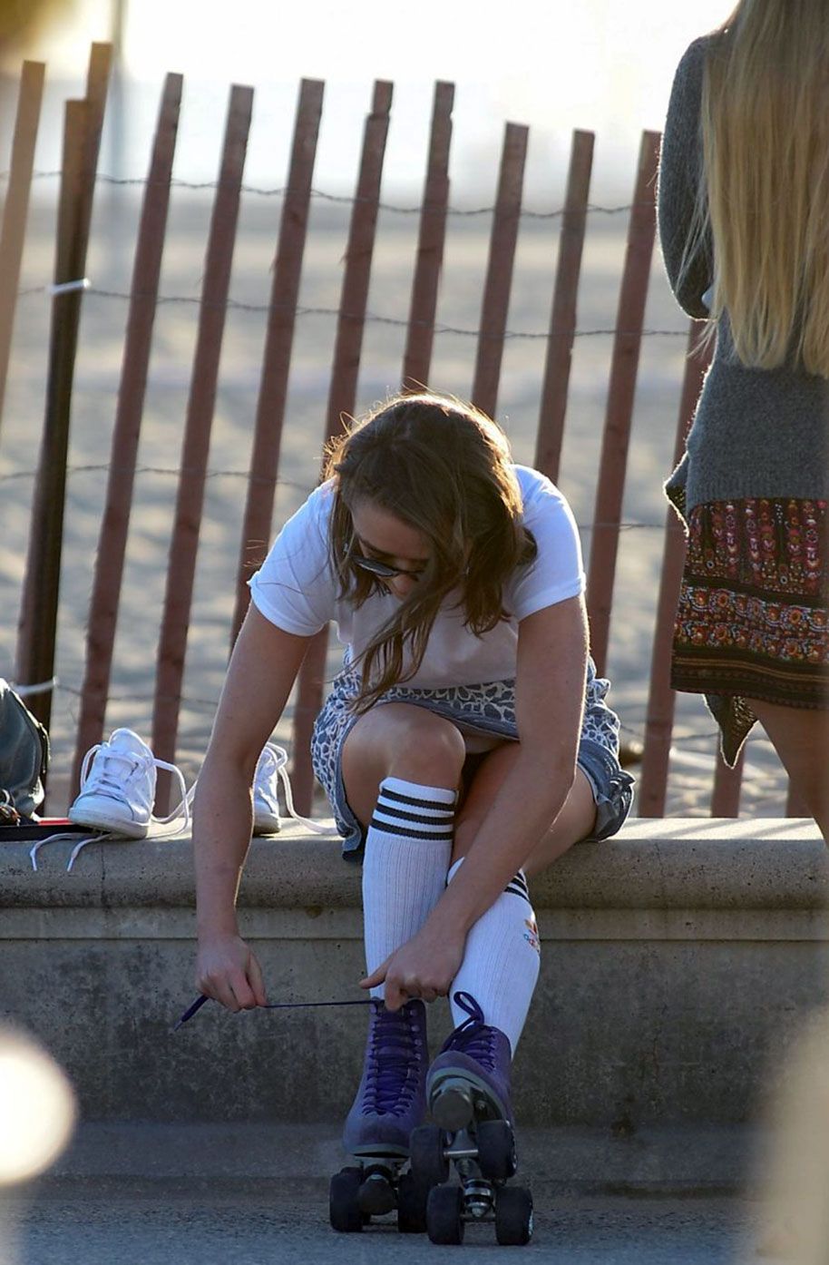 Here are some paparazzi shots of this actress! Maisie Williams was in Santa Monica, skating when her laces got untied (luckily for us), so she had to sit down and tie it! Then once again, luckily for us, she was wearing a mini skirt! So, when she sits down and spread her legs, we could see what she was wearing underneath! Some black panties, thongs even if I’m not wrong!