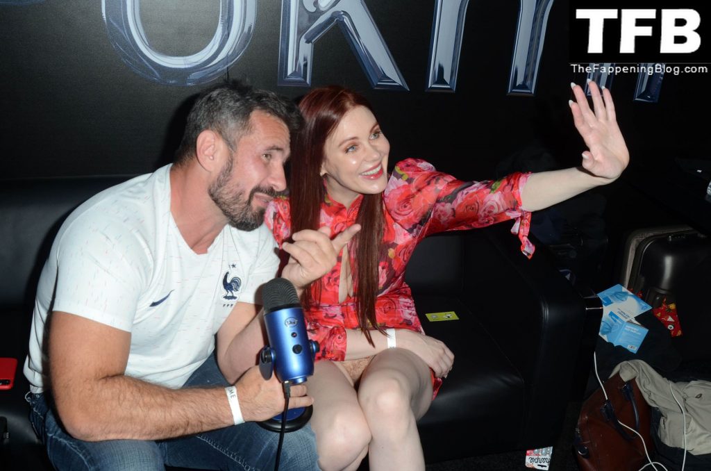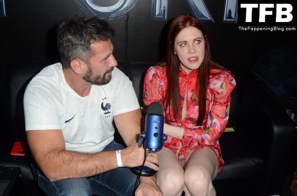 Maitland Ward tiene un serio fallo de vestuario mientras es entrevistada por su coprotagonista adulto Manuel Ferrara en la convención X3 en el Hollywood Palladium, 01/07/2022.