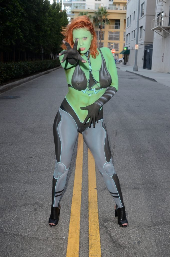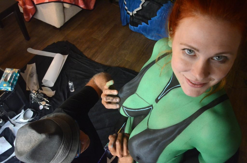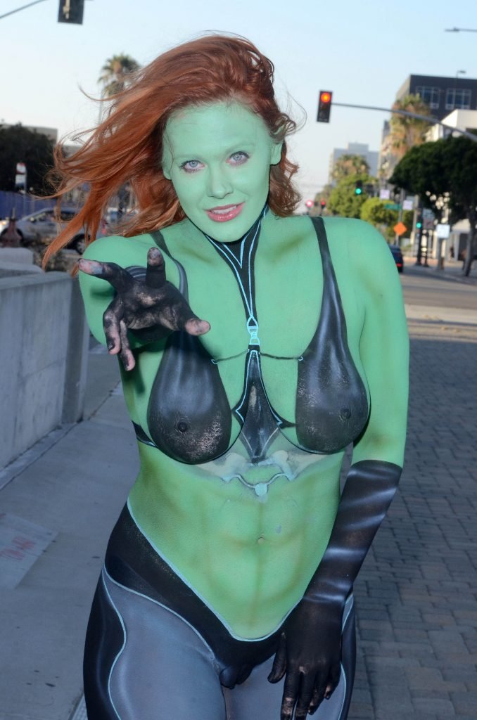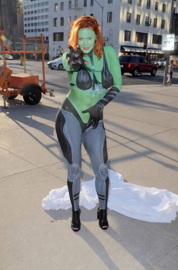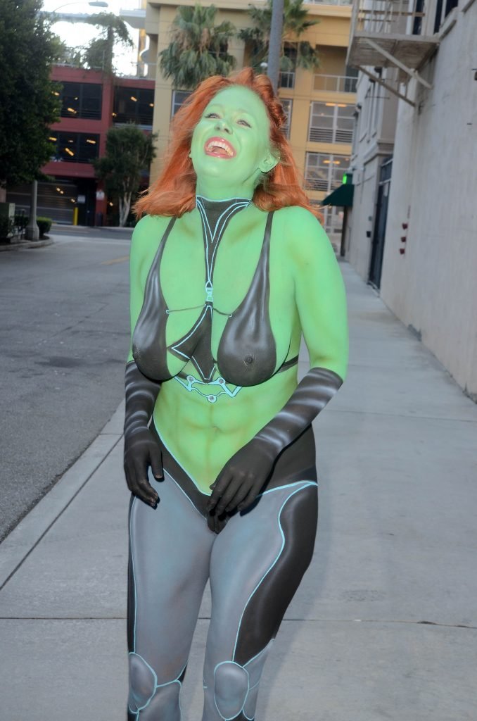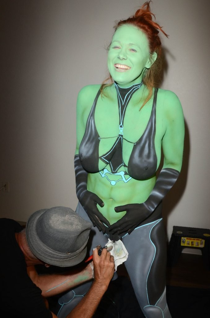 Maitland Ward tiene a su personaje personalizado llamado “Vetra” pintado en su cuerpo desnudo por el artista de aerografía Luciano Paesani antes de dirigirse al centro de San Diego para la San Diego Comic-Con, 21/07/2017.