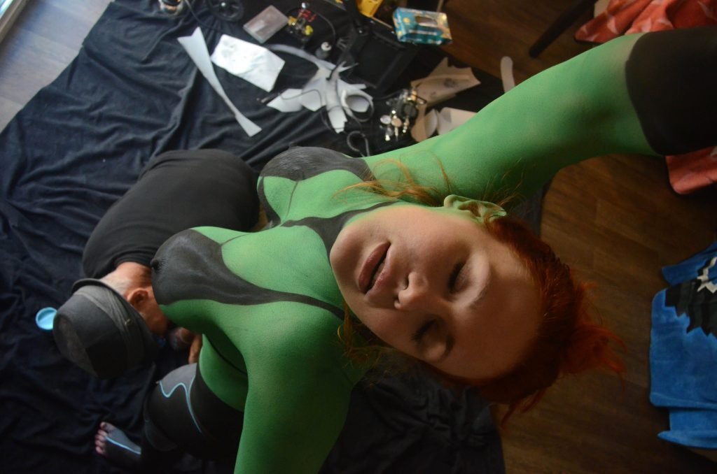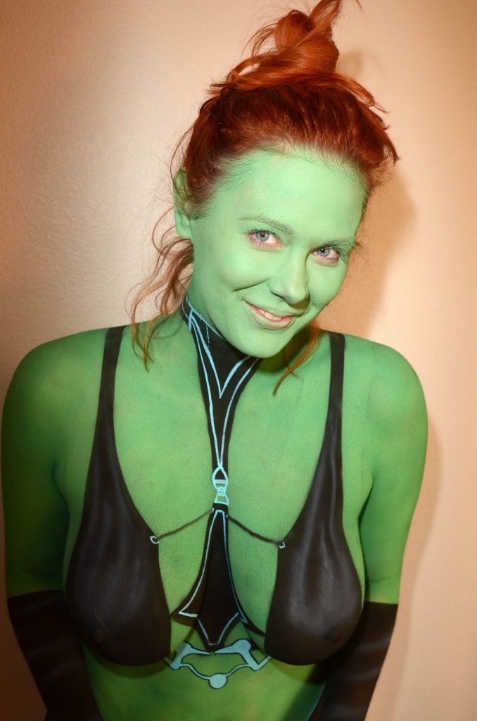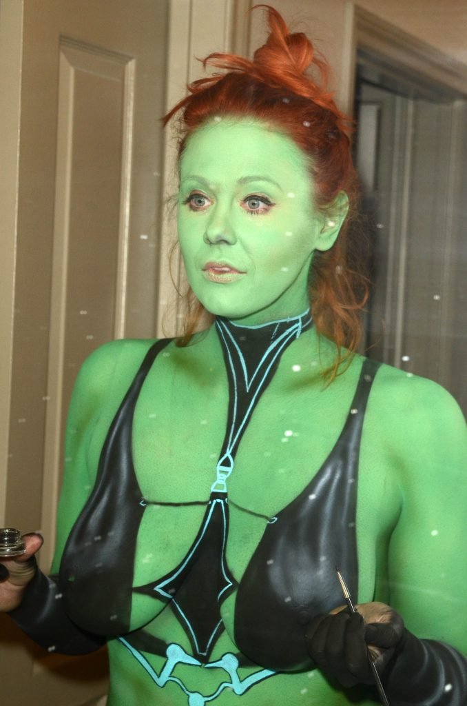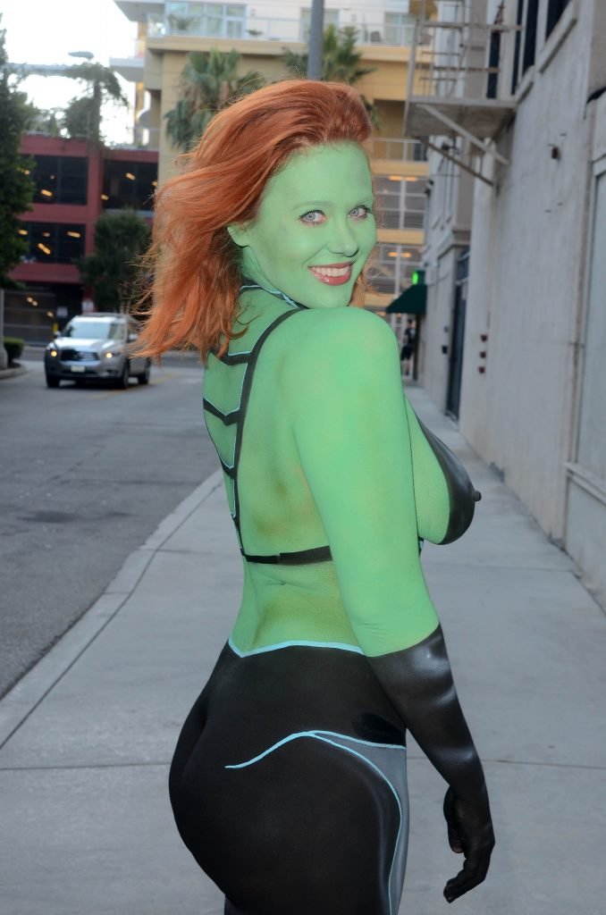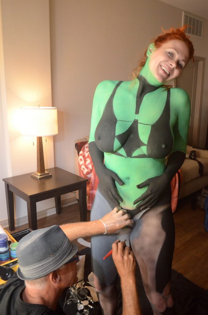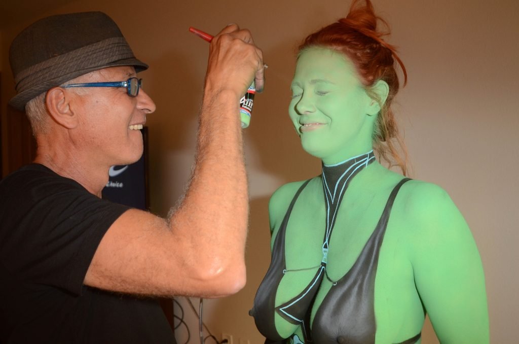 Maitland Ward tiene a su personaje personalizado llamado “Vetra” pintado en su cuerpo desnudo por el artista de aerografía Luciano Paesani antes de dirigirse al centro de San Diego para la San Diego Comic-Con, 21/07/2017.