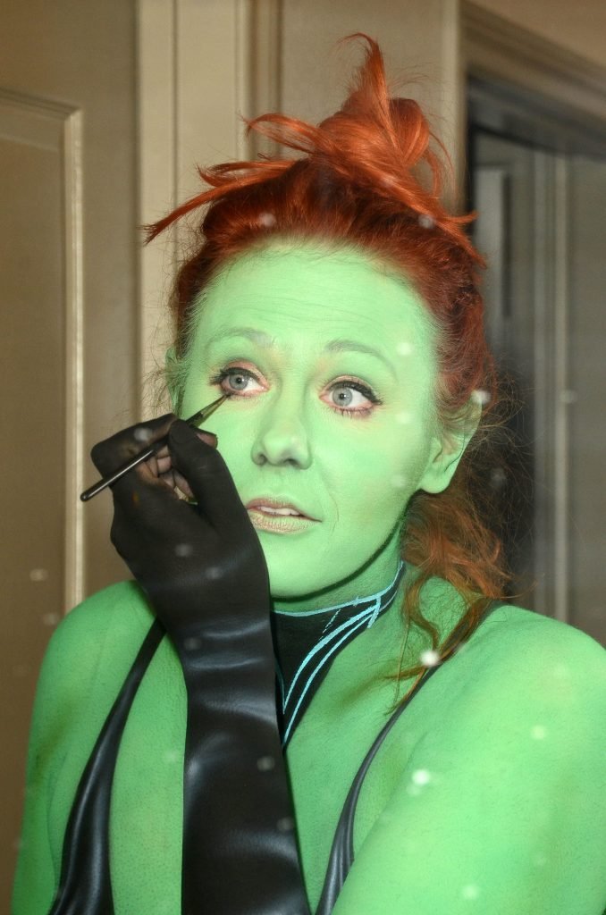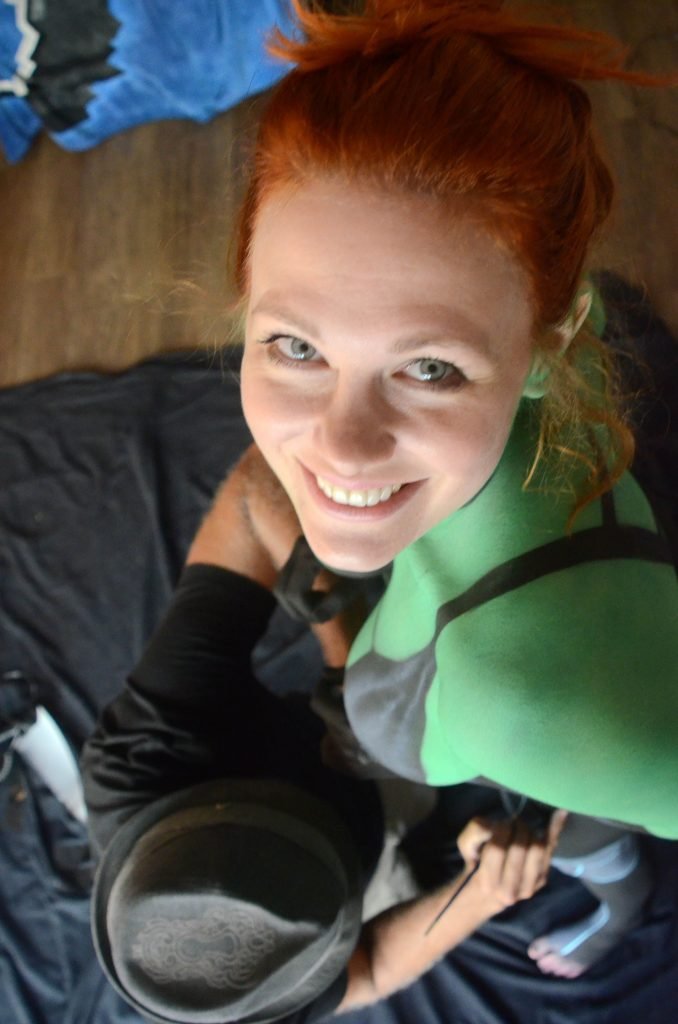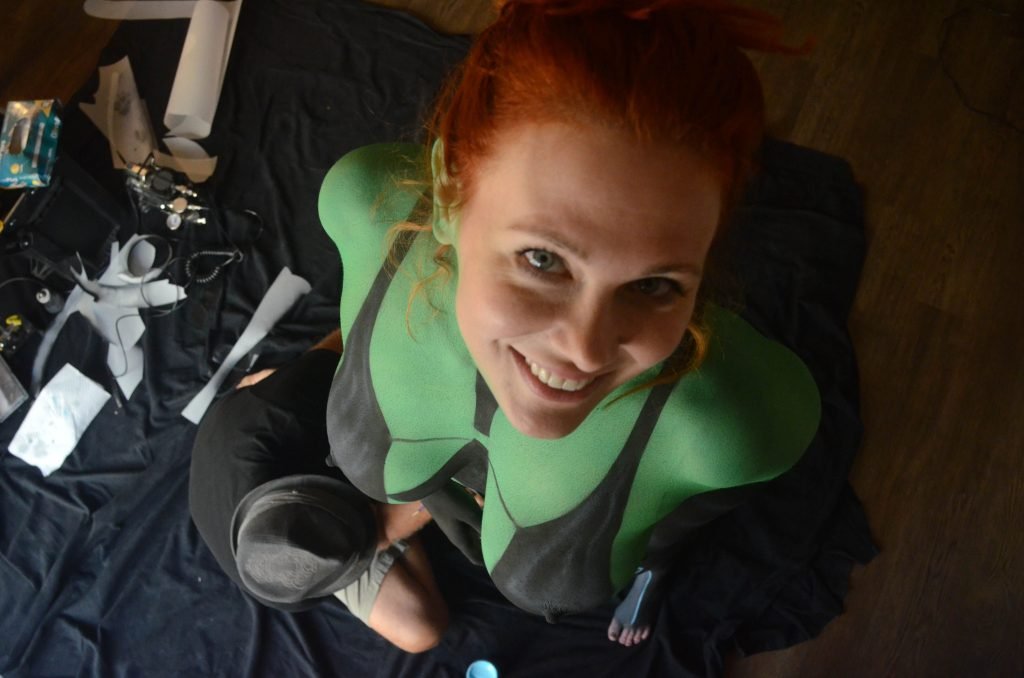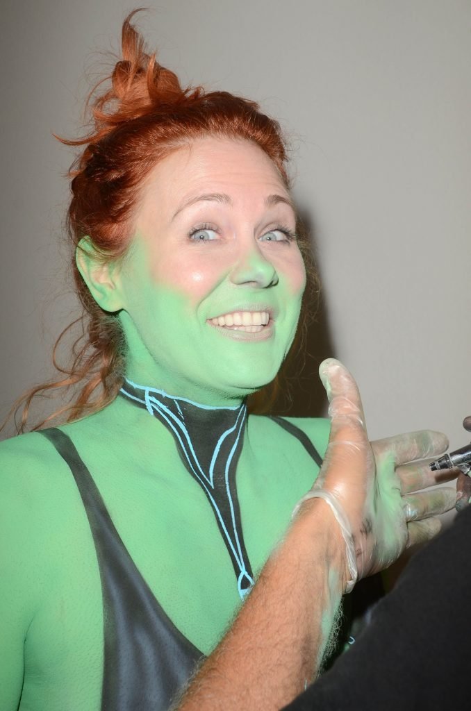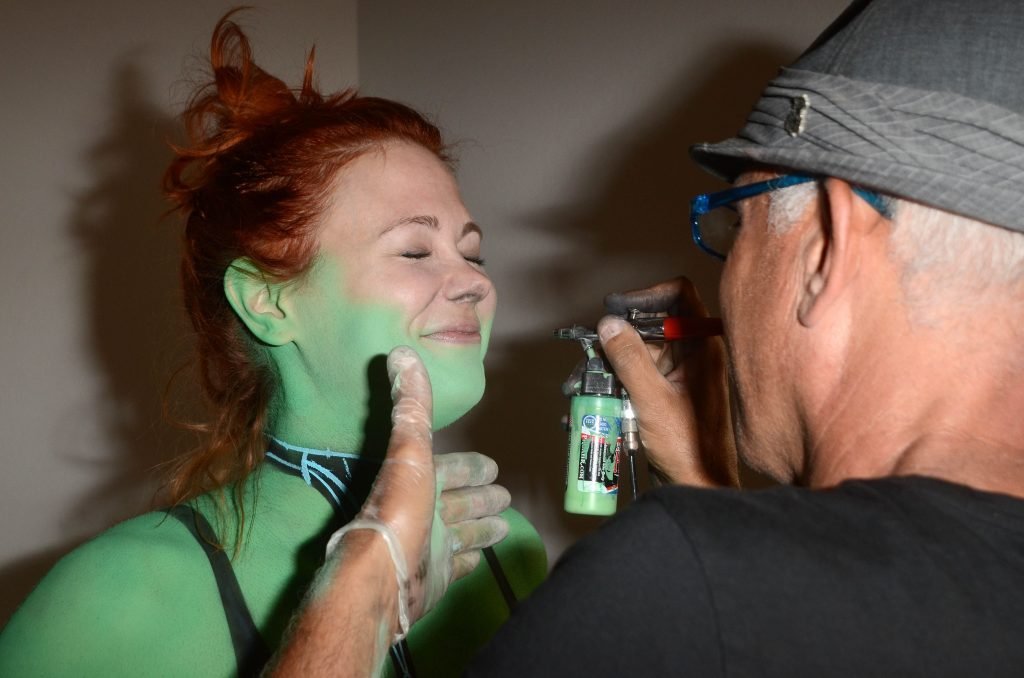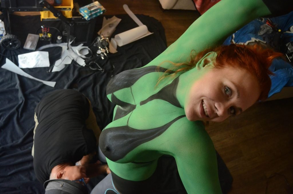 Maitland Ward tiene a su personaje personalizado llamado “Vetra” pintado en su cuerpo desnudo por el artista de aerografía Luciano Paesani antes de dirigirse al centro de San Diego para la San Diego Comic-Con, 21/07/2017.
