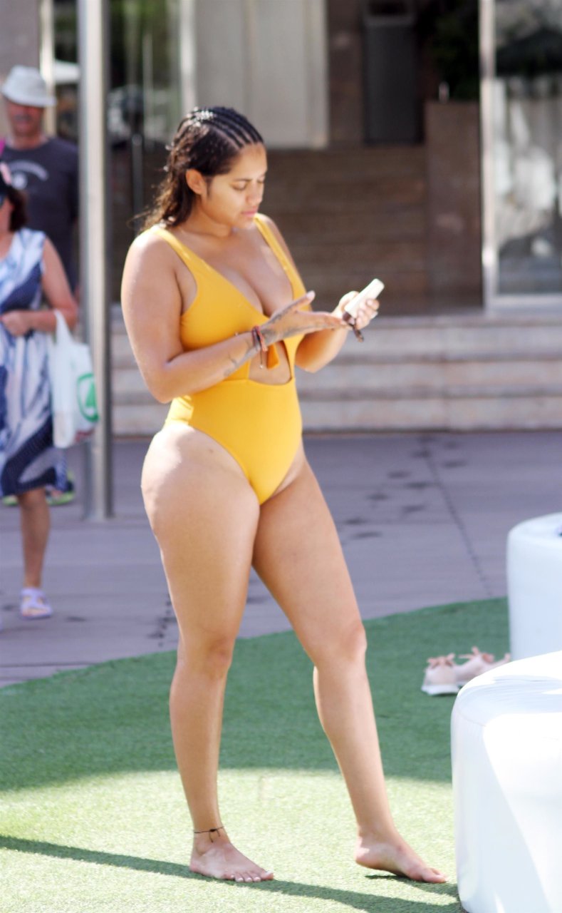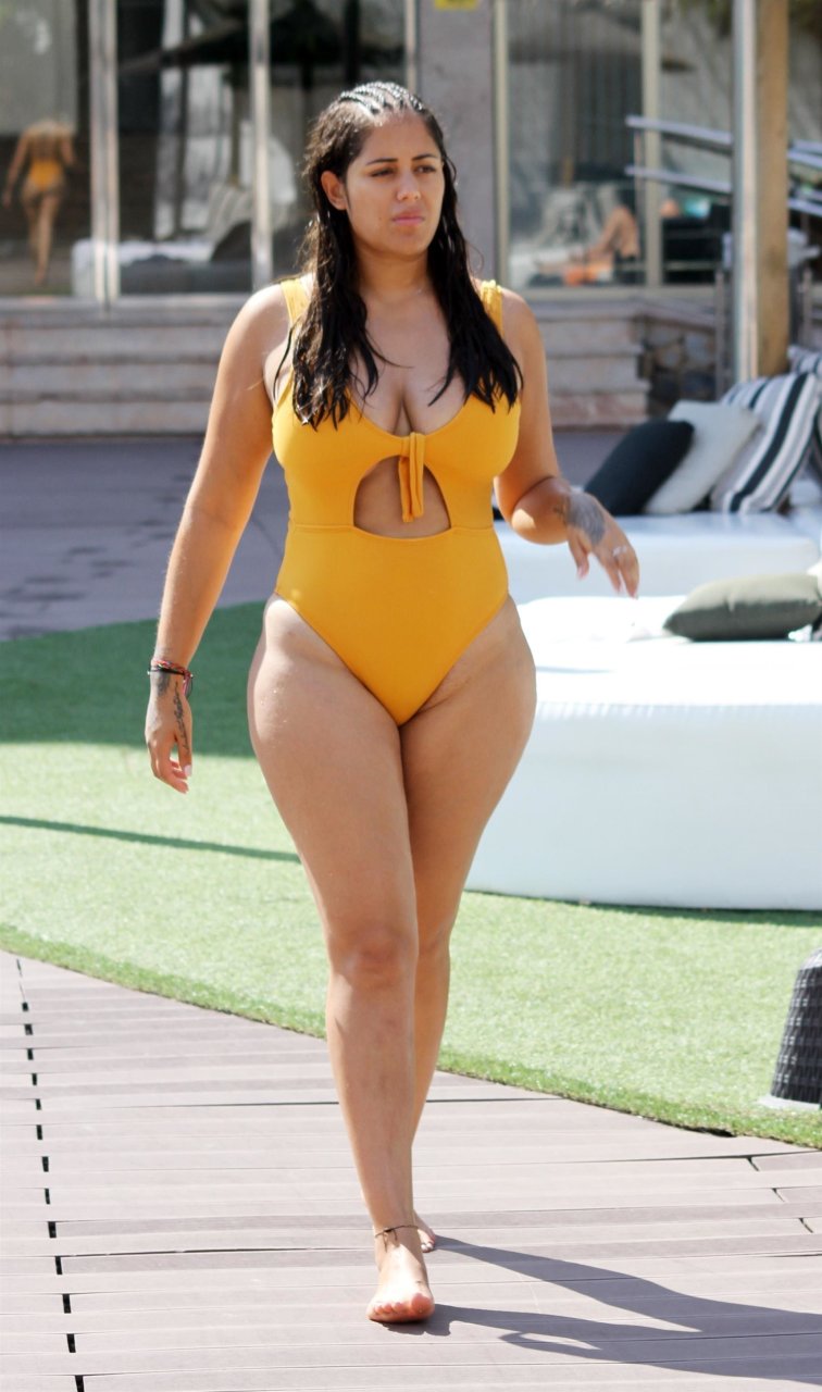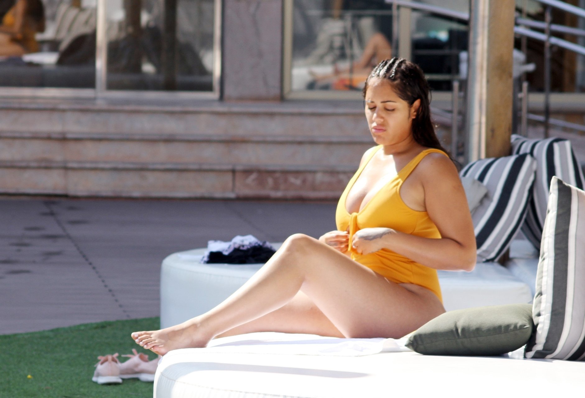 La ex estrella de “Love Island” Malin Andersson fue fotografiada tomando el sol y mostrando escote con su traje de baño entero color mostaza mientras estaba de vacaciones en Mallorca, 09/03/2018. Malin, que recientemente anunció que está embarazada, muestra su barriga de embarazo y su levantamiento de pecho y glúteos 7k. Malin fue a nadar y después se aplicó protector solar antes de tomar el sol junto a la piscina.