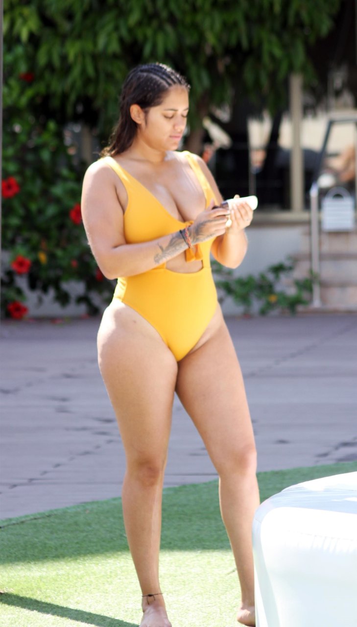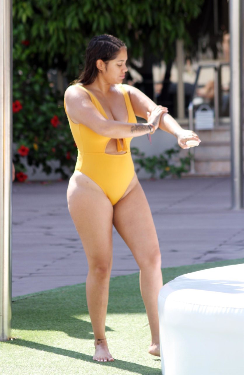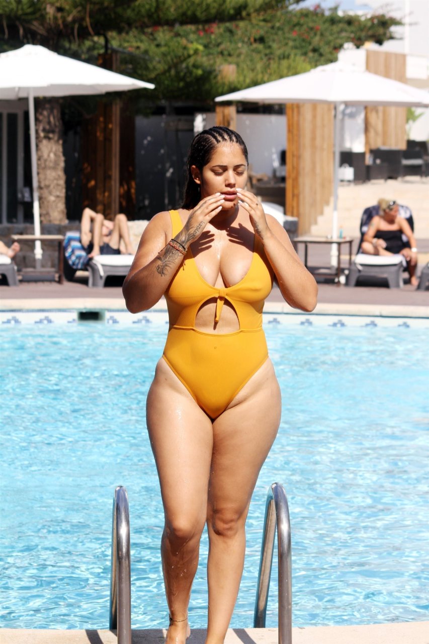 La ex estrella de “Love Island” Malin Andersson fue fotografiada tomando el sol y mostrando escote con su traje de baño entero color mostaza mientras estaba de vacaciones en Mallorca, 09/03/2018. Malin, que recientemente anunció que está embarazada, muestra su barriga de embarazo y su levantamiento de pecho y glúteos 7k. Malin fue a nadar y después se aplicó protector solar antes de tomar el sol junto a la piscina.