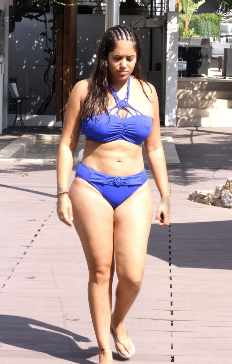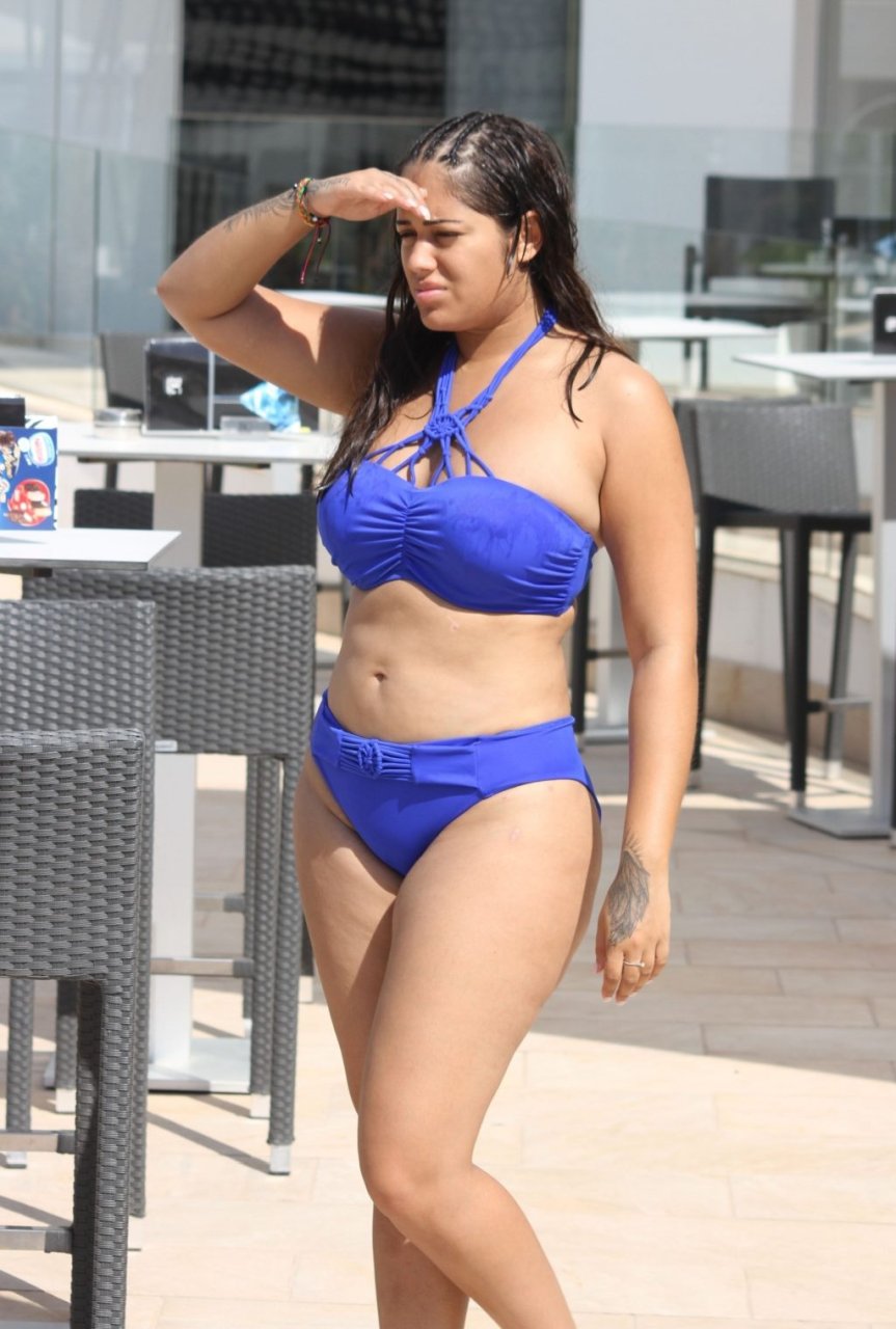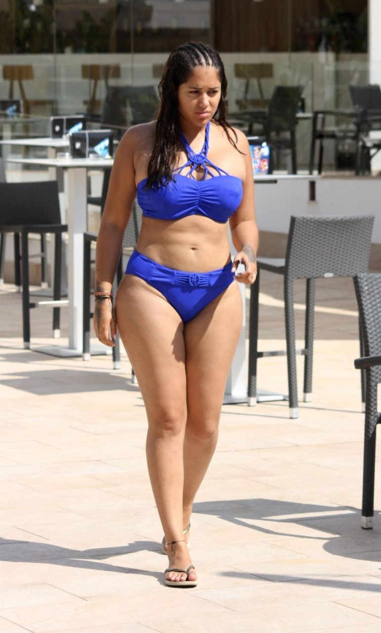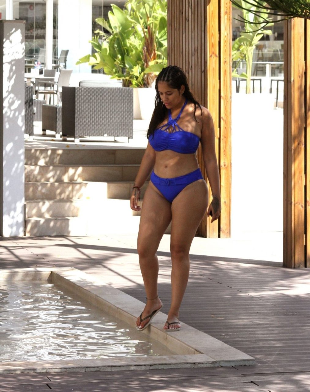 La ex estrella de “Love Island” Malin Andersson fue vista de vacaciones en Mallorca (verano de 2018). La sexy estrella de reality llevaba un pequeño y atrevido bikini azul mientras caminaba junto a la piscina por los terrenos del resort.