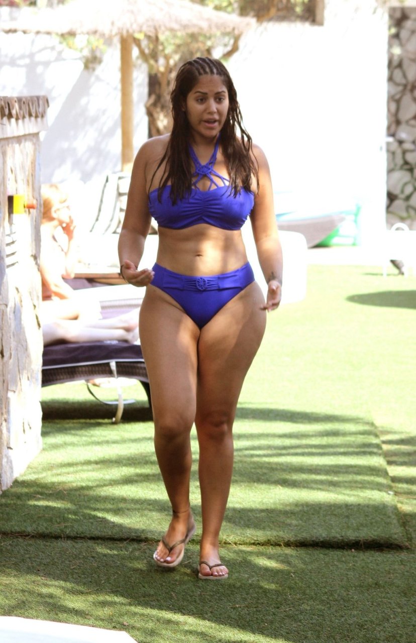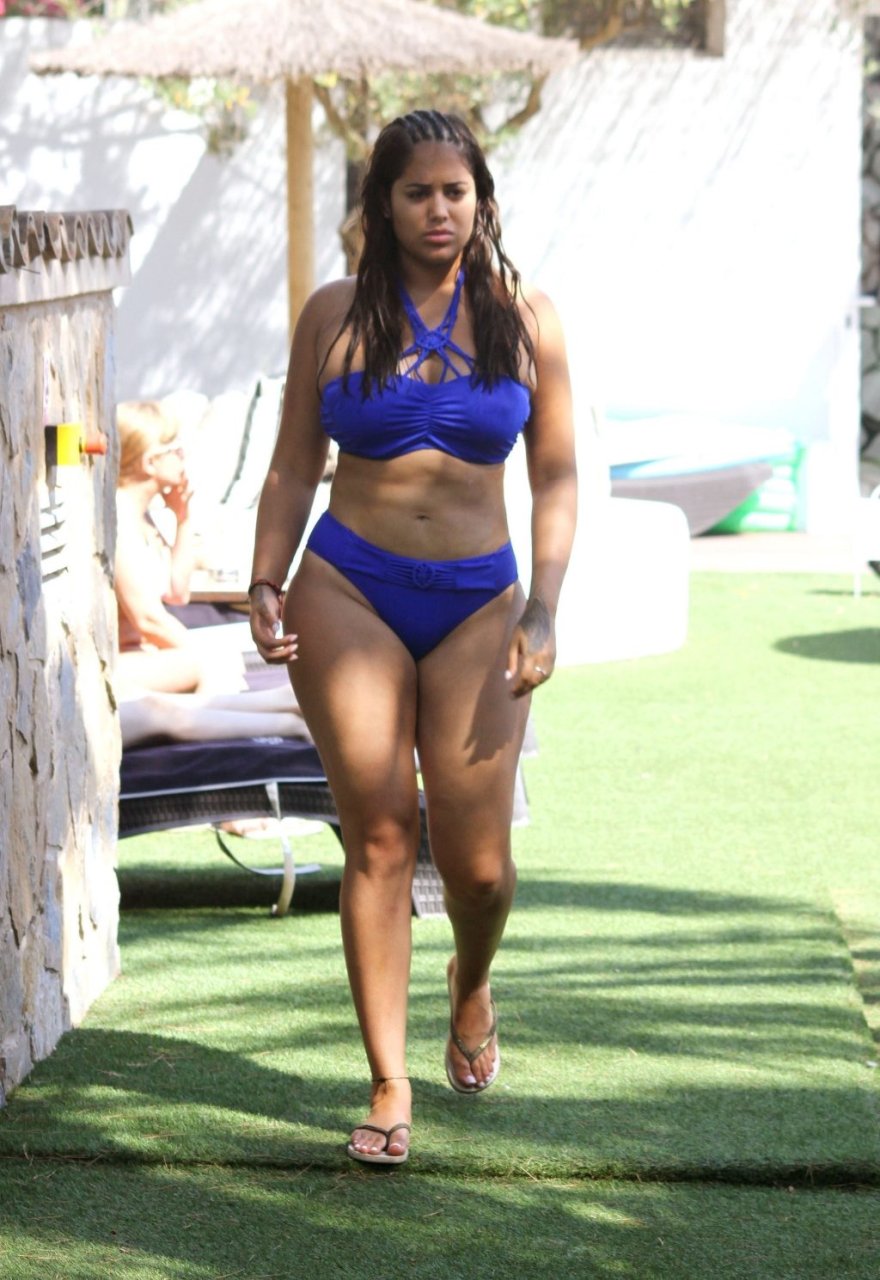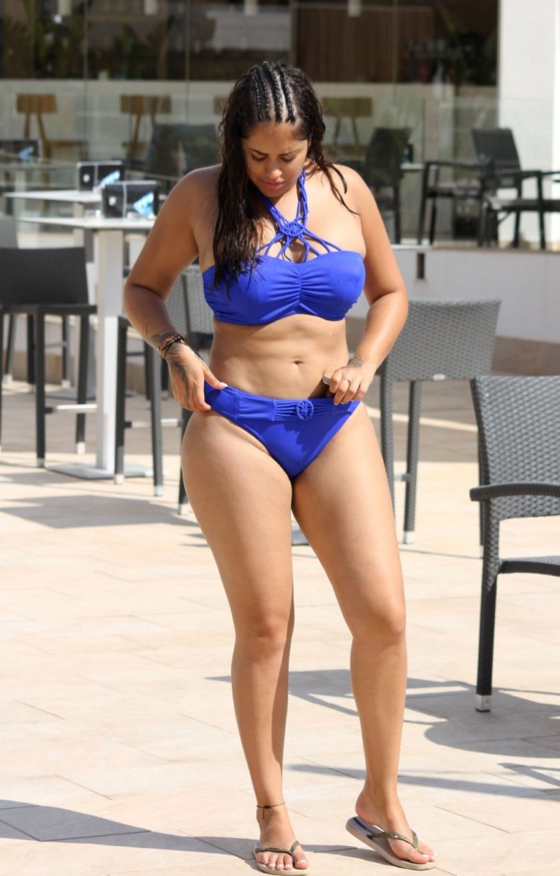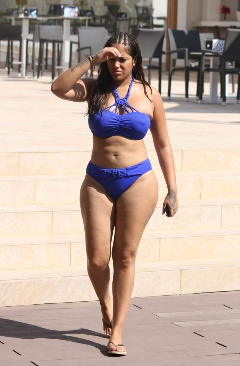 La ex estrella de “Love Island” Malin Andersson fue vista de vacaciones en Mallorca (verano de 2018). La sexy estrella de reality llevaba un pequeño y atrevido bikini azul mientras caminaba junto a la piscina por los terrenos del resort.