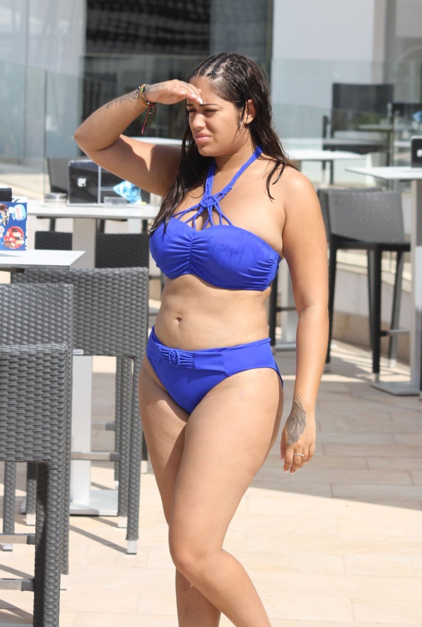 La ex estrella de “Love Island” Malin Andersson fue vista de vacaciones en Mallorca (verano de 2018). La sexy estrella de reality llevaba un pequeño y atrevido bikini azul mientras caminaba junto a la piscina por los terrenos del resort.