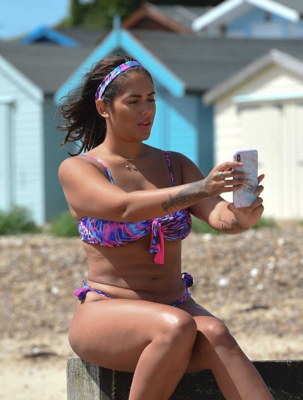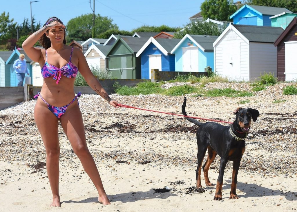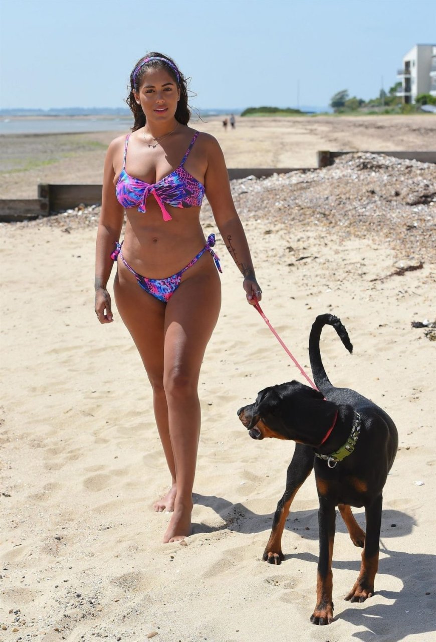 Malin Andersson deslumbra con un bikini floral mientras toma un descanso de una sesión de fotos sobre confianza corporal en Essex, 29/06/2019. Se puede ver a Malin feliz mientras pasea a un adorable perro en la playa.