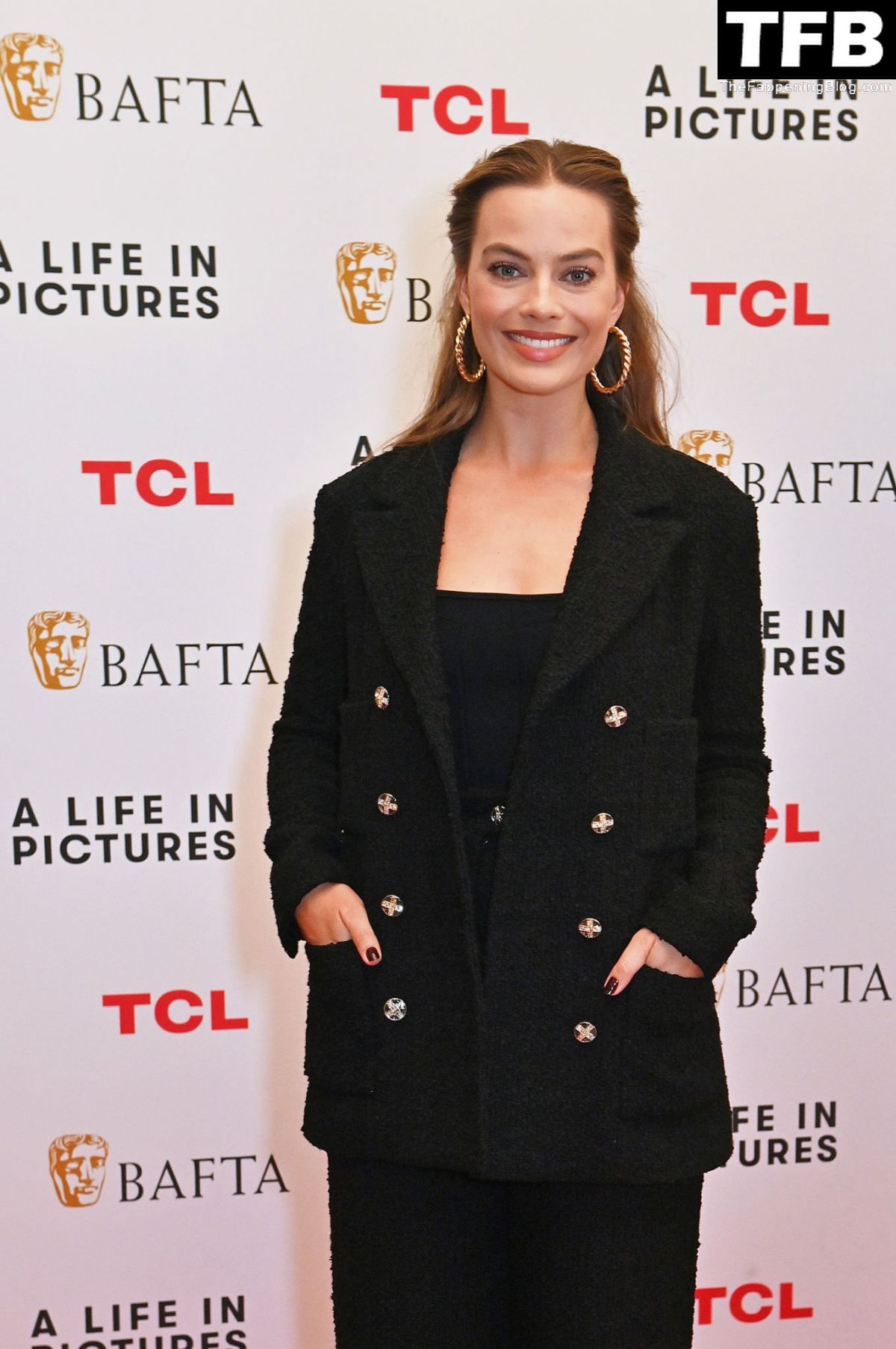 Margot Robbie es fotografiada en BAFTA A Life in Pictures en Londres, 22/11/2022. La actriz sale de BAFTA en Piccadilly. Sonríe a los fans mientras regresa a su hotel.