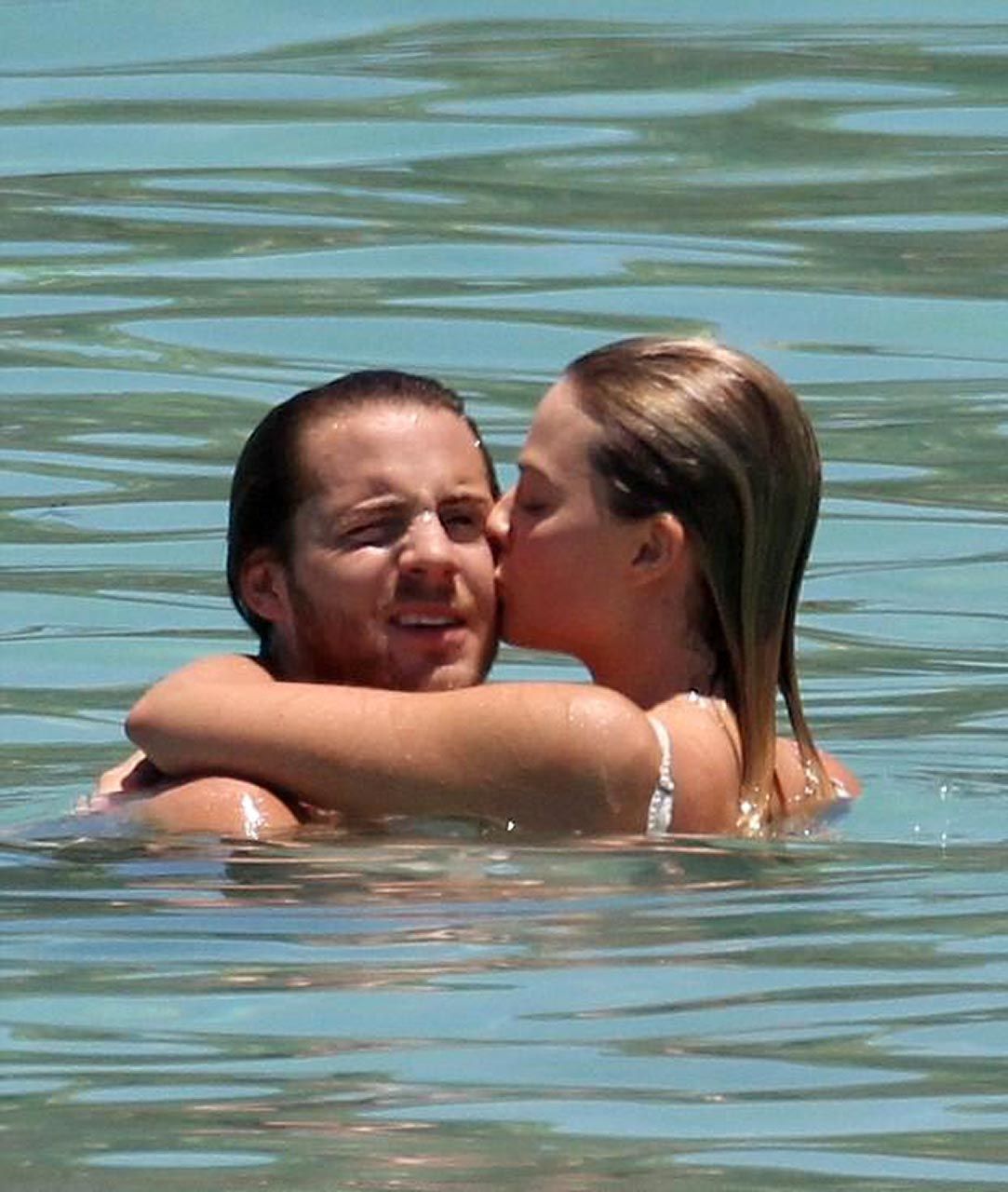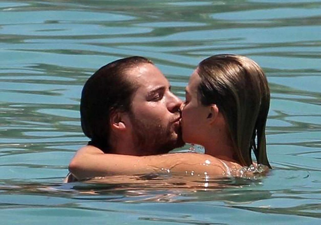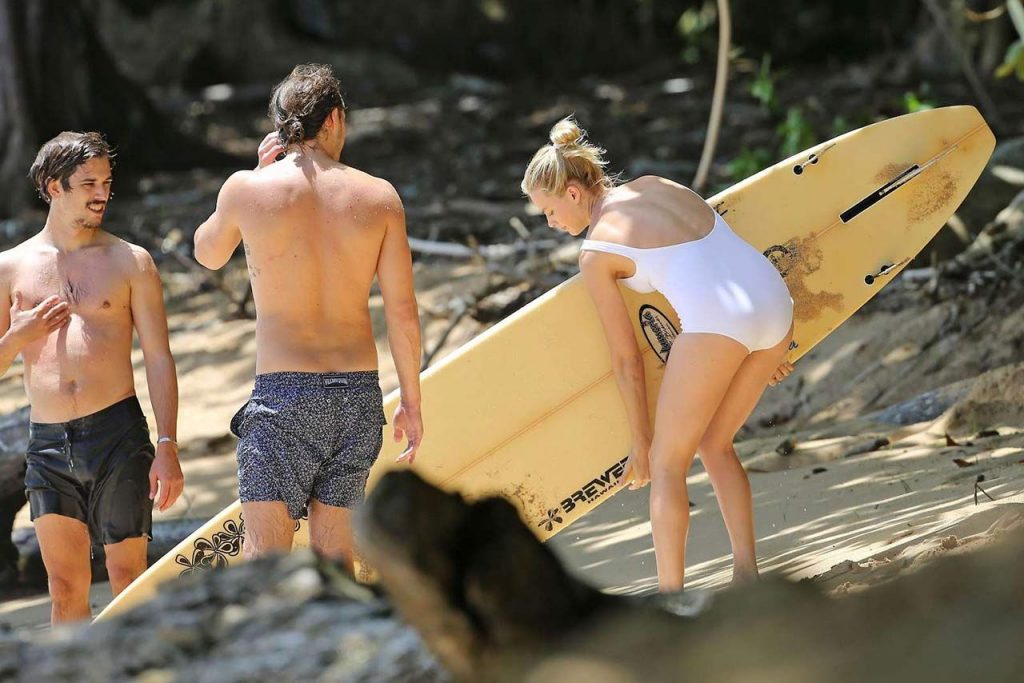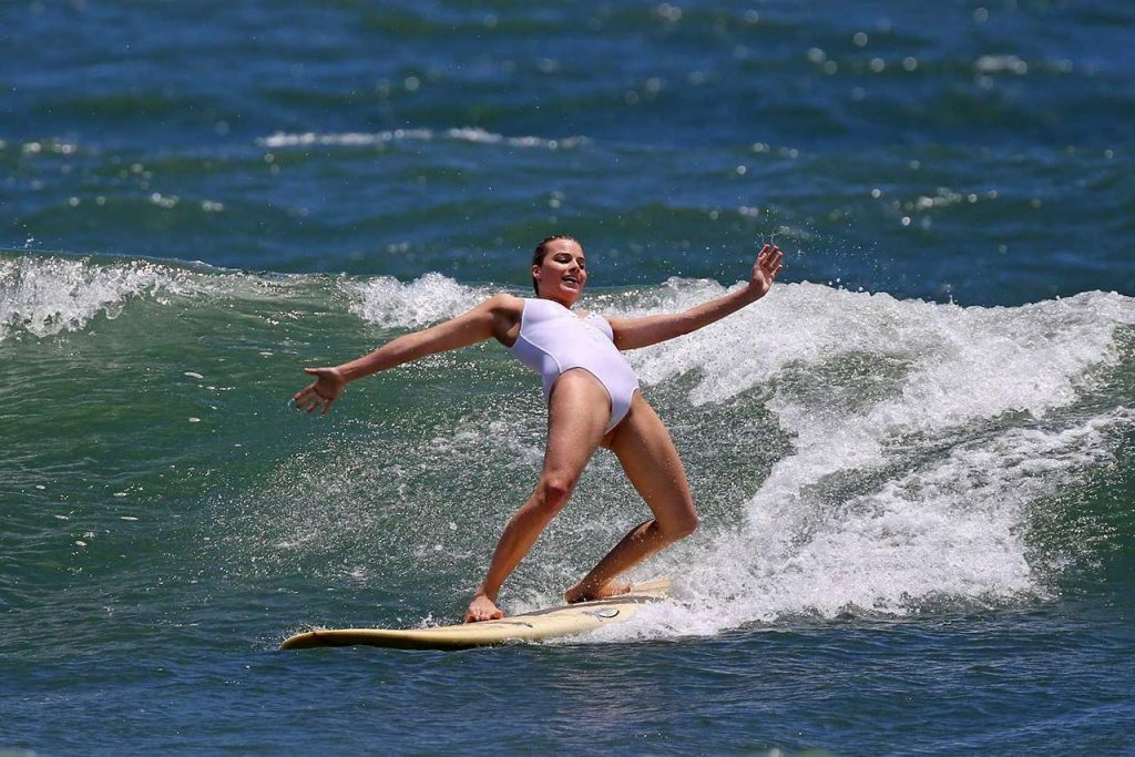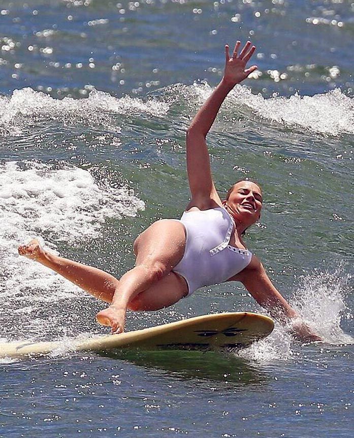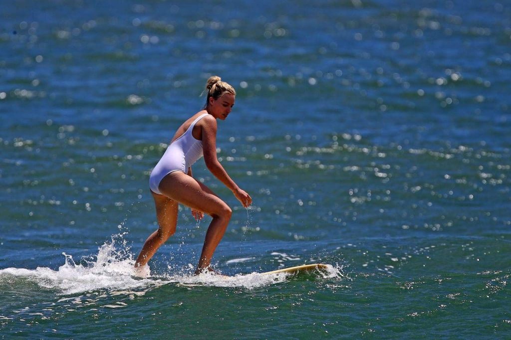 She is topless while sunbathing her boobs with her husband, Tom Ackerley, in Hawaii. She was giving us a great view of her lovely small tits and nipples! The couple then had a great time kissing and swimming; then she tried to surf, which went well! Margot Robbie showed a pussy cameltoe and ass in a white swimsuit while surfing!