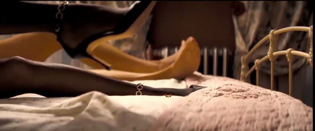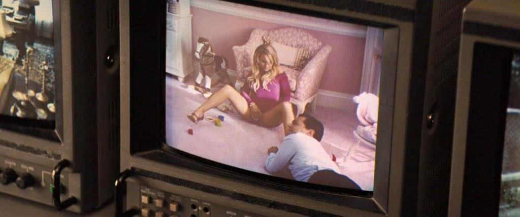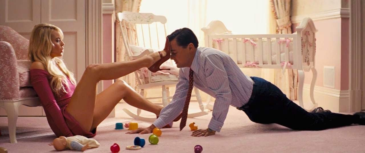 In the 2nd scene, we see perfect Margot Robbie’s pussy while sitting on the floor and resting against a chair. Then we see her putting her knees up and spreads her long legs. She is giving her husband a great look at her vagina without panties! Leo tries to get closer before she stops him with her red high heel, and we see Margot’s hands between legs.