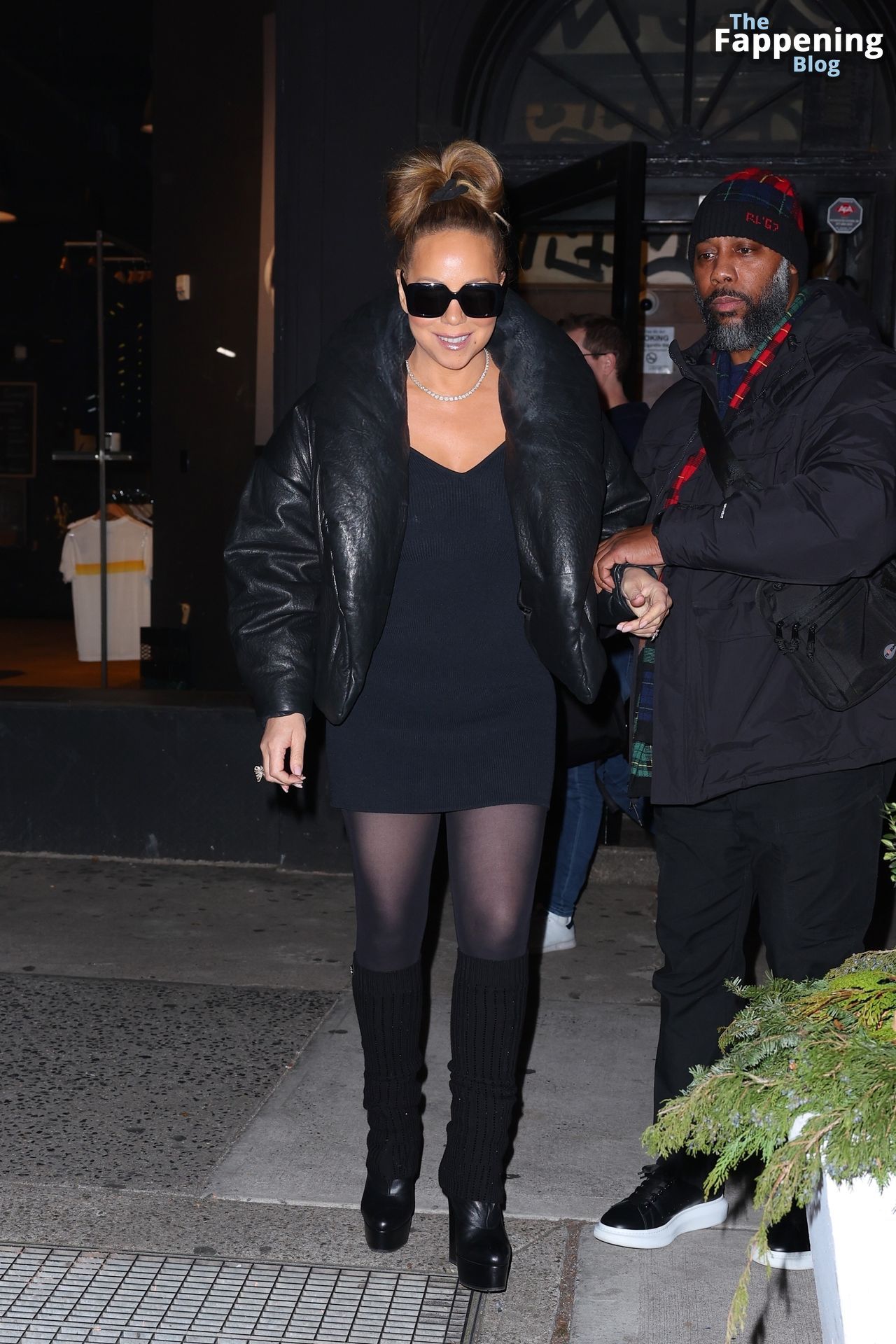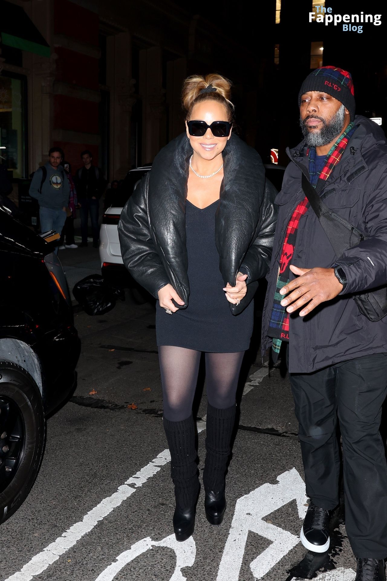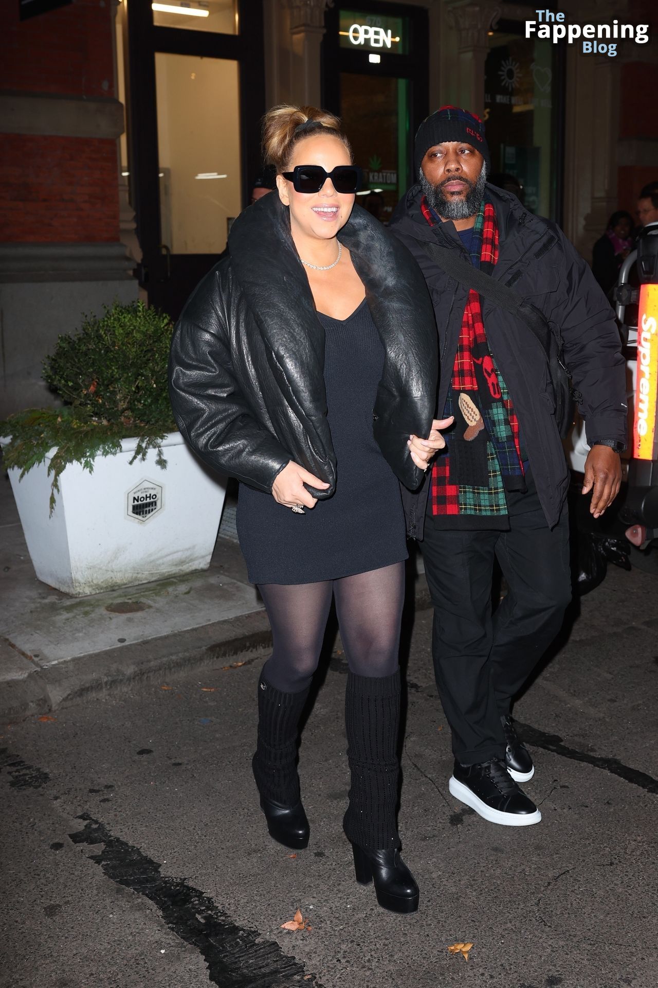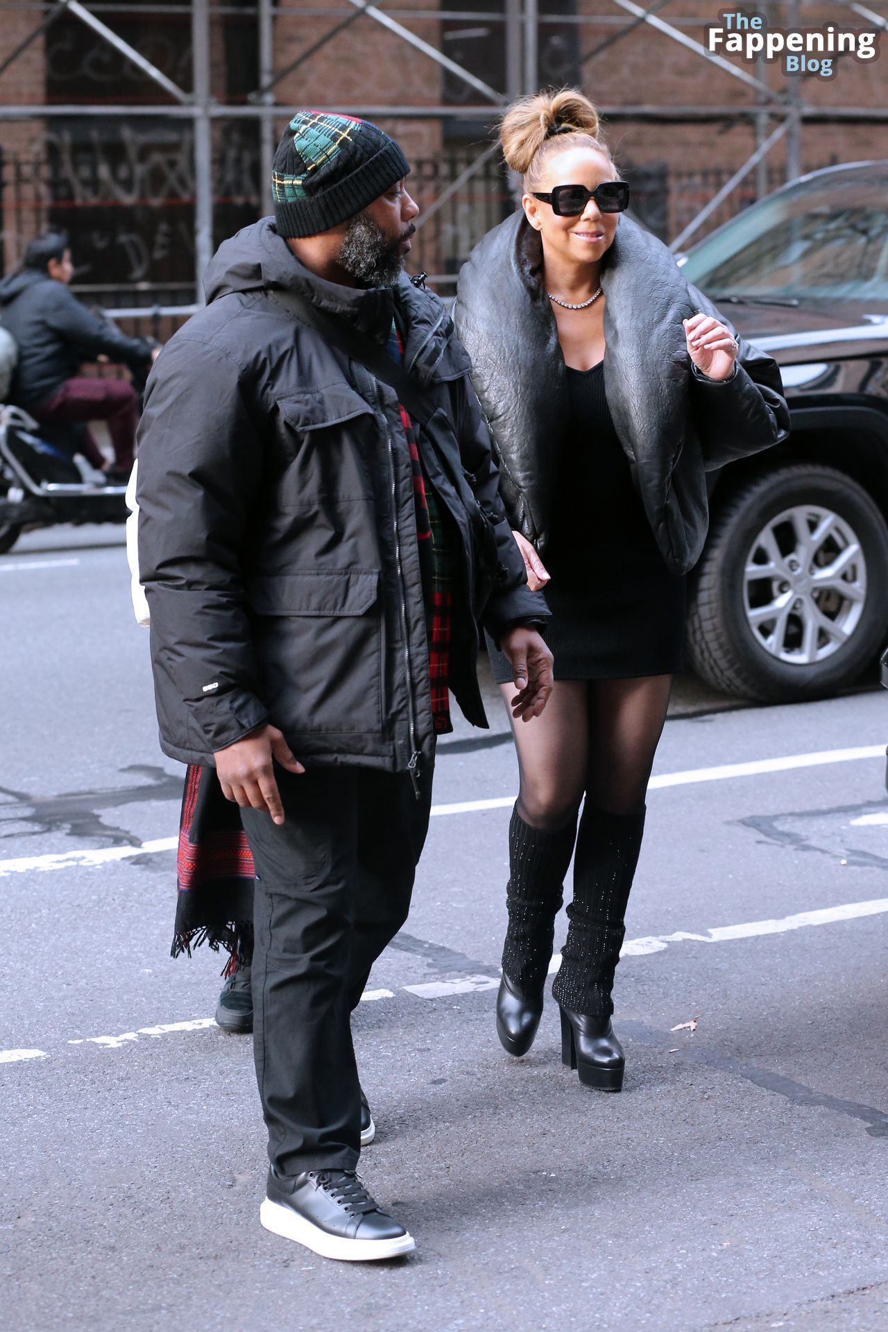 Icono de la música Mariah Carey sonríe a la cámara, saliendo con gracia de un estudio de grabación en el moderno barrio de Soho, Nueva York, insinuando posibles nuevos proyectos musicales.