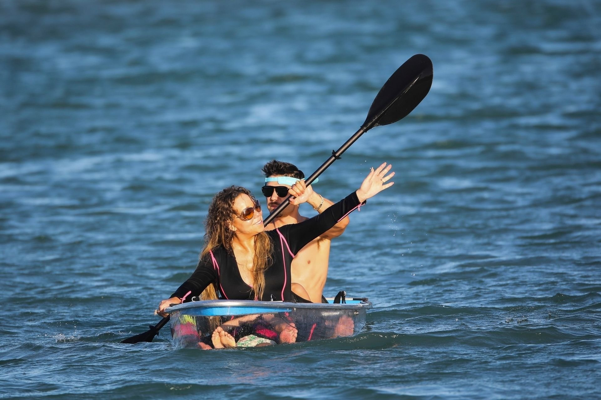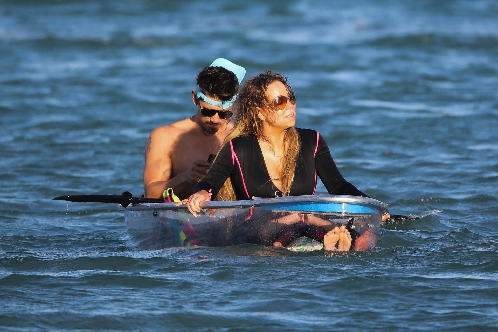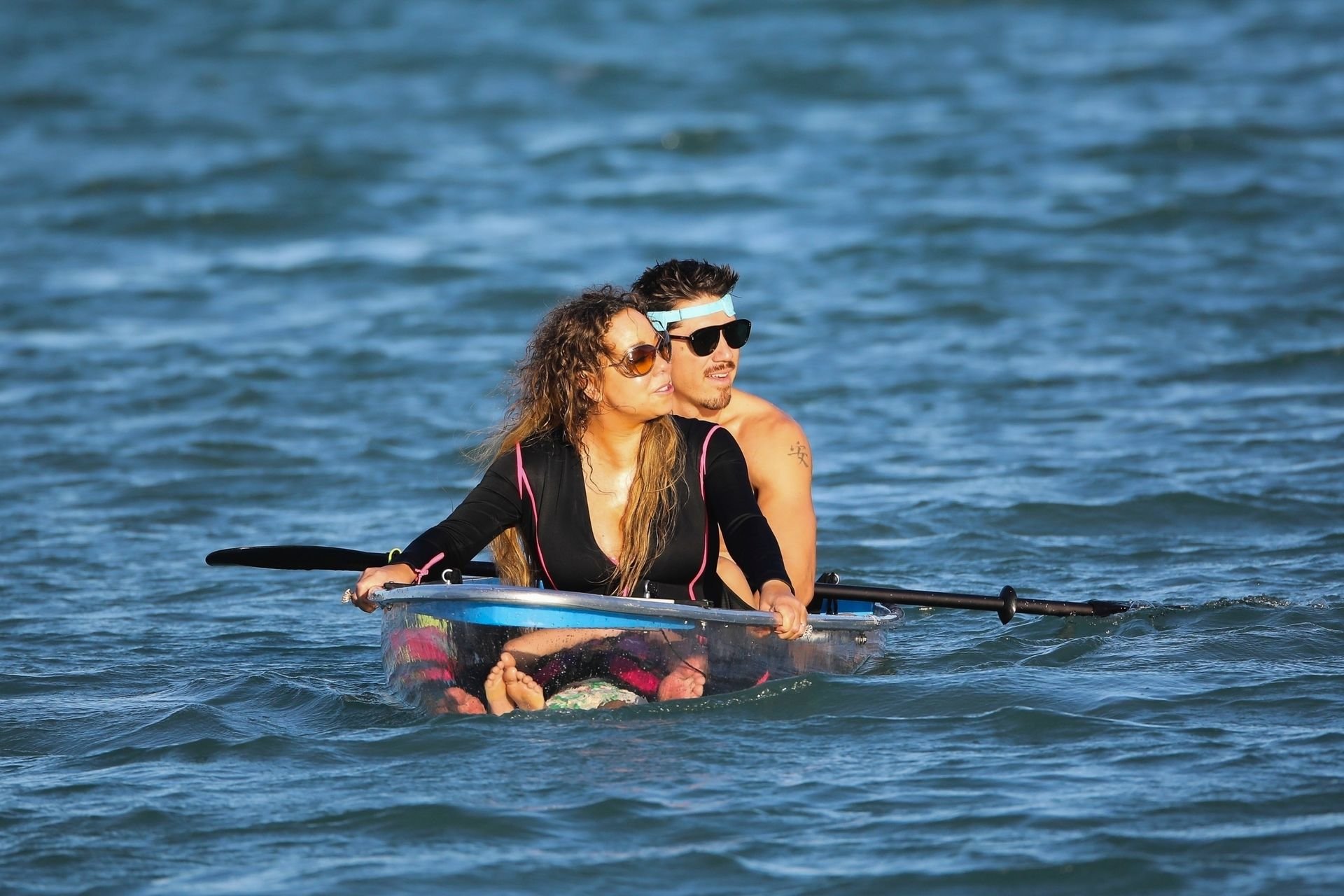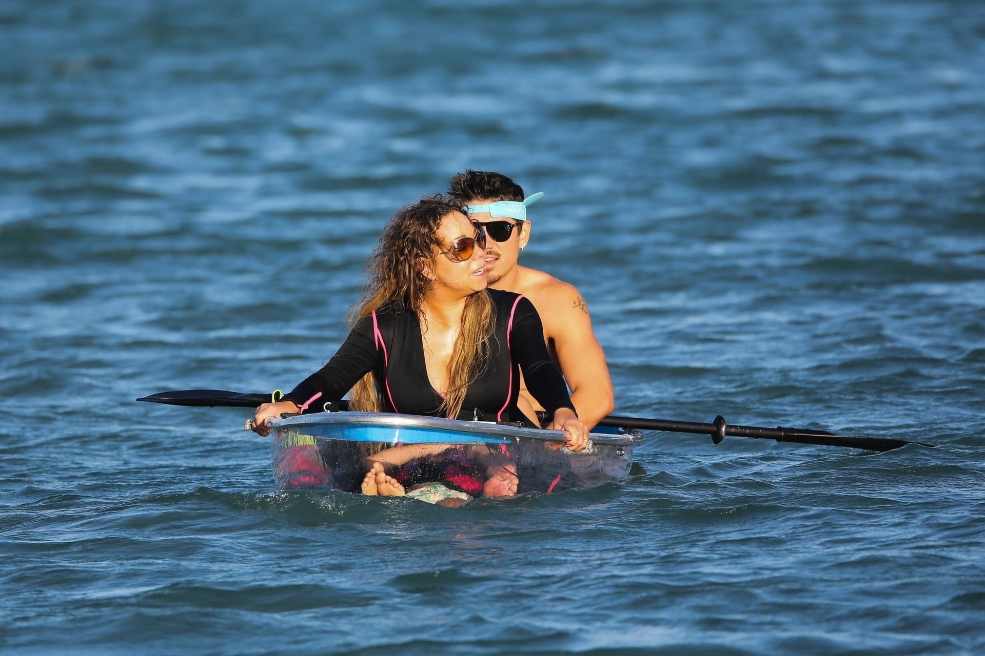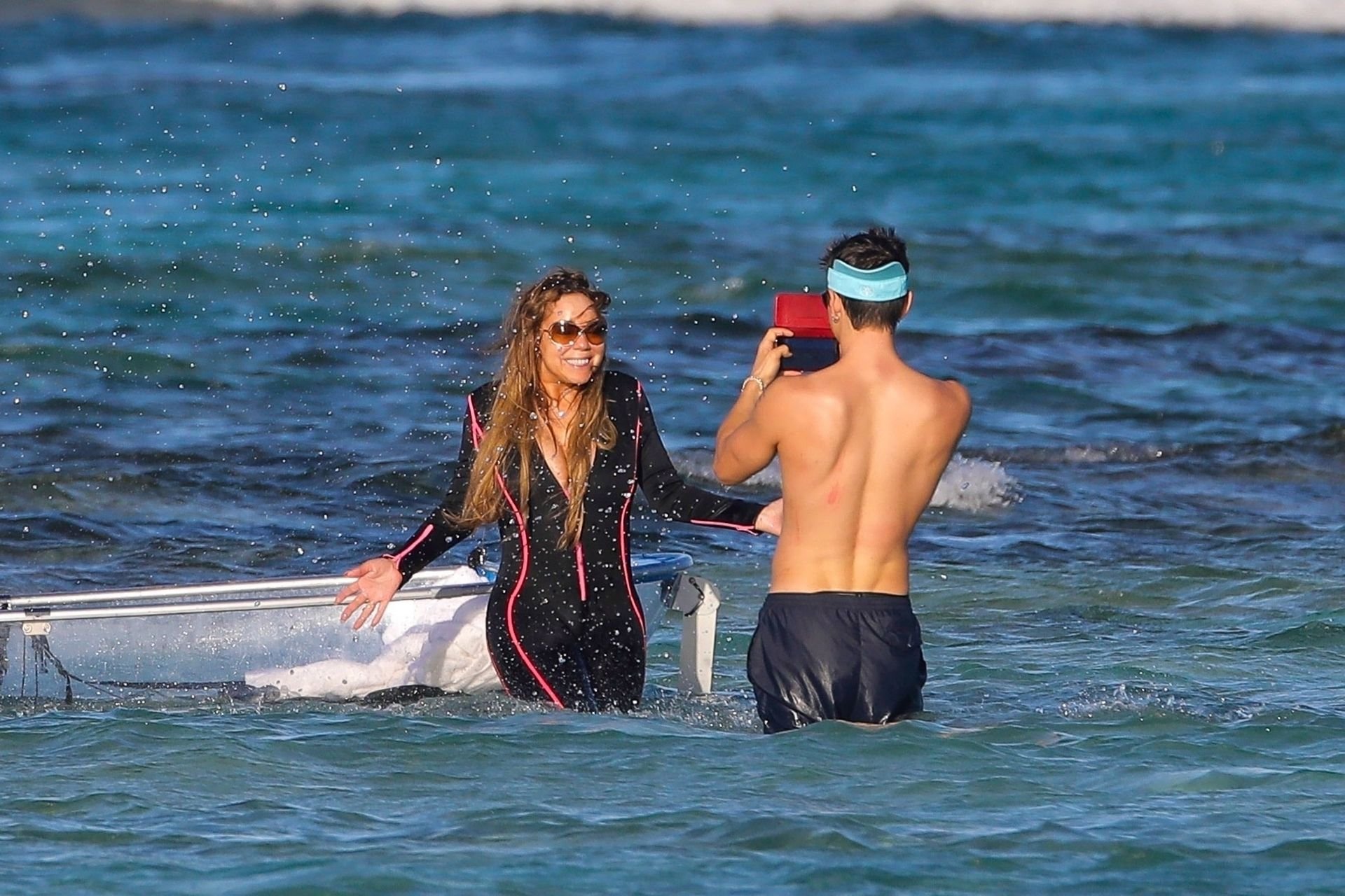 Mariah Carey (48) y Bryan Tanaka (35) se toman algunas selfies mientras disfrutan del cálido sol en familia en la Laguna Grand Cul de Sac en St. Barth, con los dos hijos de Mariah, Moroccan y Monroe, 01/03/2019. Mariah aparece sin maquillaje con un traje de neopreno negro mientras se relaja en un barco con fondo transparente.