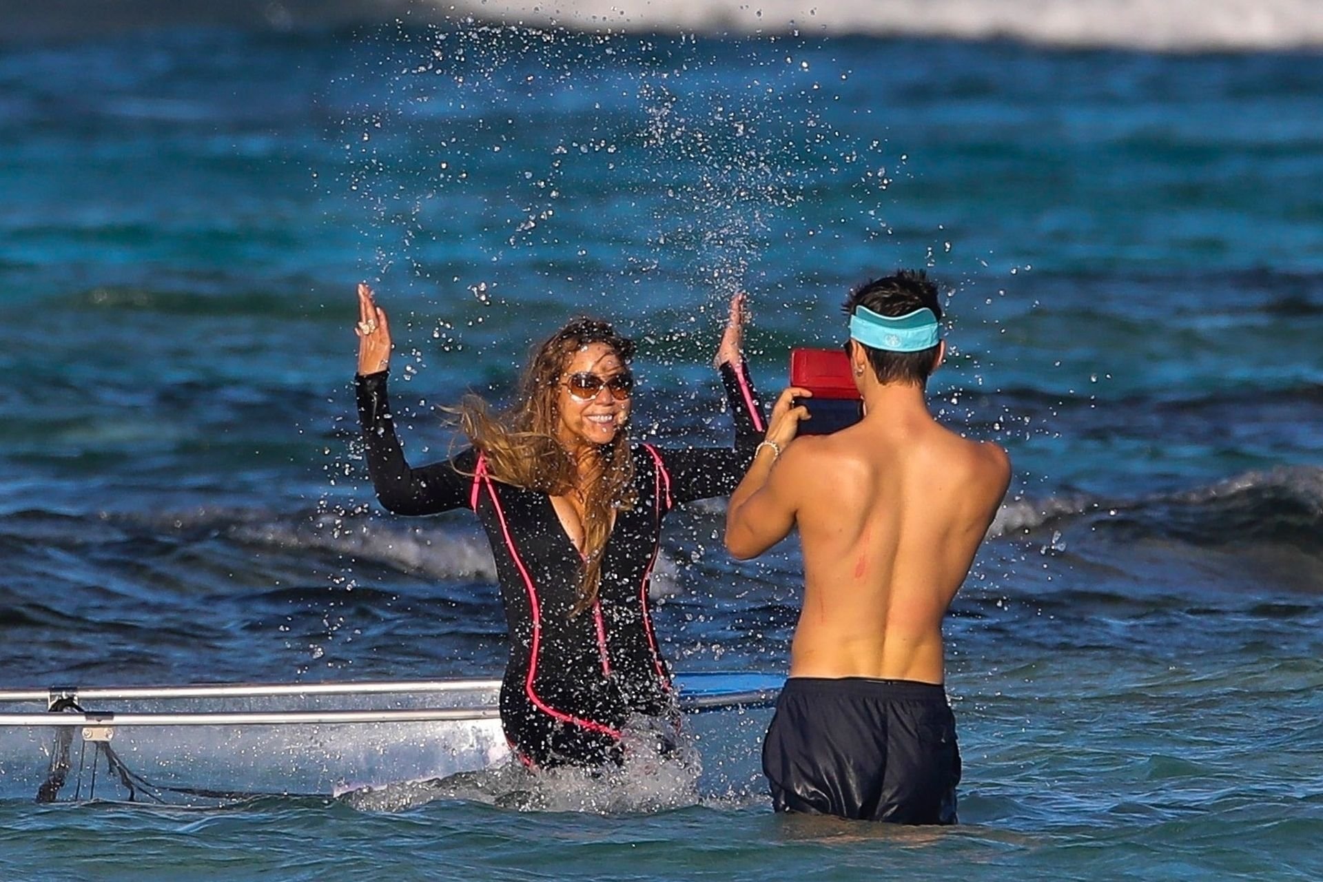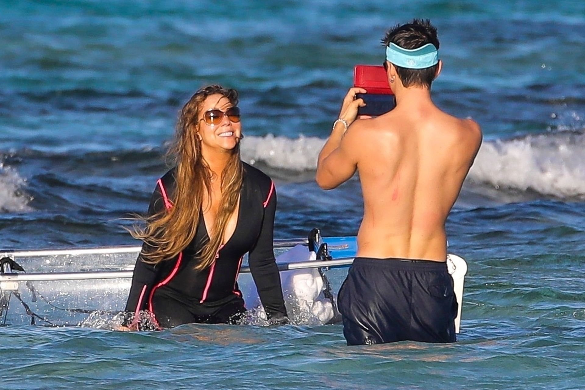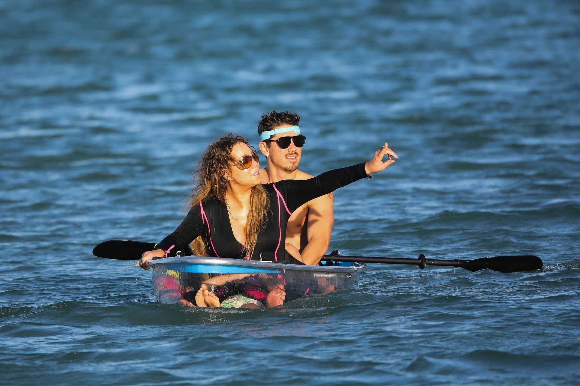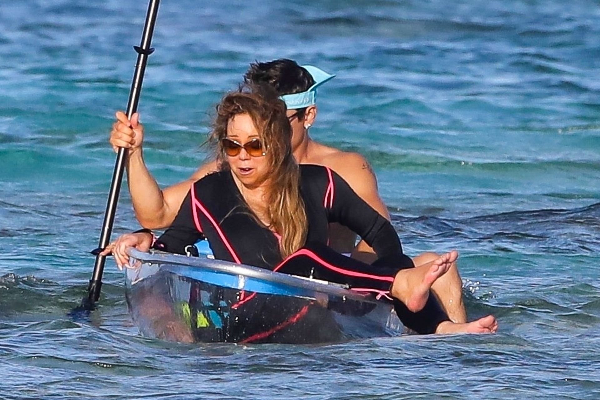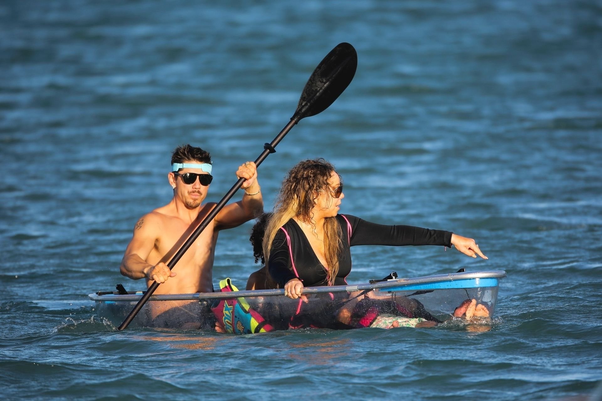Mariah Carey (48) y Bryan Tanaka (35) se toman algunas selfies mientras disfrutan del cálido sol en familia en la Laguna Grand Cul de Sac en St. Barth, con los dos hijos de Mariah, Moroccan y Monroe, 01/03/2019. Mariah aparece sin maquillaje con un traje de neopreno negro mientras se relaja en un barco con fondo transparente.