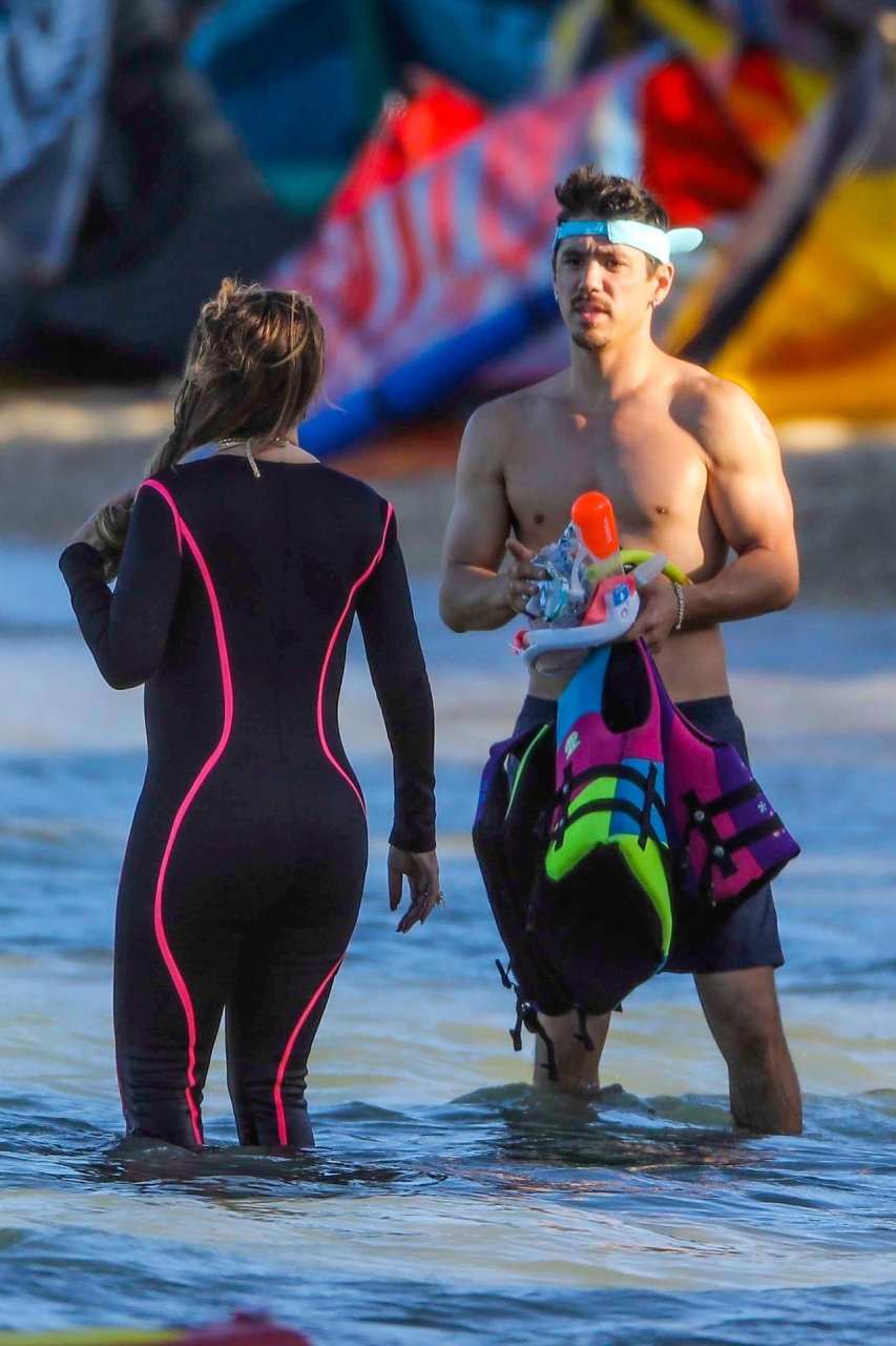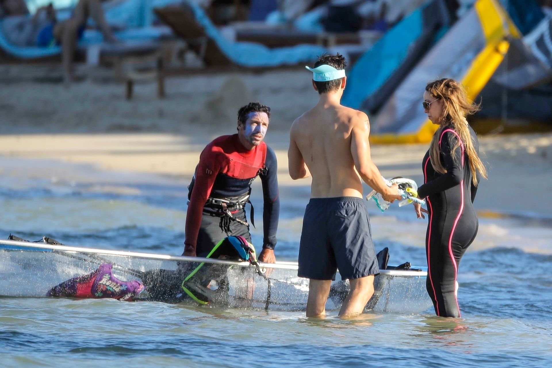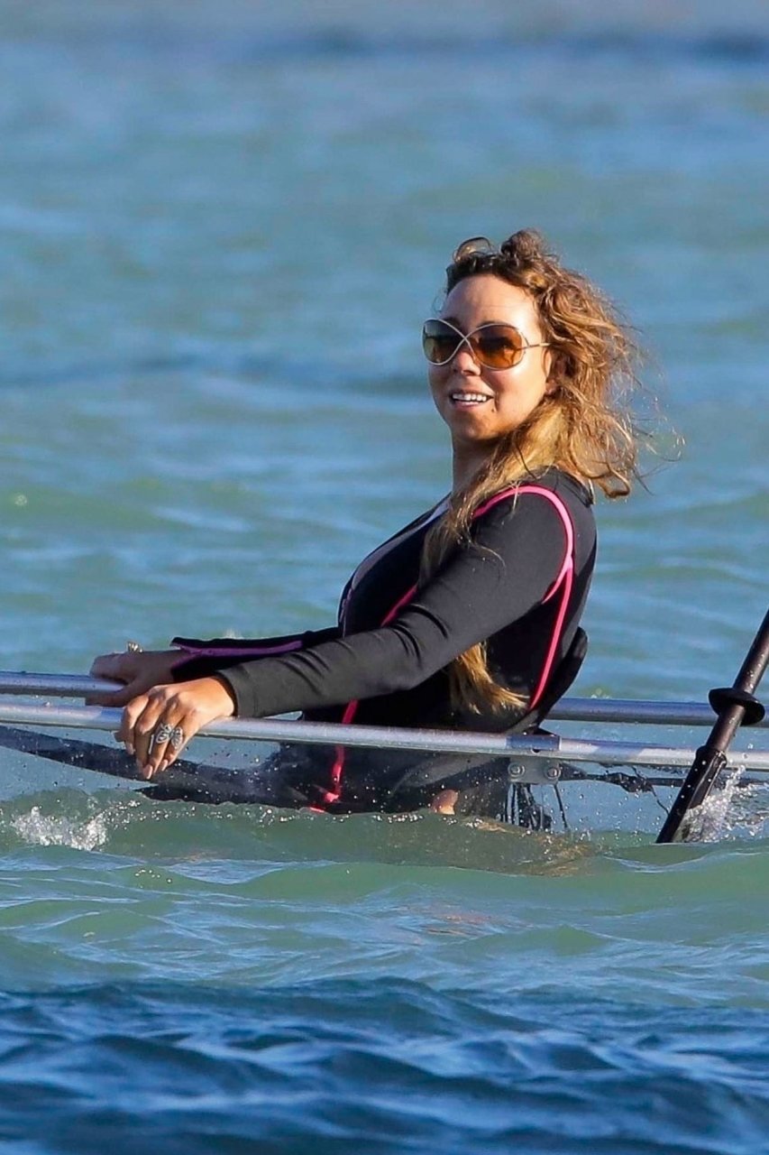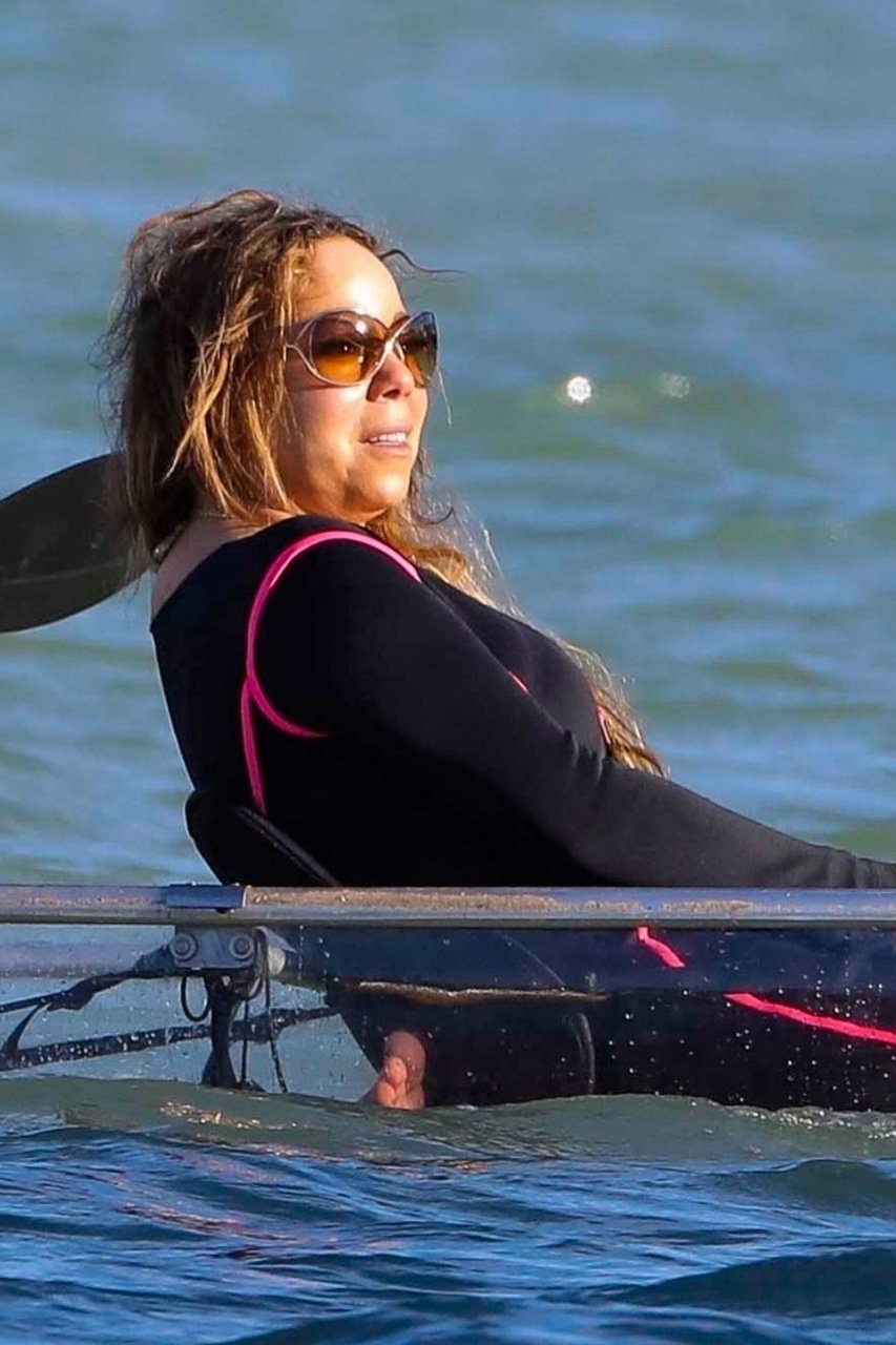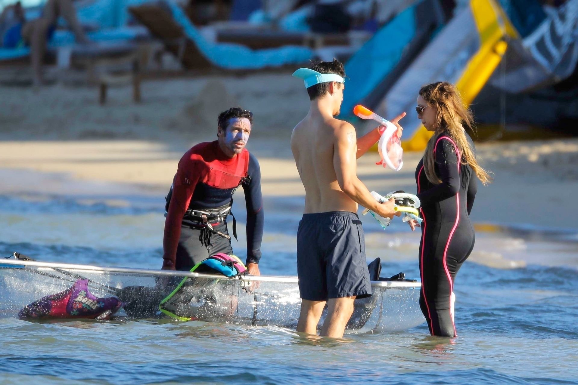 Mariah Carey (48) y Bryan Tanaka (35) se toman algunas selfies mientras disfrutan del cálido sol en familia en la Laguna Grand Cul de Sac en St. Barth, con los dos hijos de Mariah, Moroccan y Monroe, 01/03/2019. Mariah aparece sin maquillaje con un traje de neopreno negro mientras se relaja en un barco con fondo transparente.