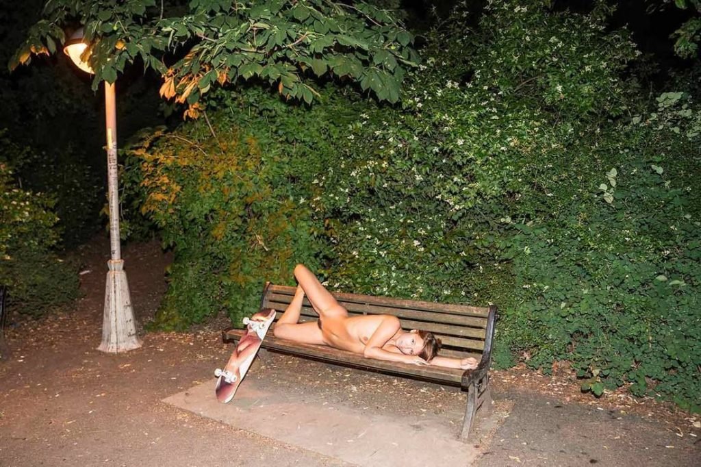Marisa Papen presenta su nueva colaboración con Spleen Wear (julio 2018). La modelo desnuda fue fotografiada por Mike Steegmans para camisetas y patinetas en los Estados Unidos.