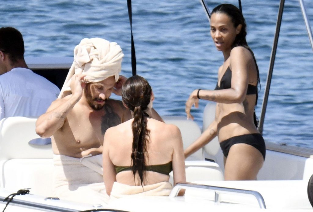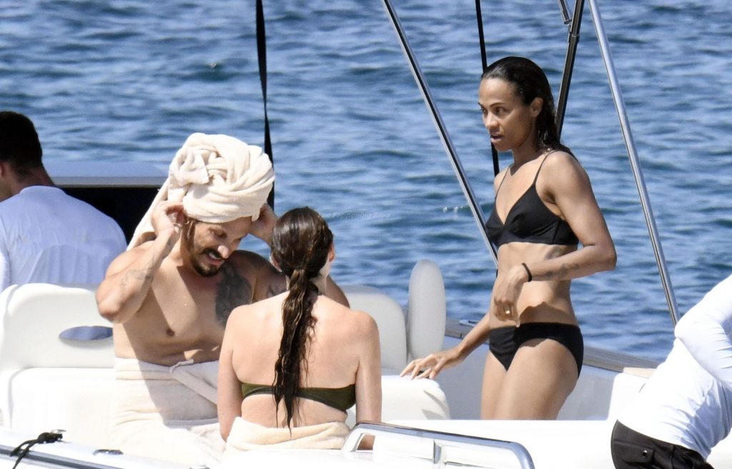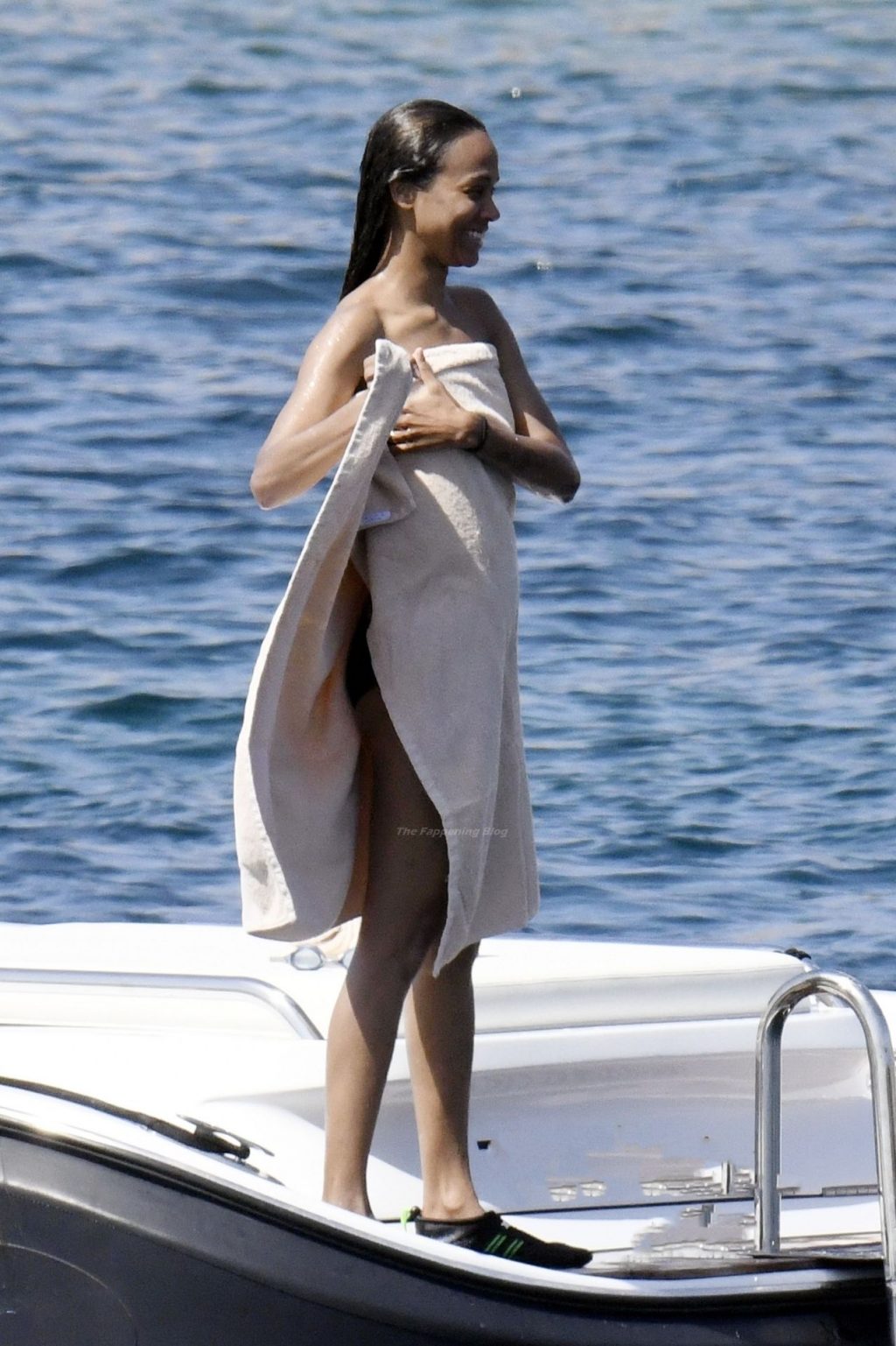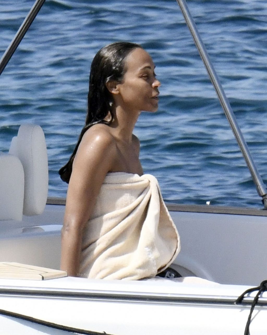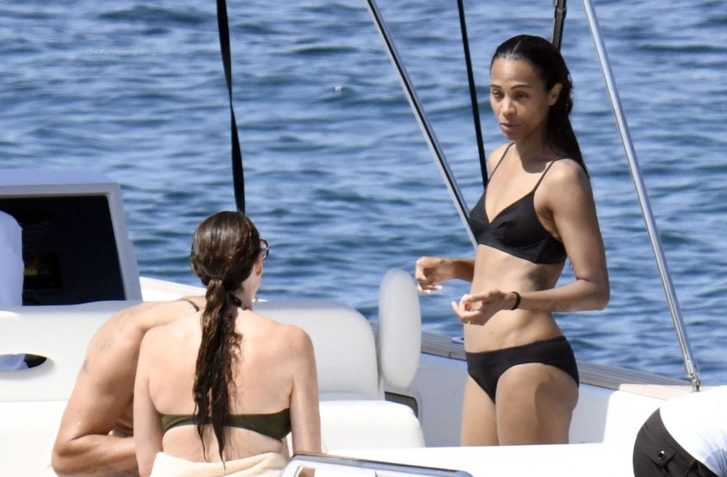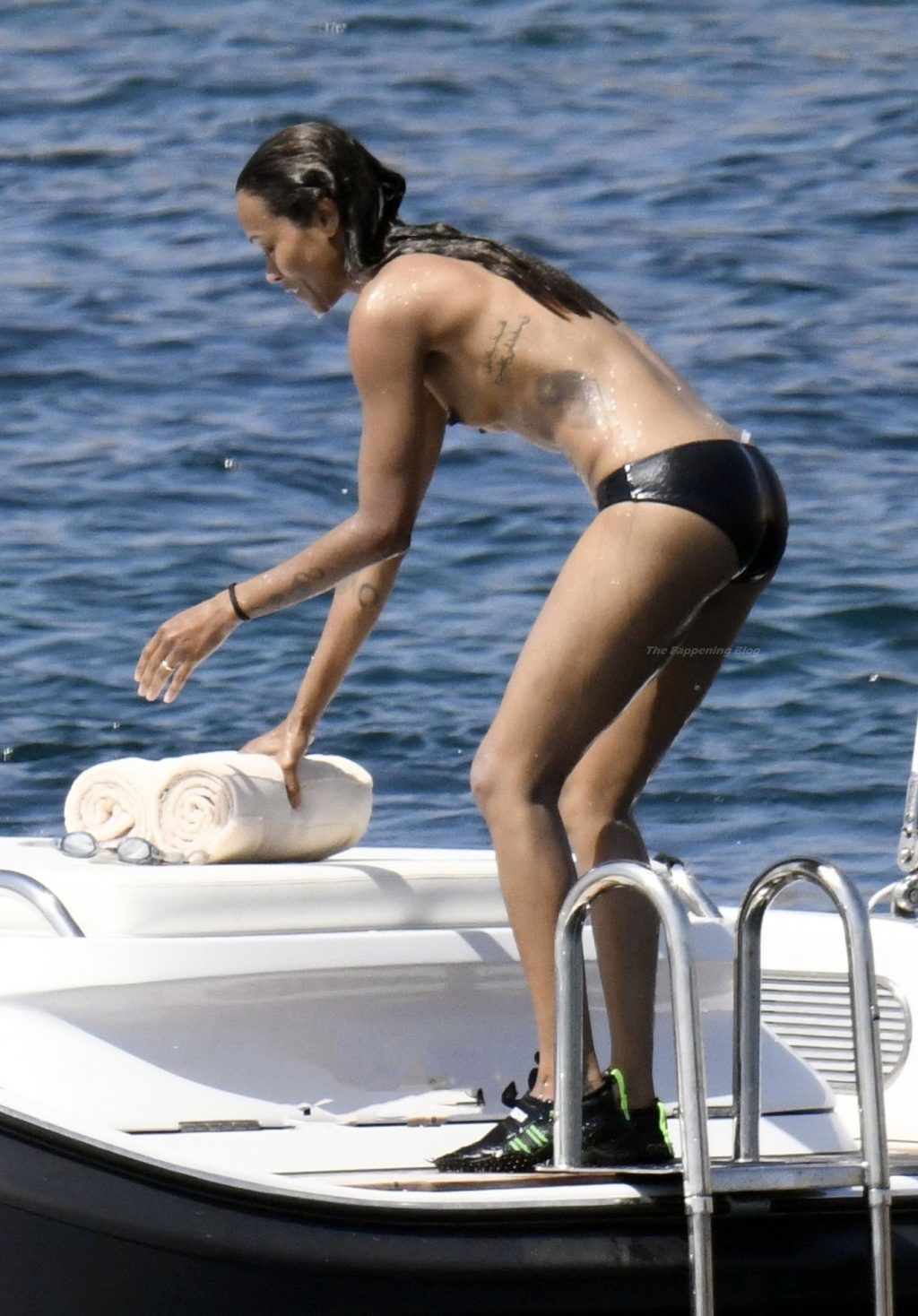 La sexy actriz estadounidense Zoe Saldana se quita la parte superior bajo el intenso sol italiano durante sus vacaciones bañadas por el sol en Cerdeña, 15/08/2021.